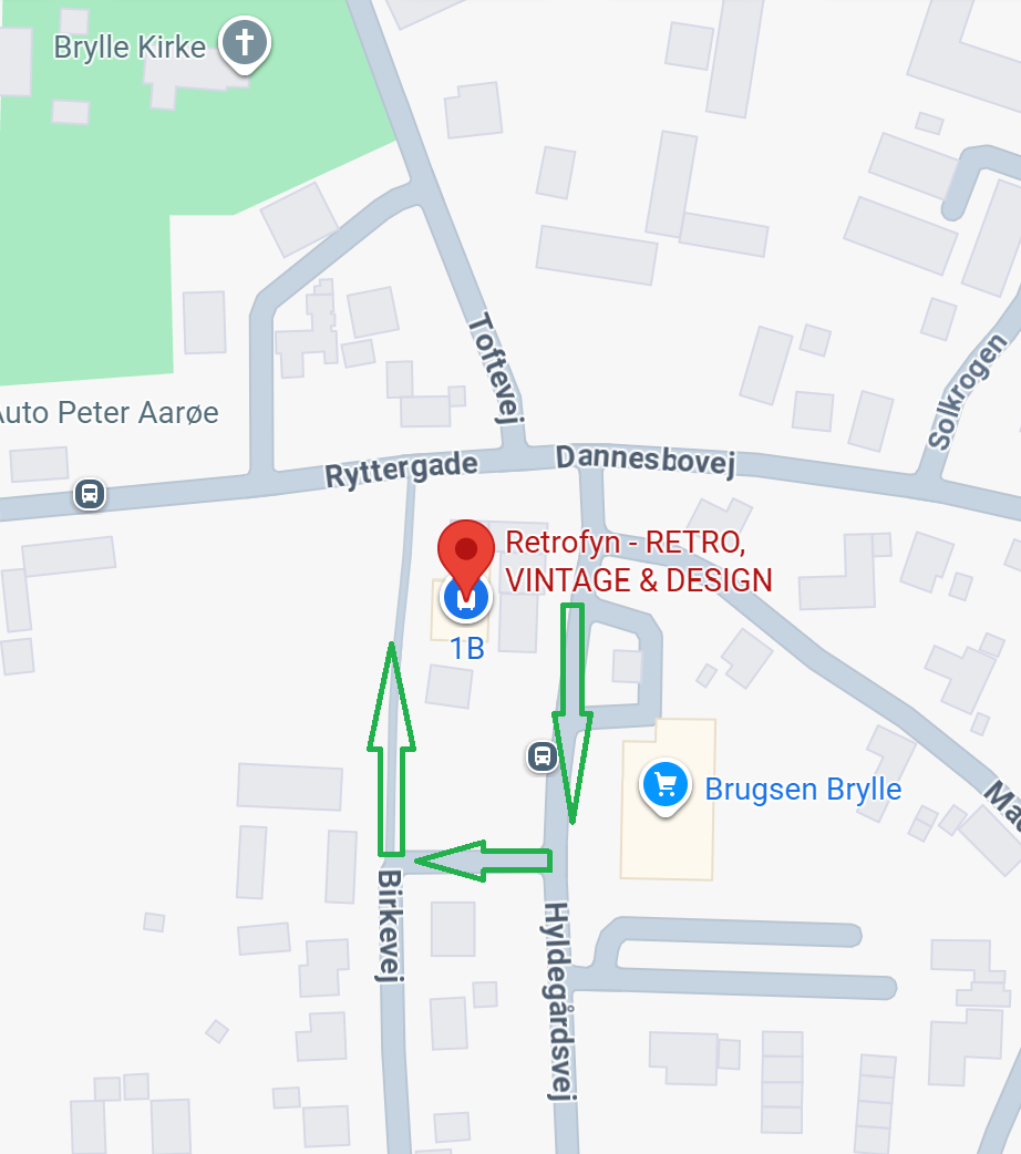Butikken ligger på en blind vej, og der er parkering lige ved døren. Vejen til butikken er vist med pile på billedet her.