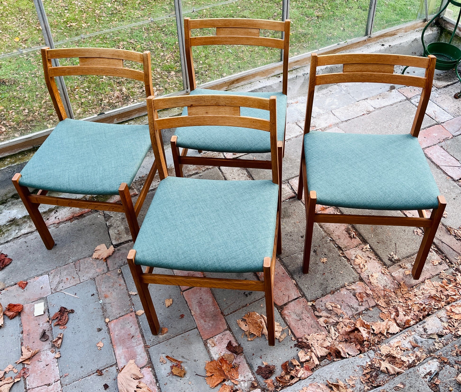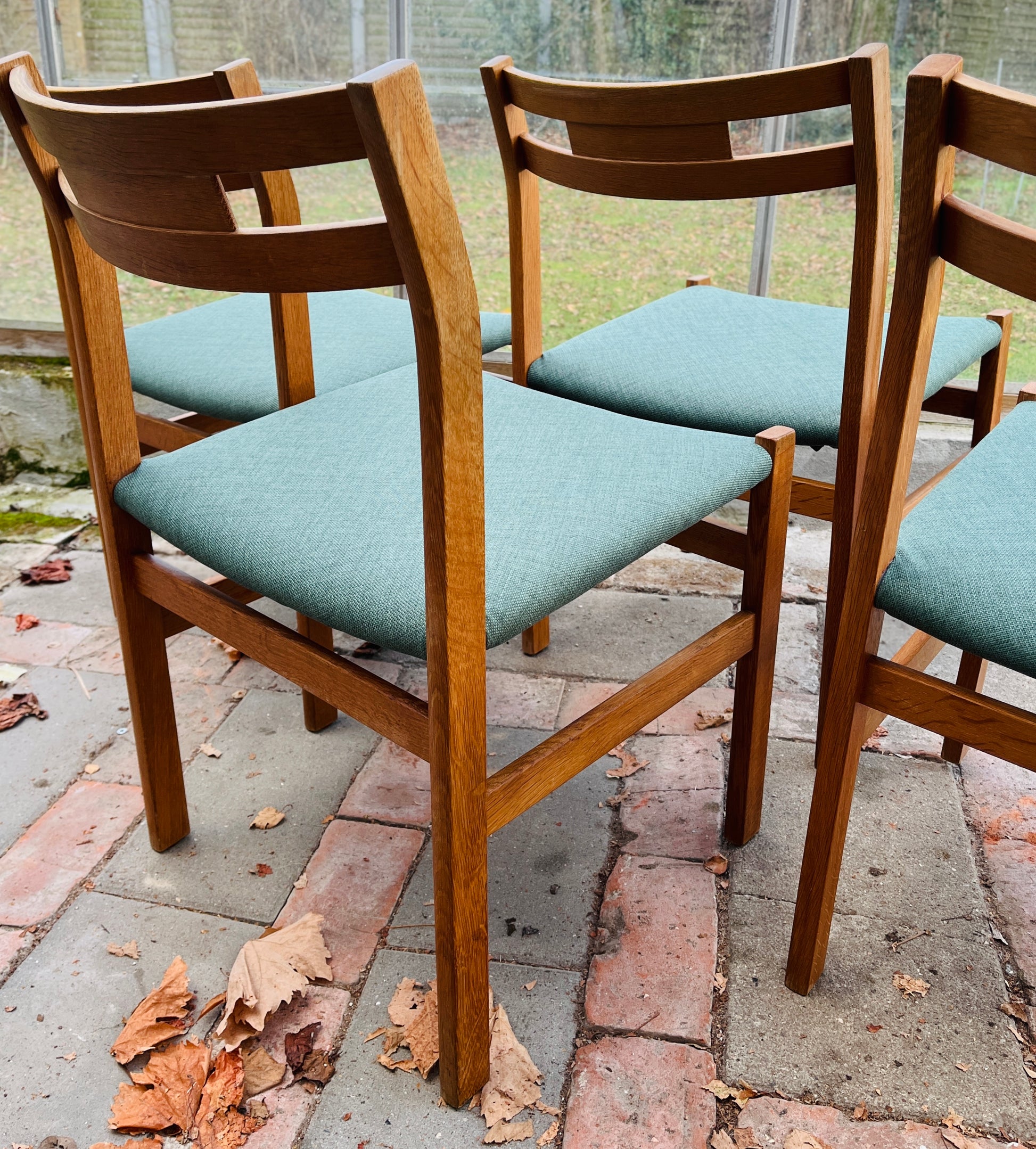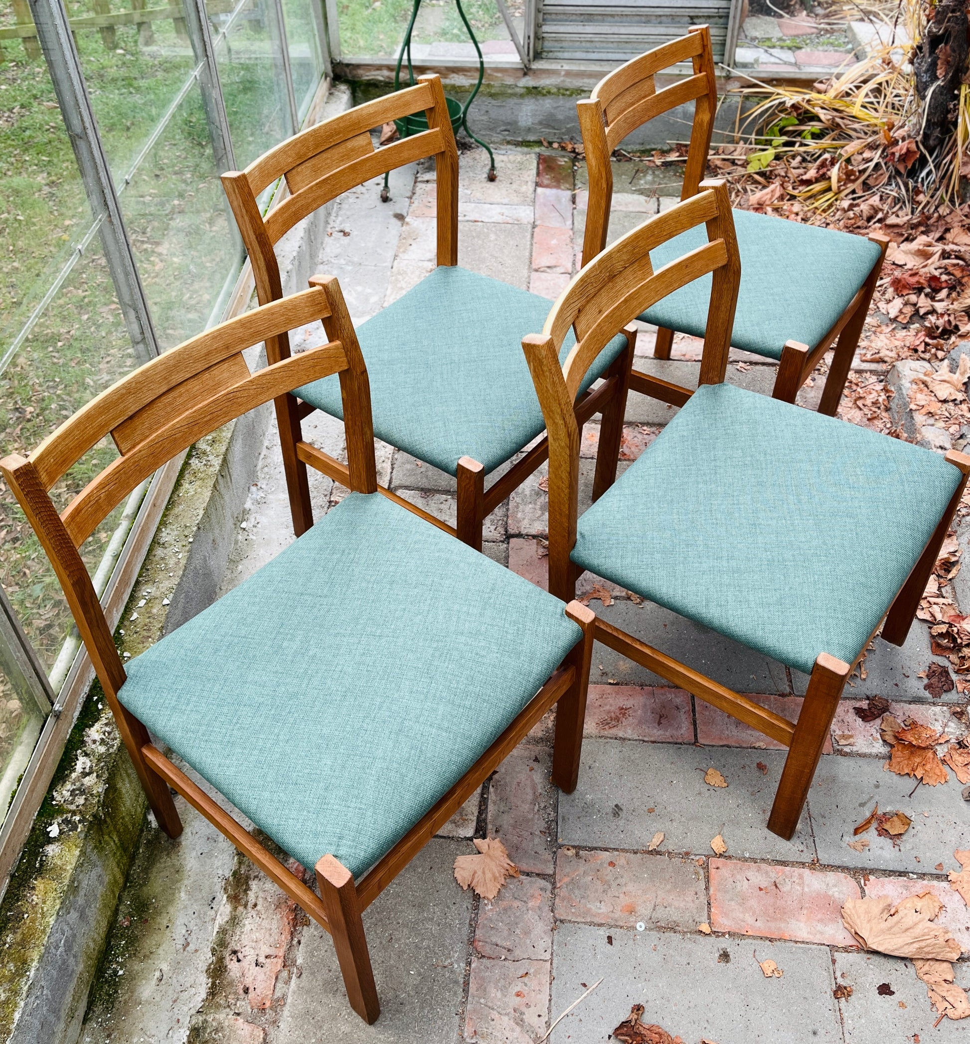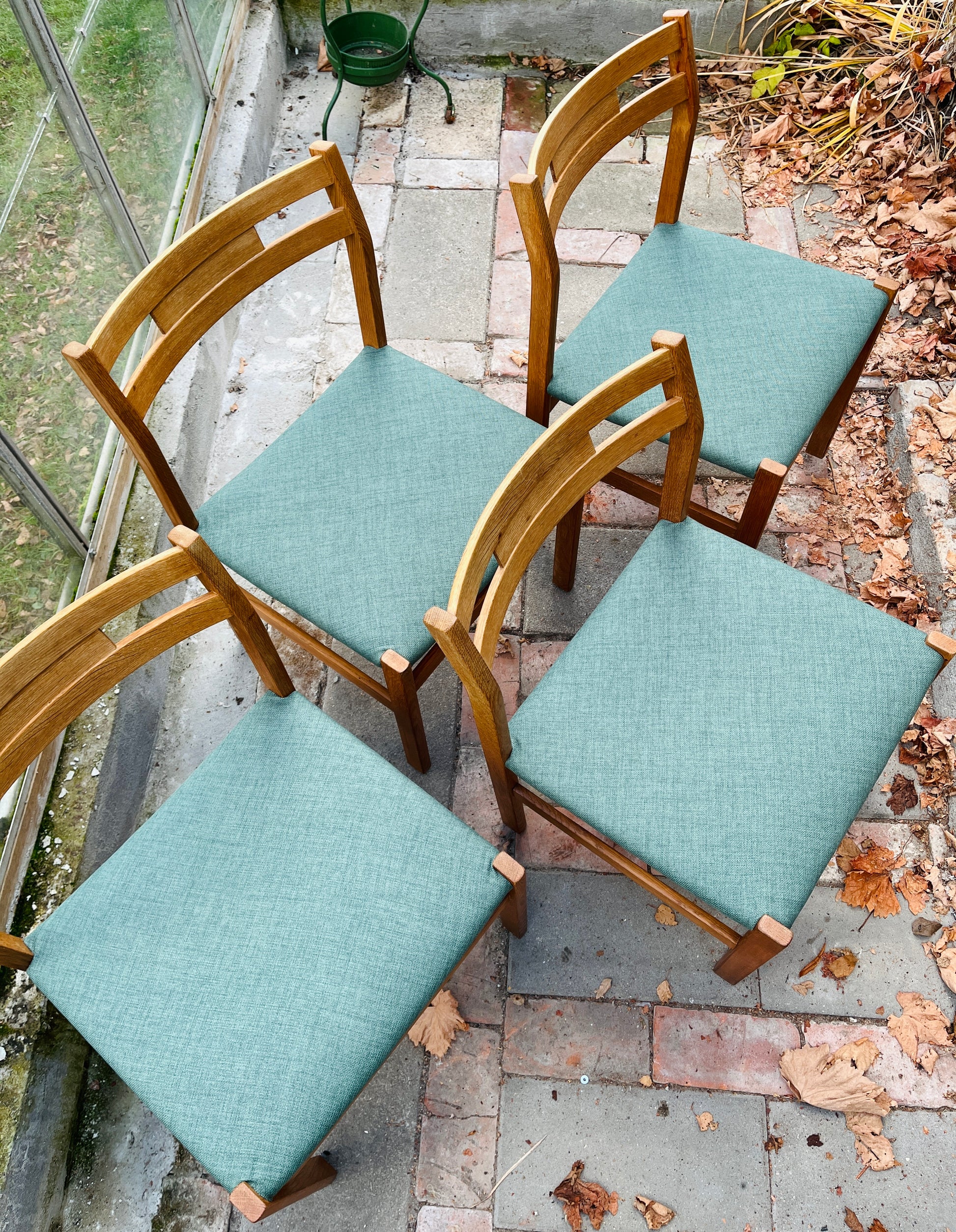 Sæt på 4 smukke retro spisebordsstole i eg. Stolerne har fået nyt betræk i en flot turkis nuance og er i god vintage stand – både stabile og komfortable.