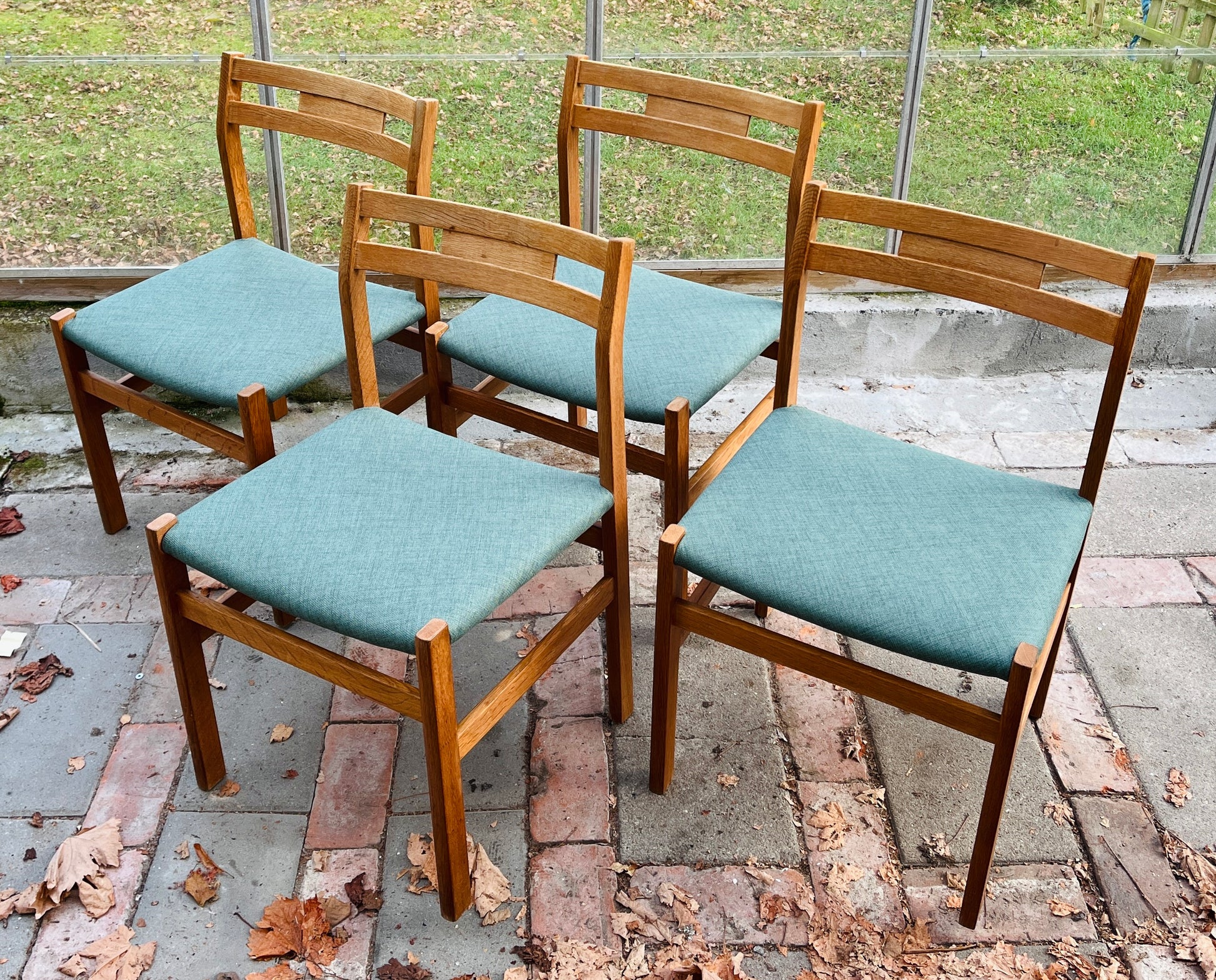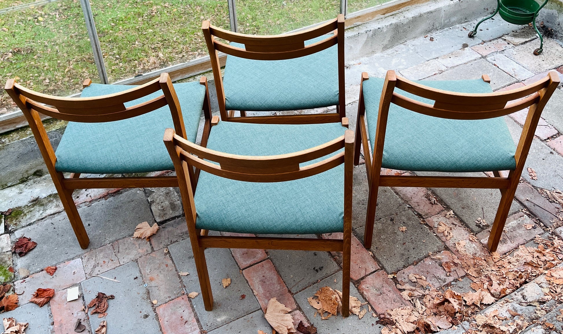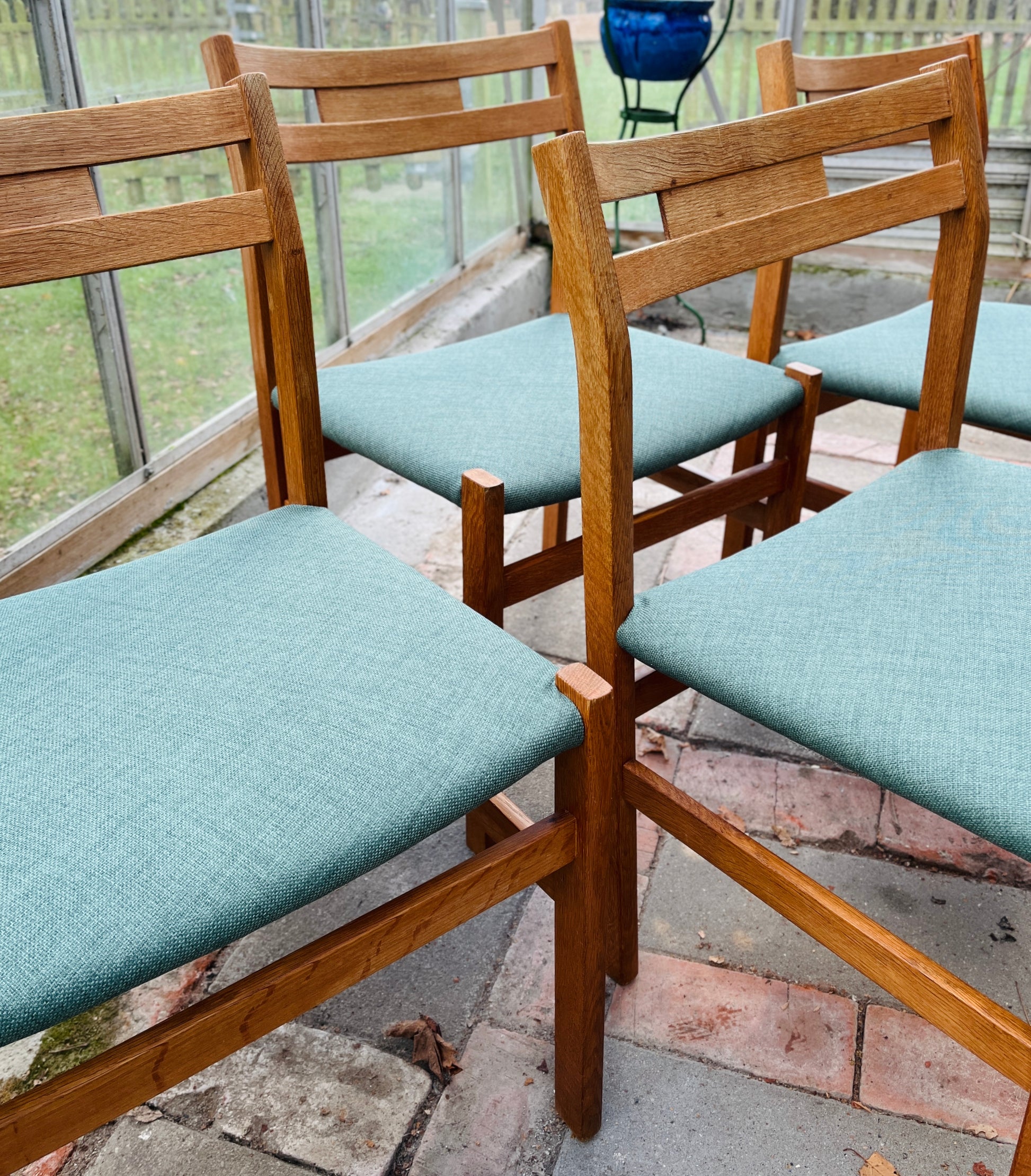 Sæt på 4 smukke retro spisebordsstole i eg. Stolerne har fået nyt betræk i en flot turkis nuance og er i god vintage stand – både stabile og komfortable.