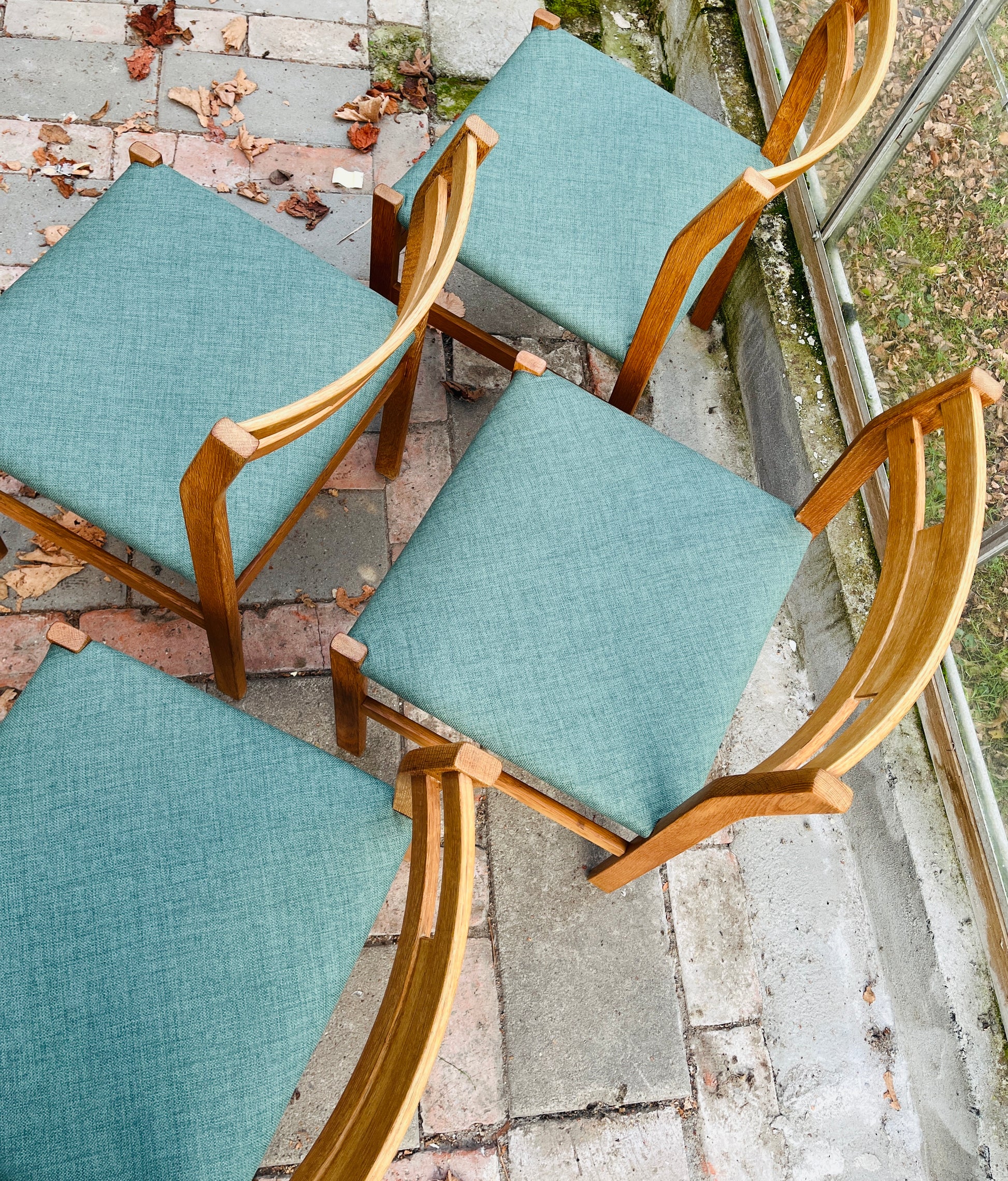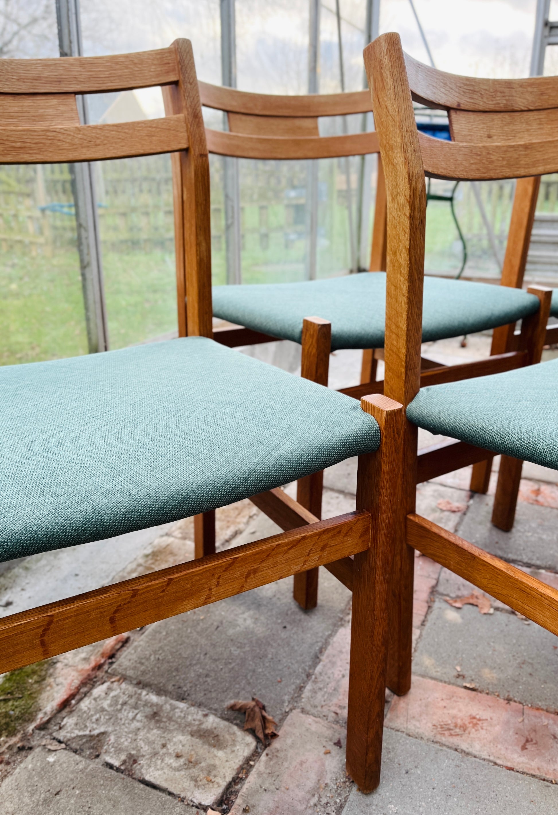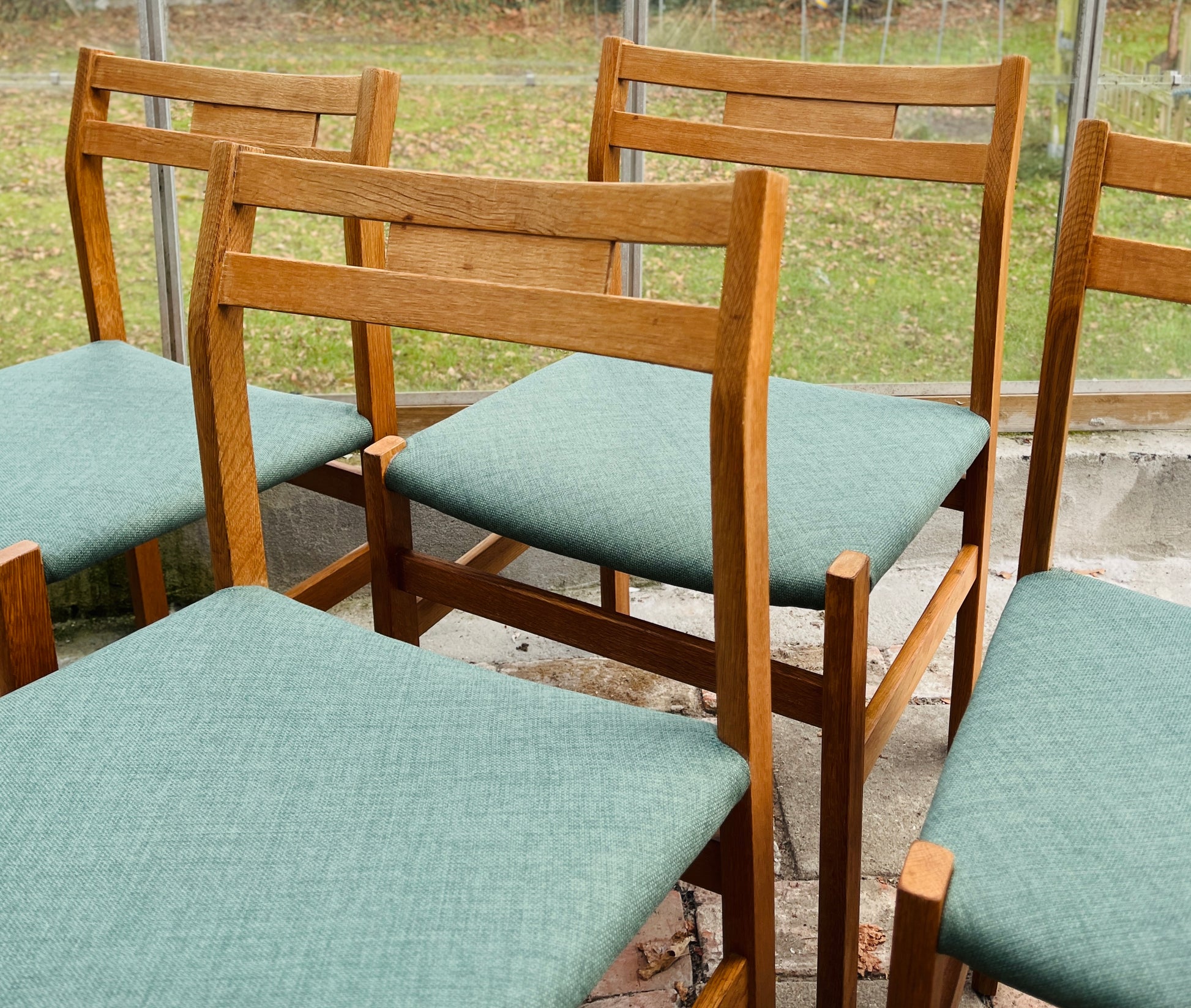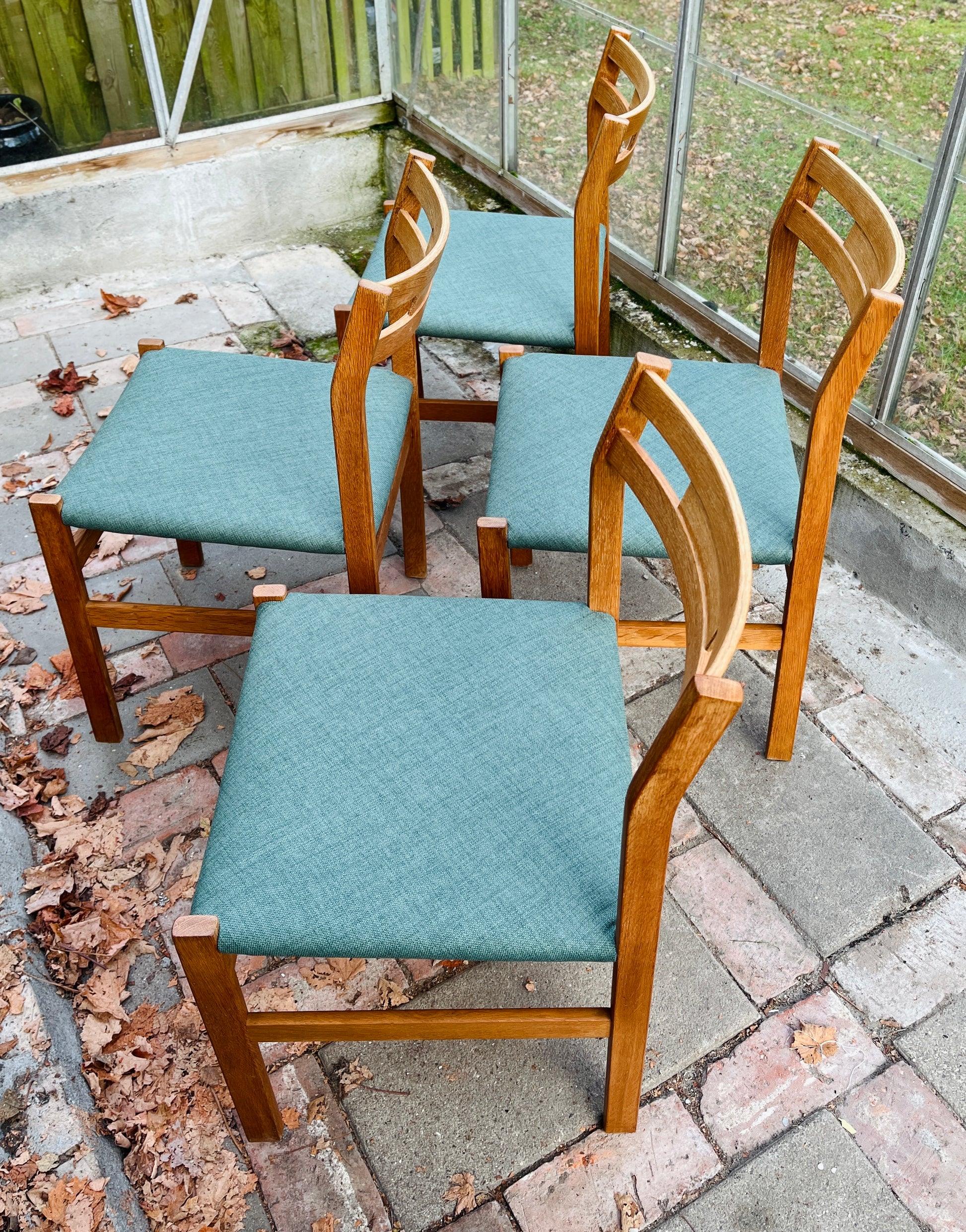 Sæt på 4 smukke retro spisebordsstole i eg. Stolerne har fået nyt betræk i en flot turkis nuance og er i god vintage stand – både stabile og komfortable.