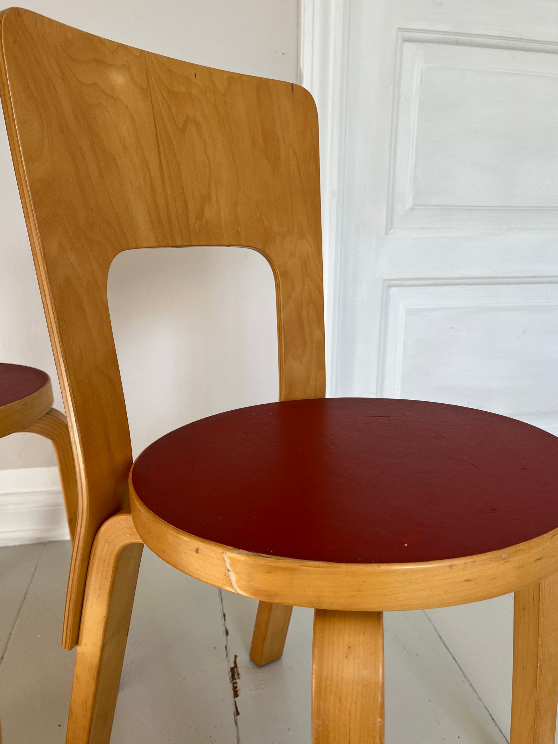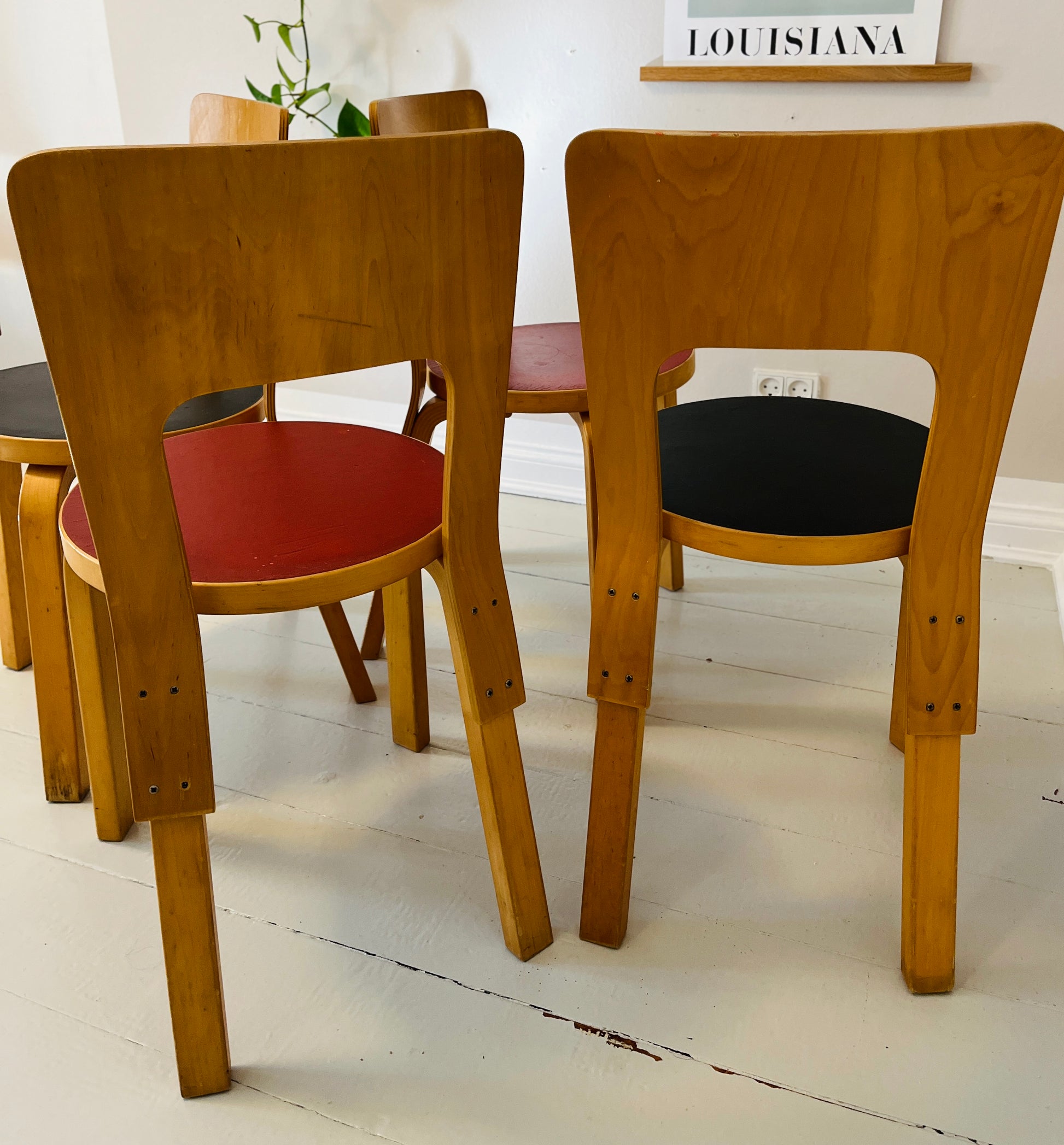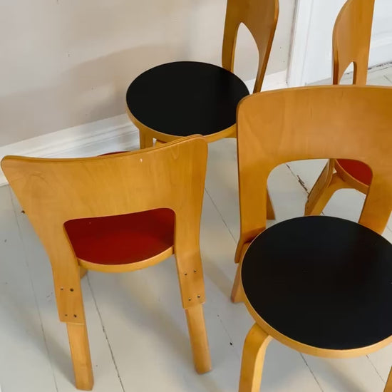 Klassiske Alvar Aalto stole, model 66, designet i 1935 og produceret hos Artek. Et ikonisk eksempel på Aaltos organiske formsprog med det bukkede birkestel og farvede sæder – her i en smuk kombination af to med sort og to med rødt sæde.