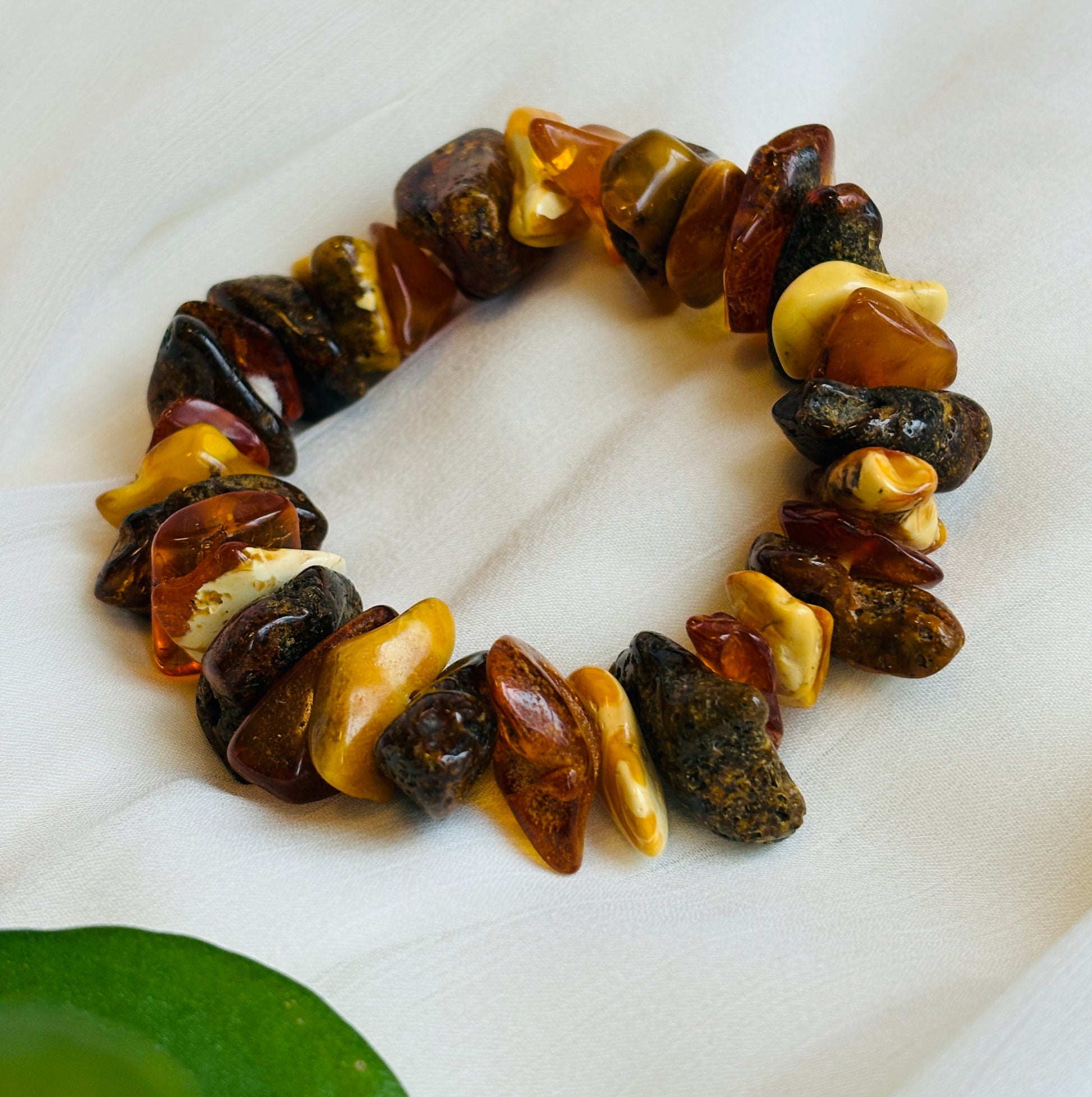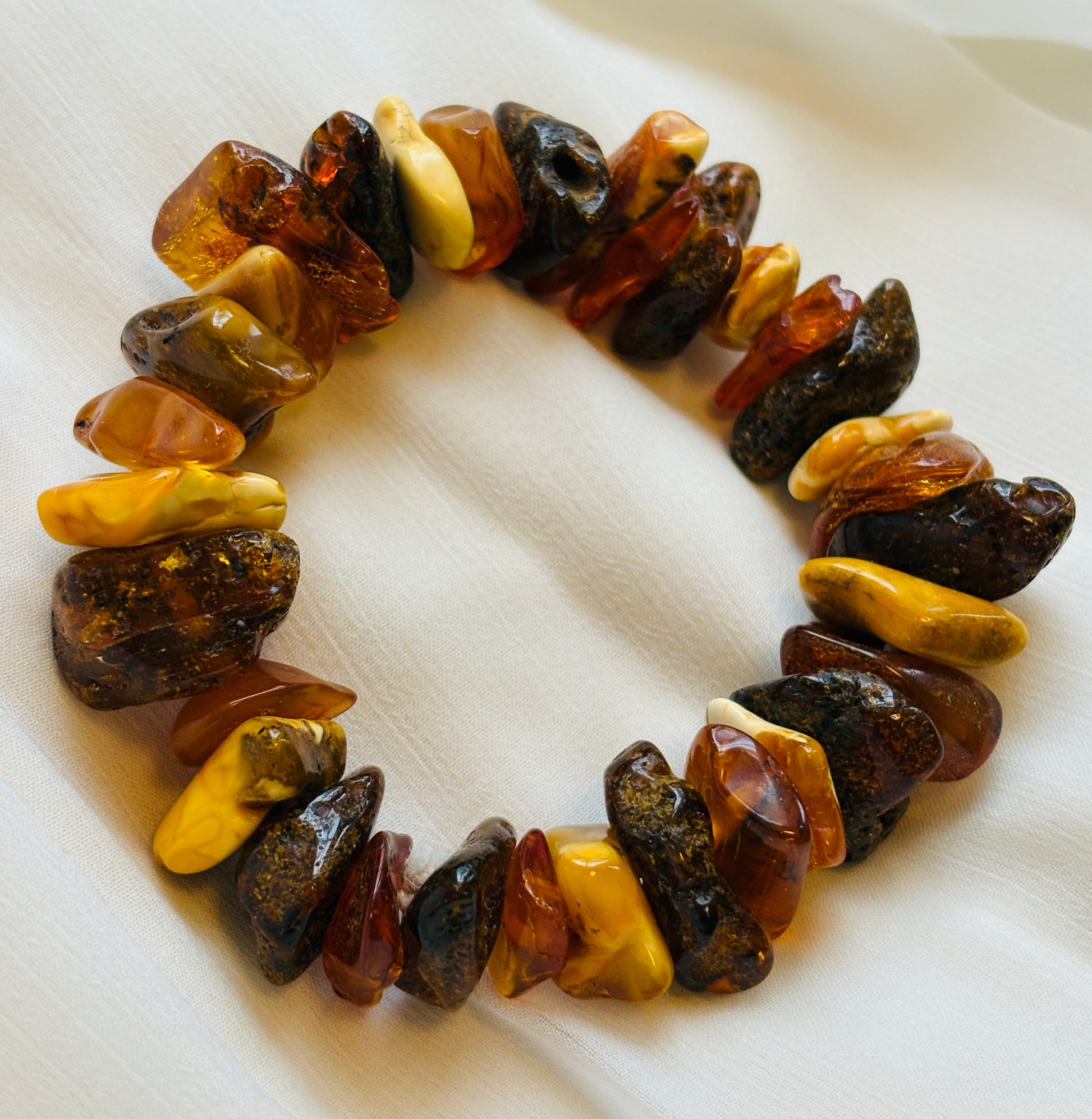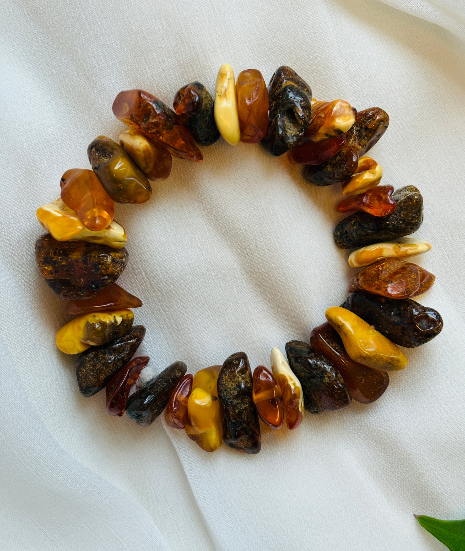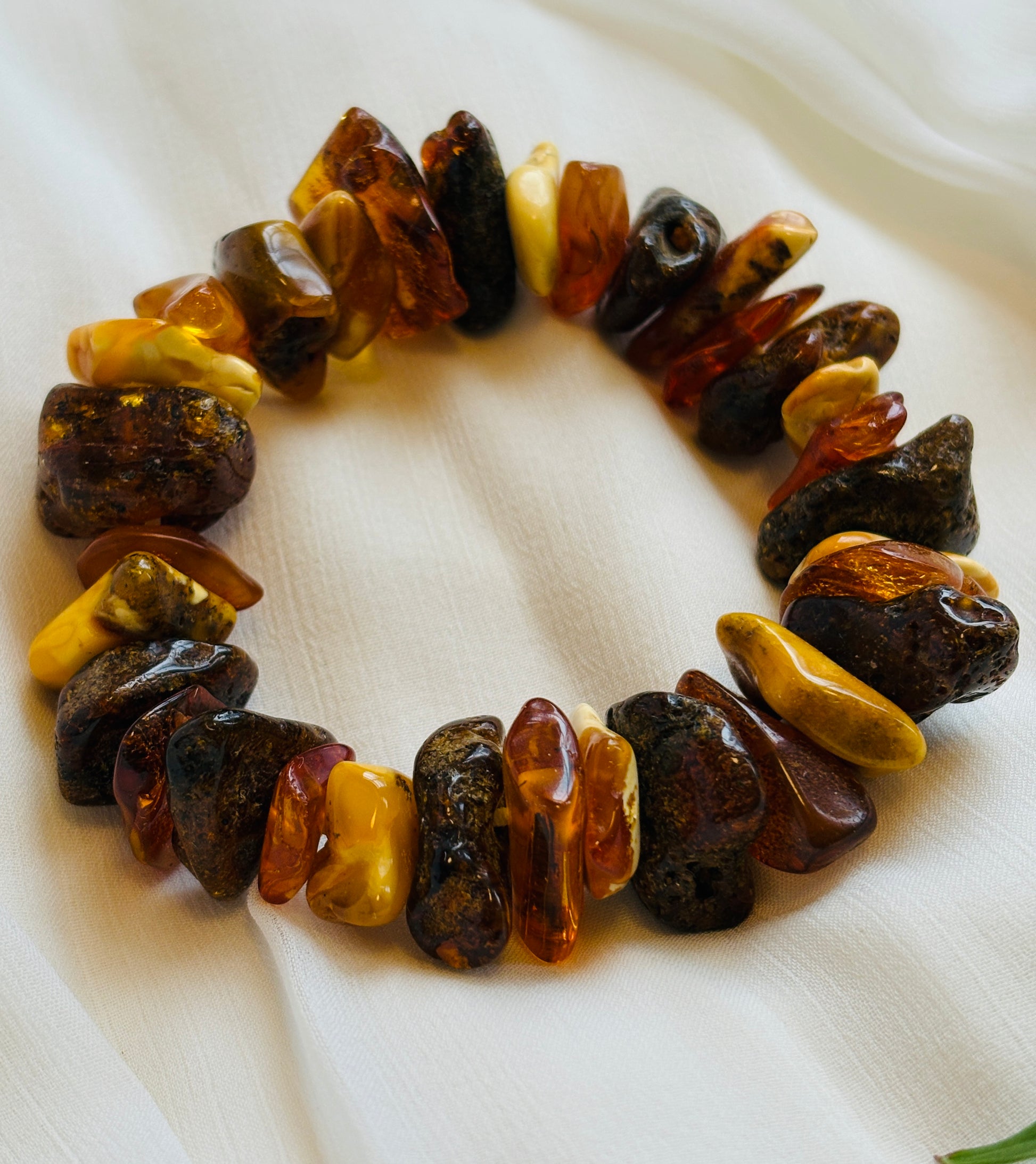 Farverigt og naturligt armbånd i rå, ubehandlet rav på elastik. Armbåndet har en indvendig diameter på ca. 50 mm og det vejer 36 g. De forskellige ravfarver giver et levende, unikt udtryk – ingen armbånd er helt ens. Elastikken gør det nemt at tage på og behageligt at bære.