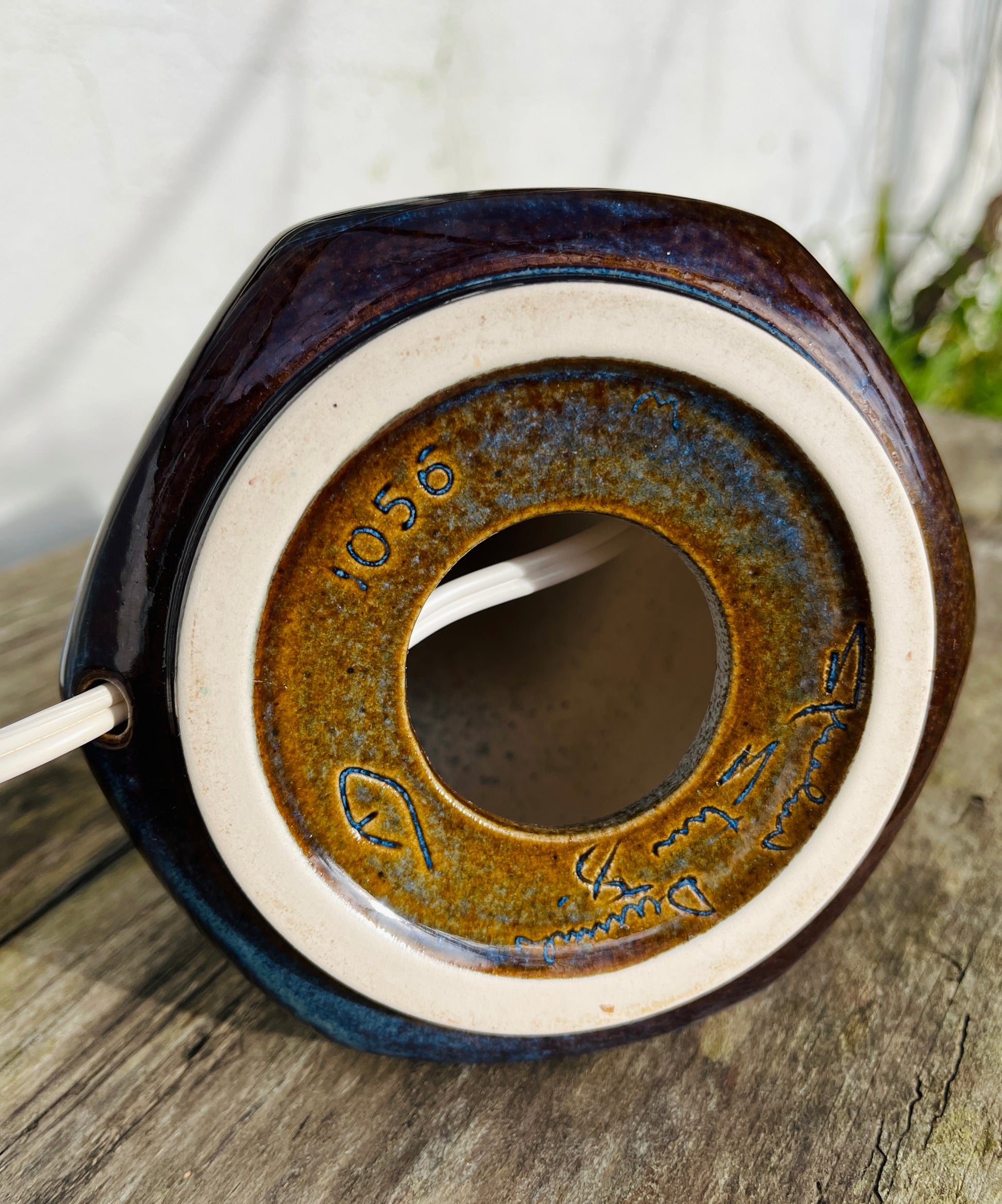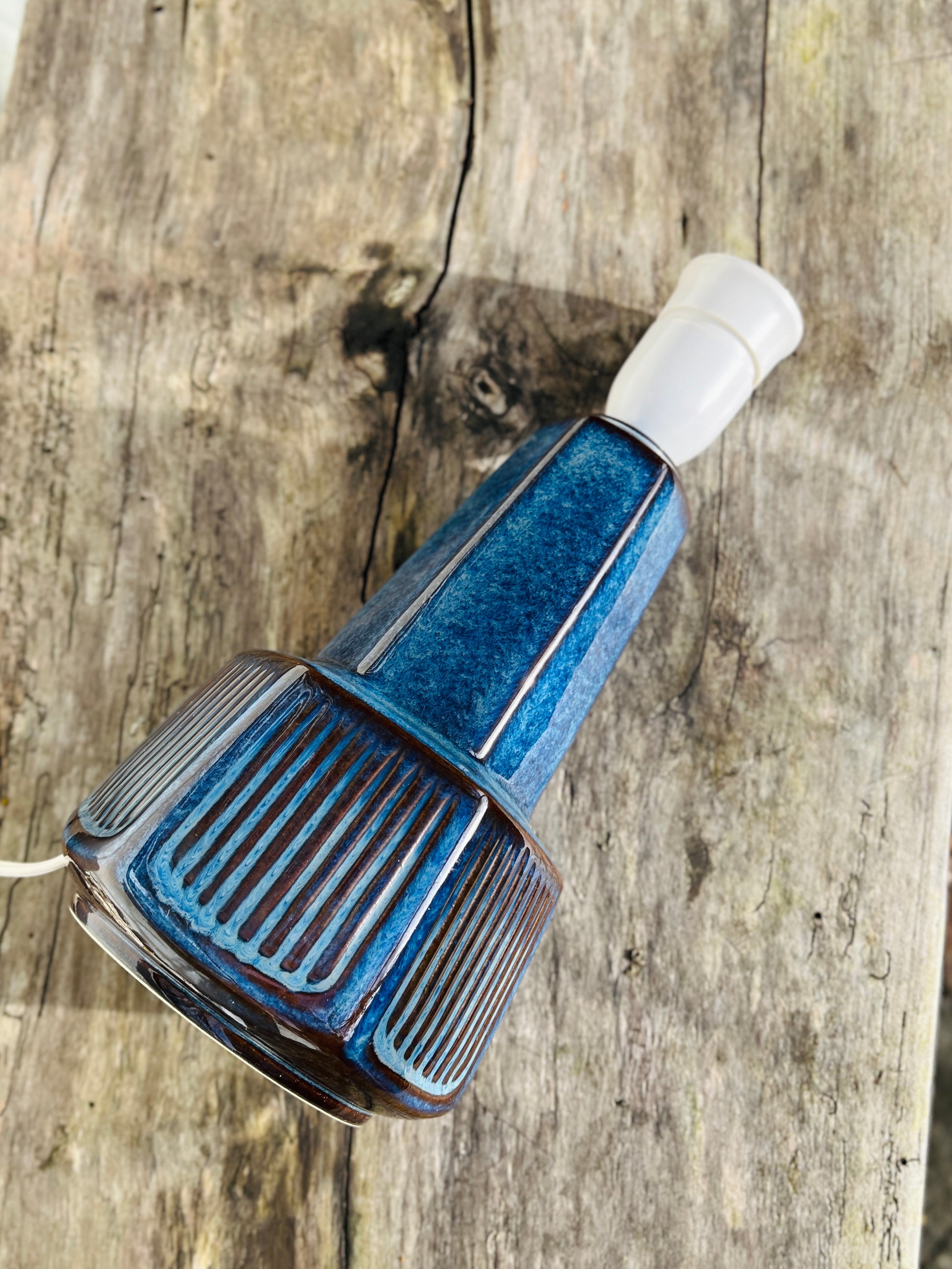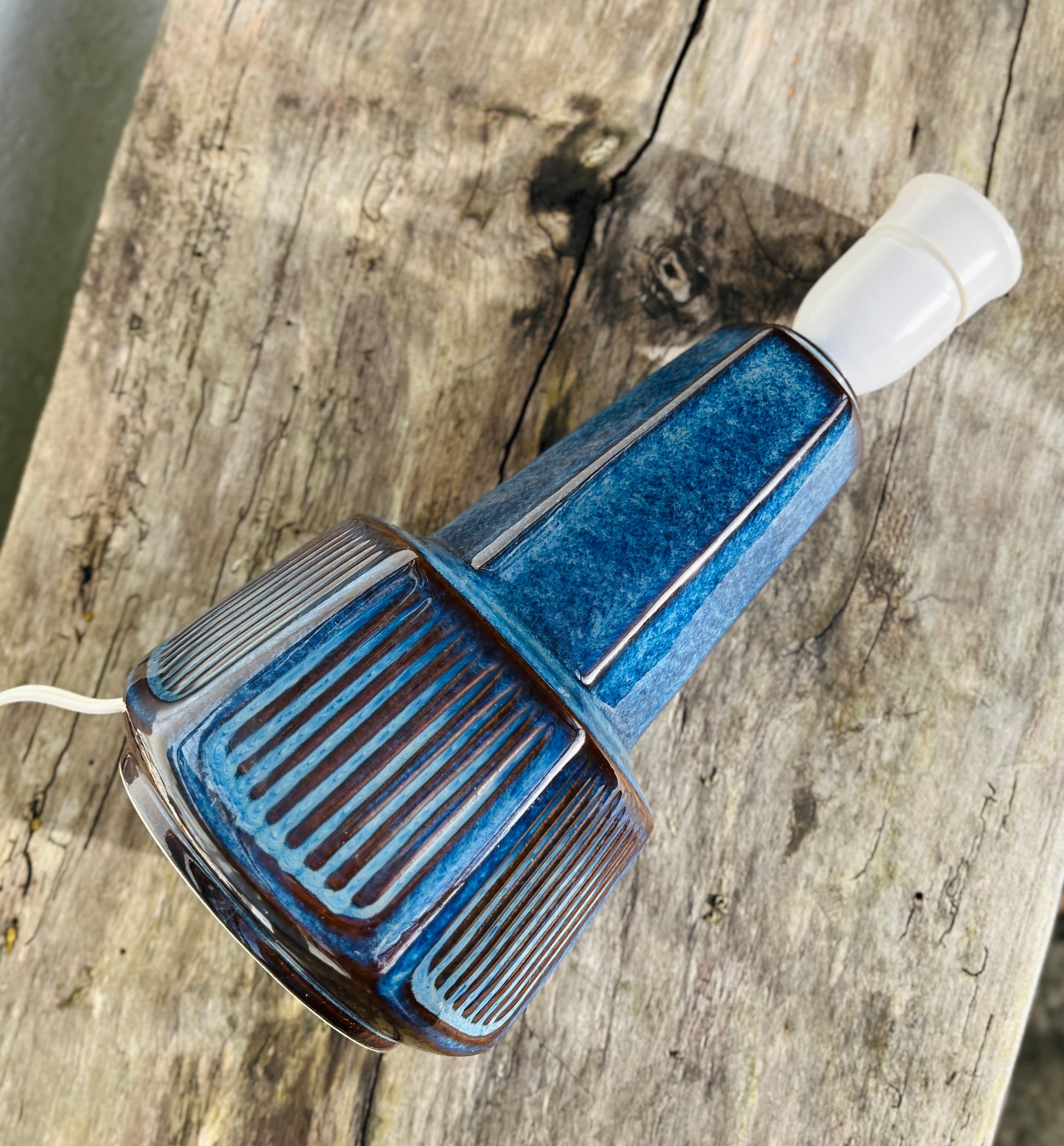 Søholm stentøjsbordlampe i hexagonal form, designet af Einar Johansen. Model 1056. Lampen har en smuk, blank indigoblå glasur med lyseblå highlights. Fra 1960’erne/70’erne.