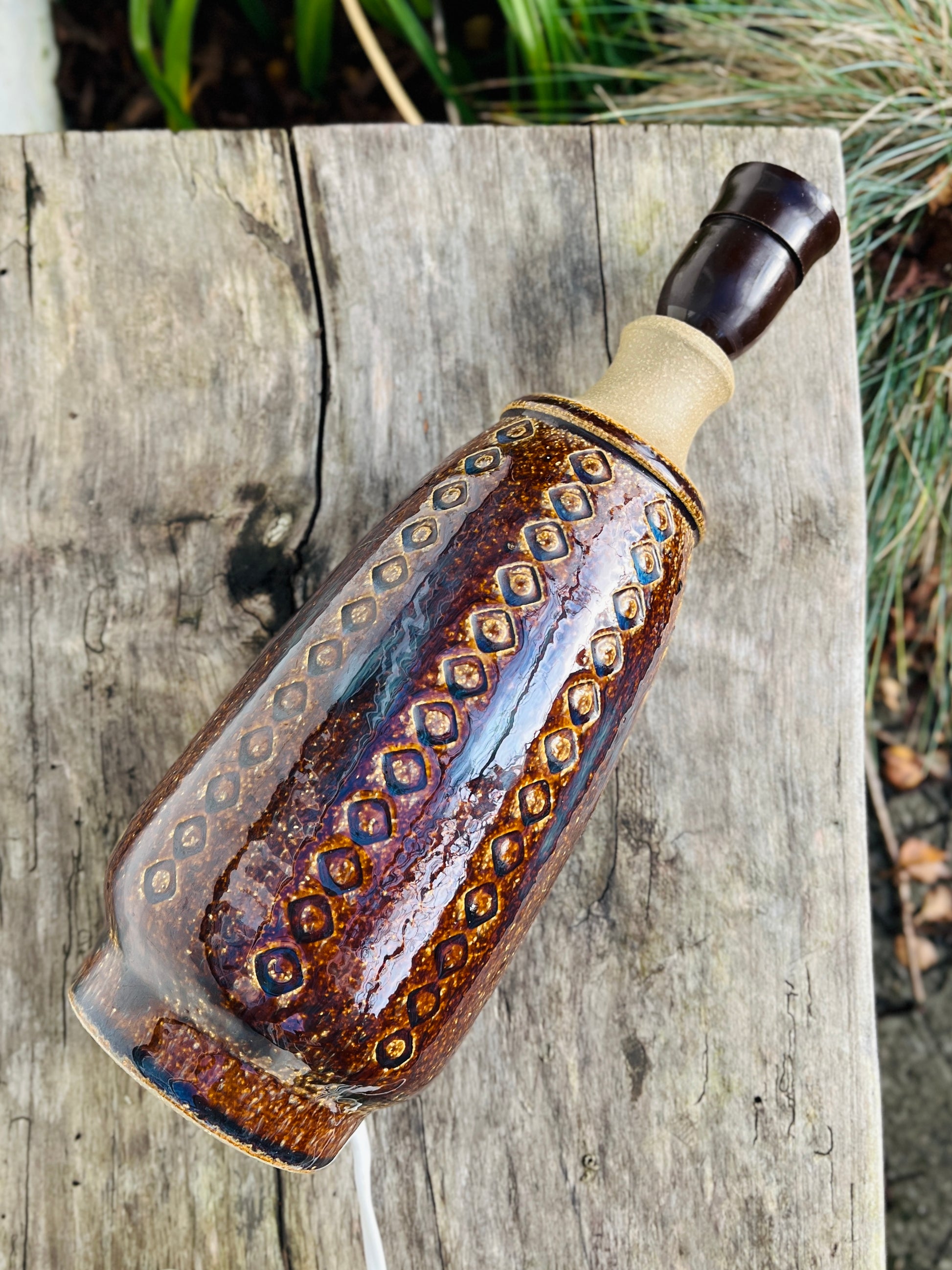 En bordlampe med et smukt mønster, der skaber en fantastisk effekt med den brune og blå glasur. Lampen er designet og signeret af Maria Philippi.