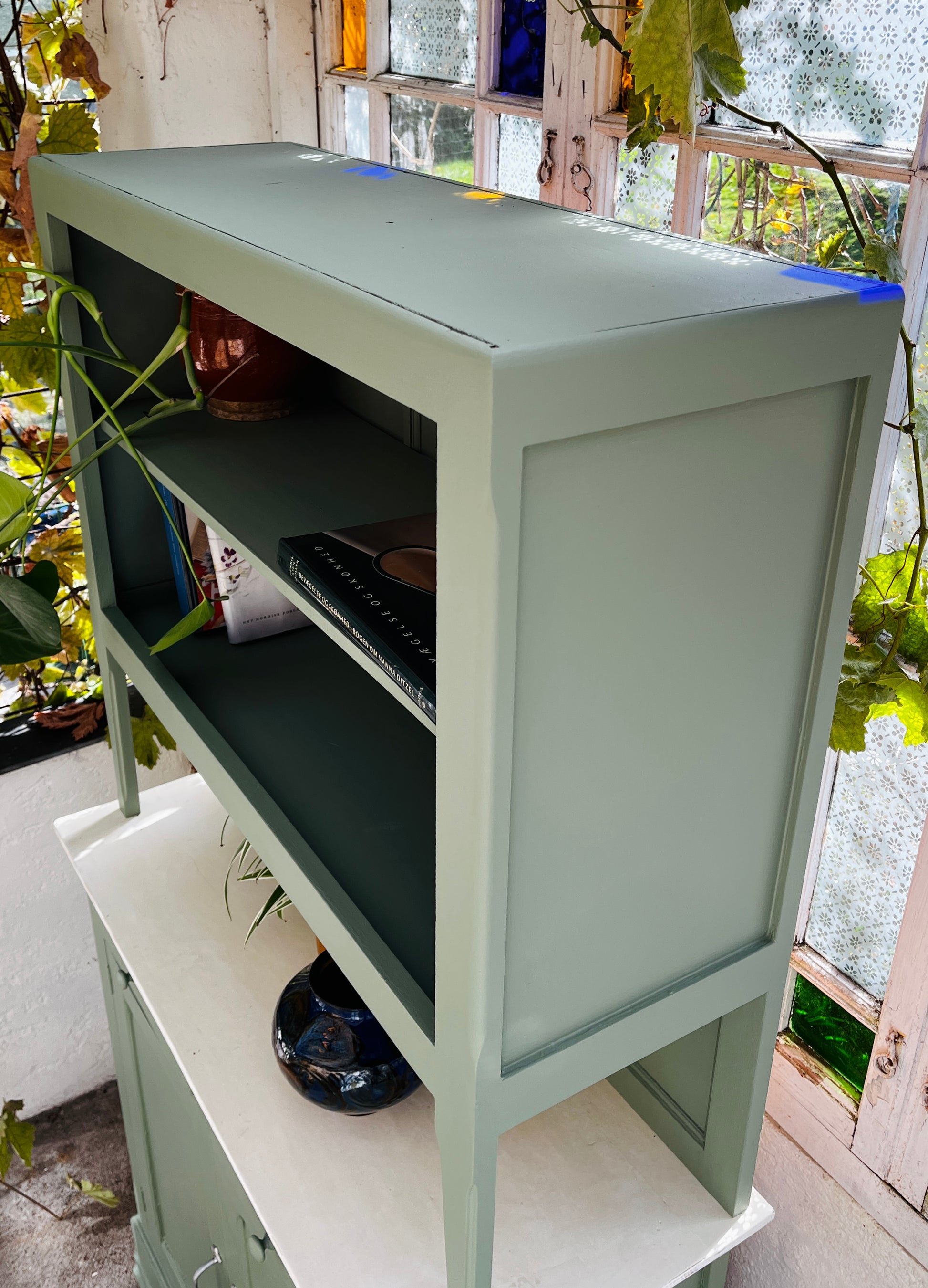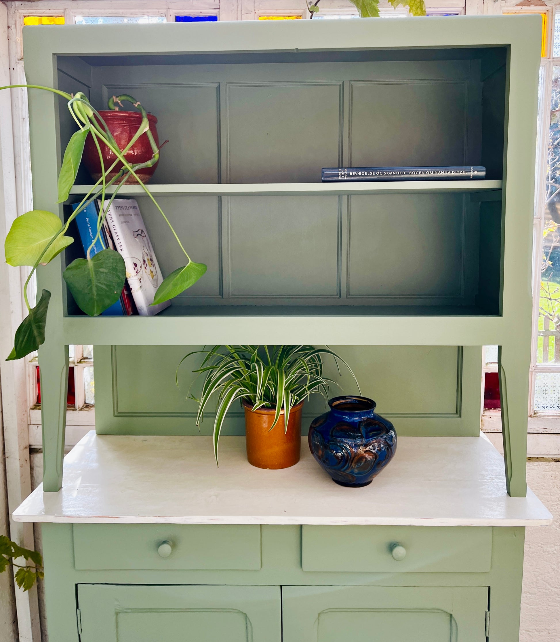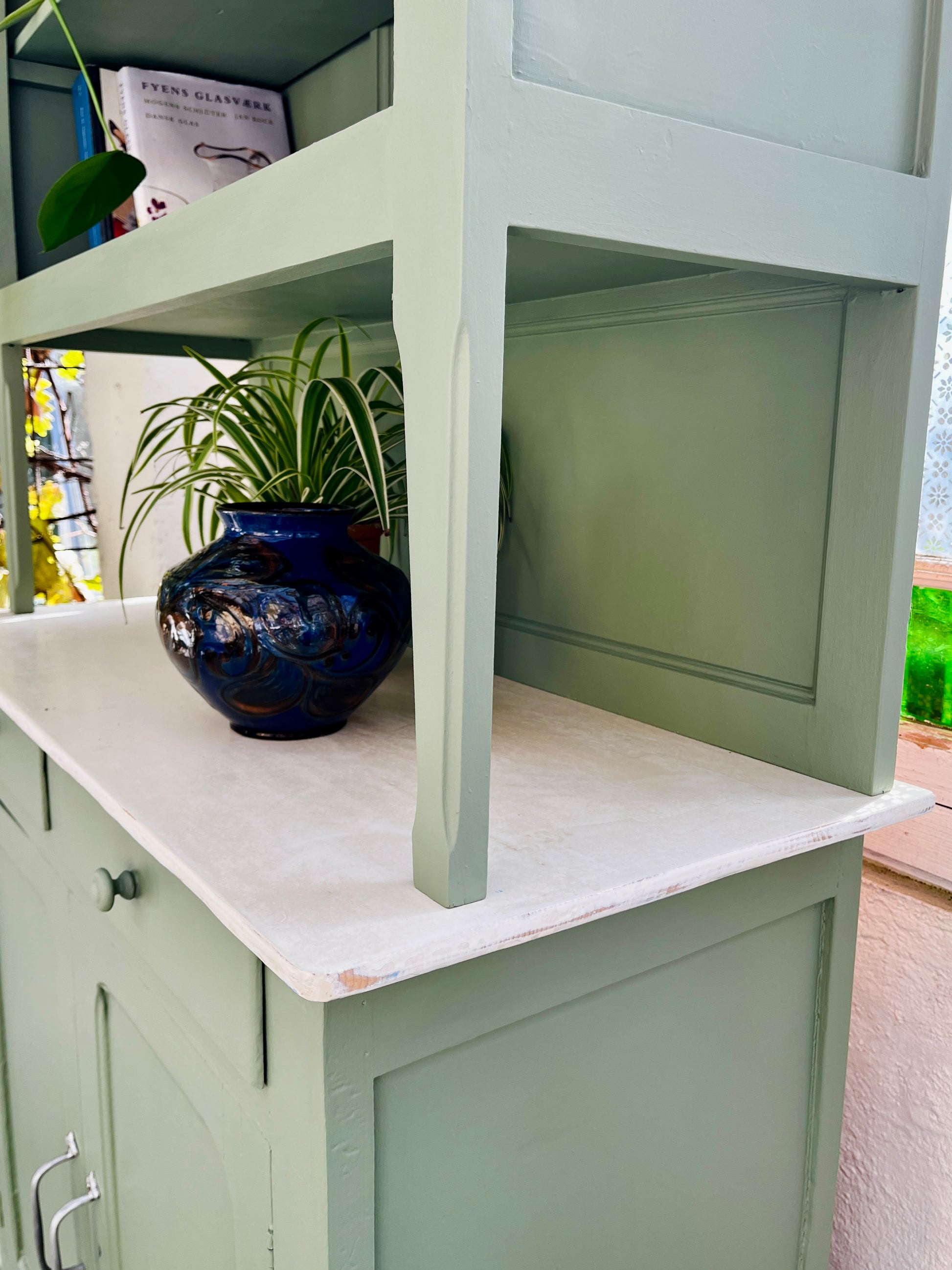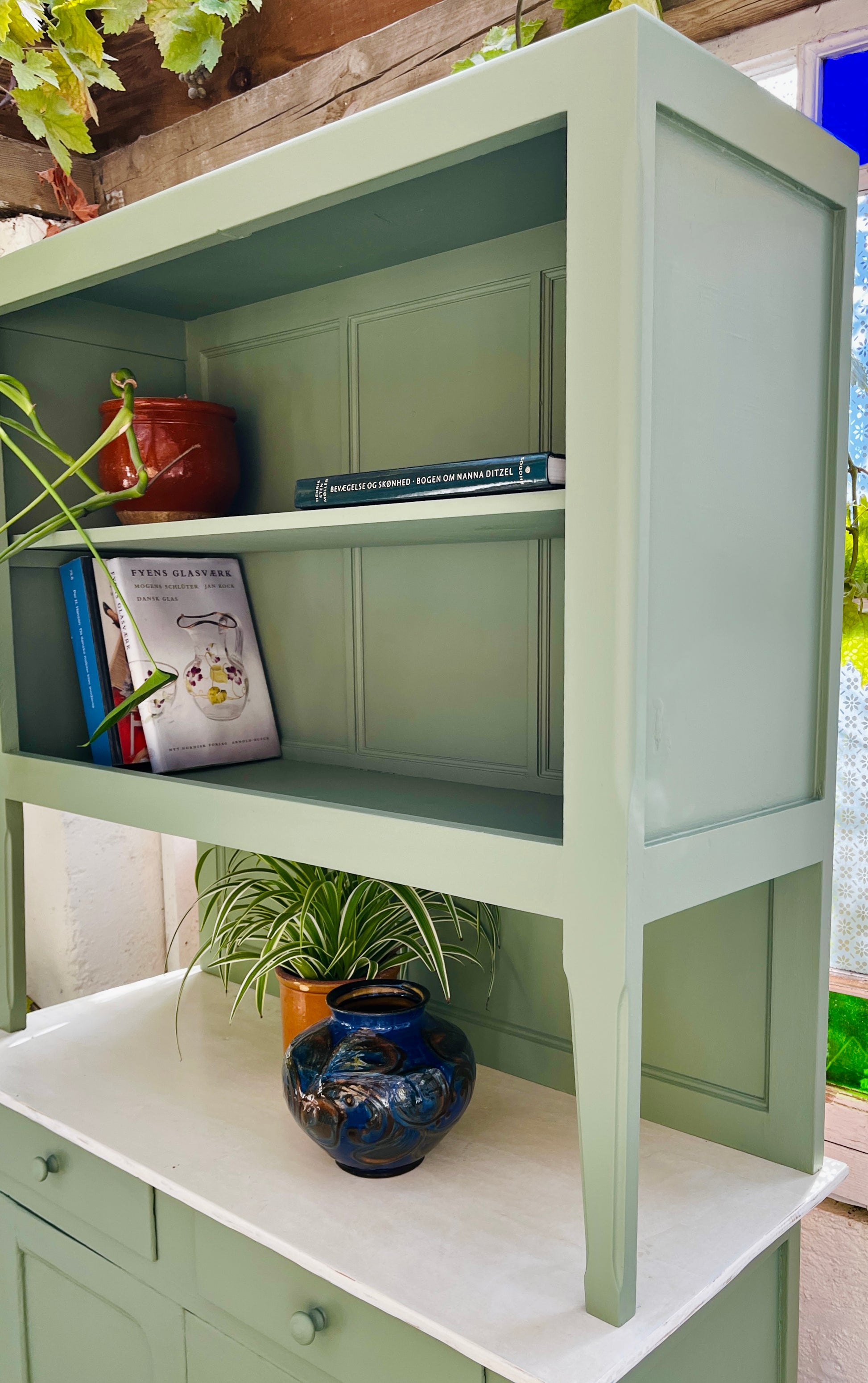 Overdelen består af et åbent skab med hylde, og står på et underskab med to skuffer samt to låger med fine greb. Bag lågerne gemmer sig en aftagelig hylde.