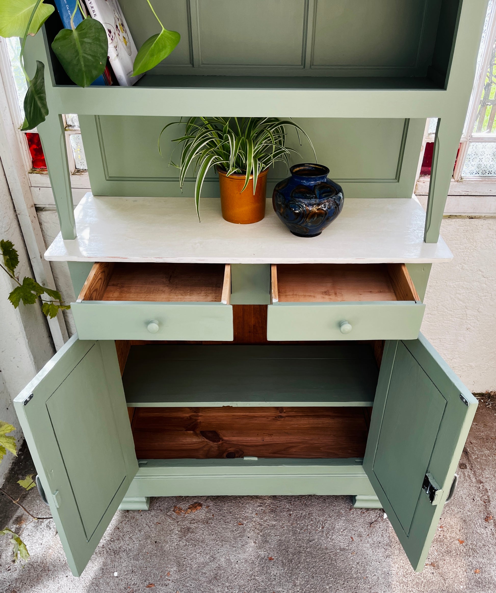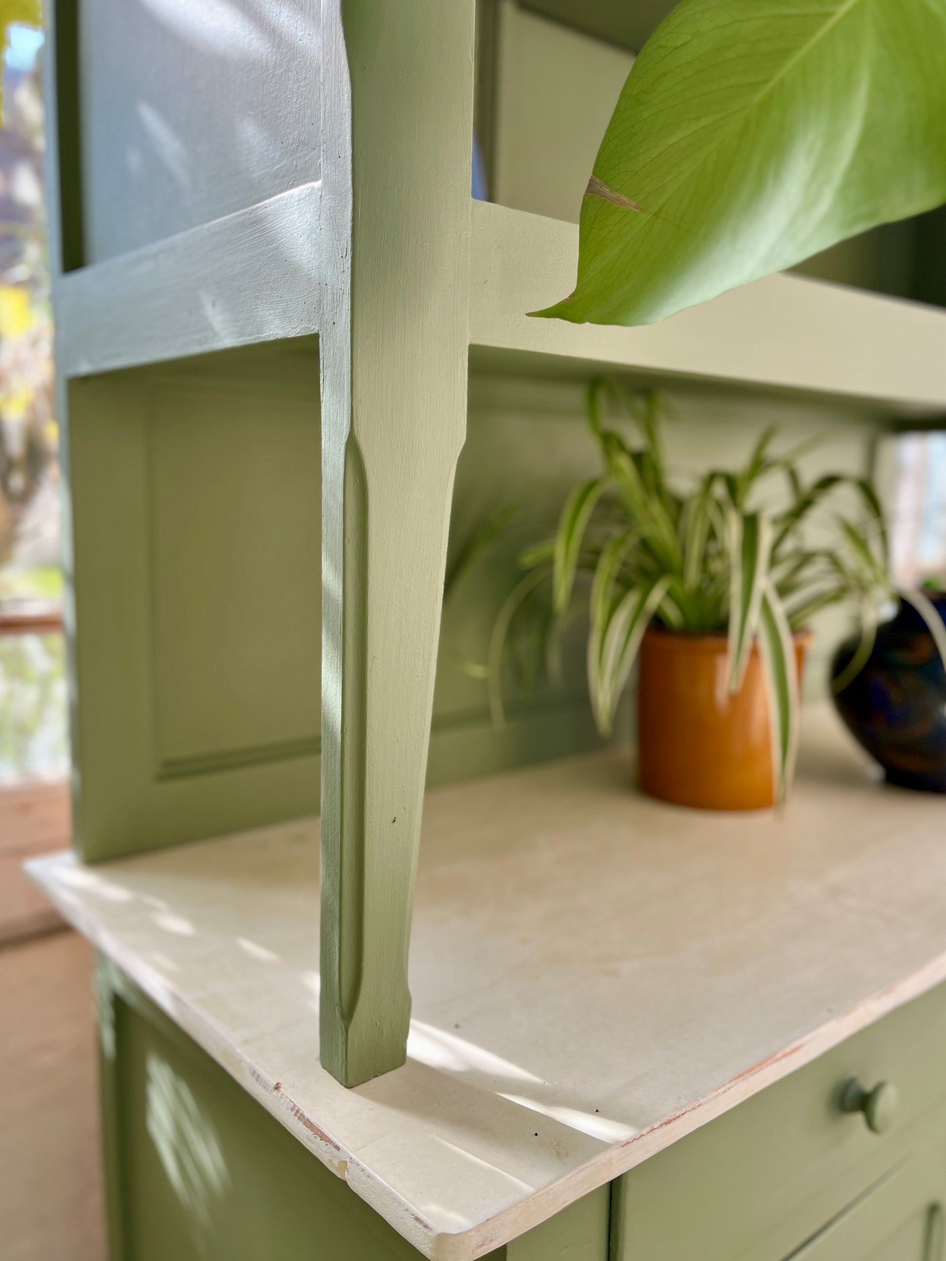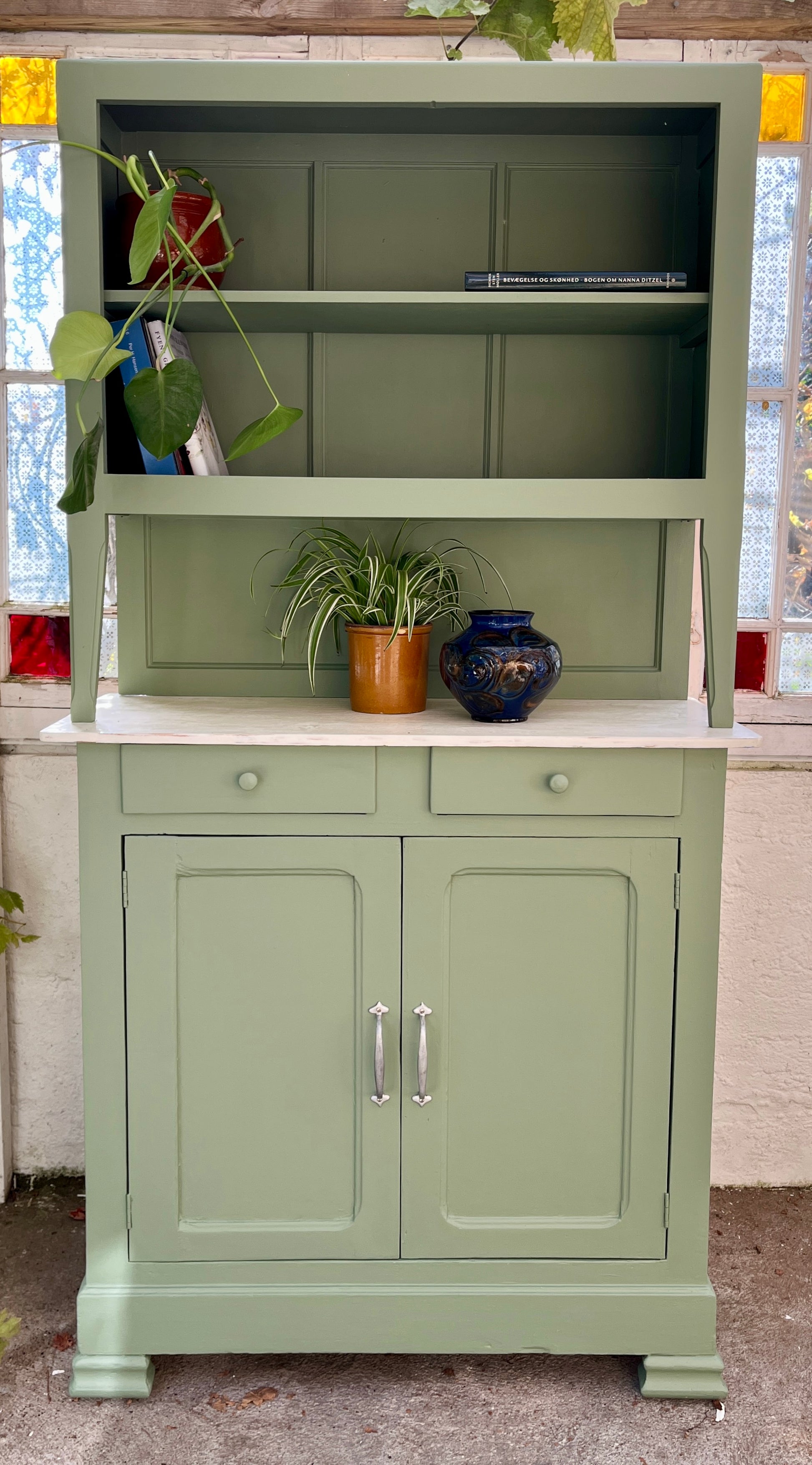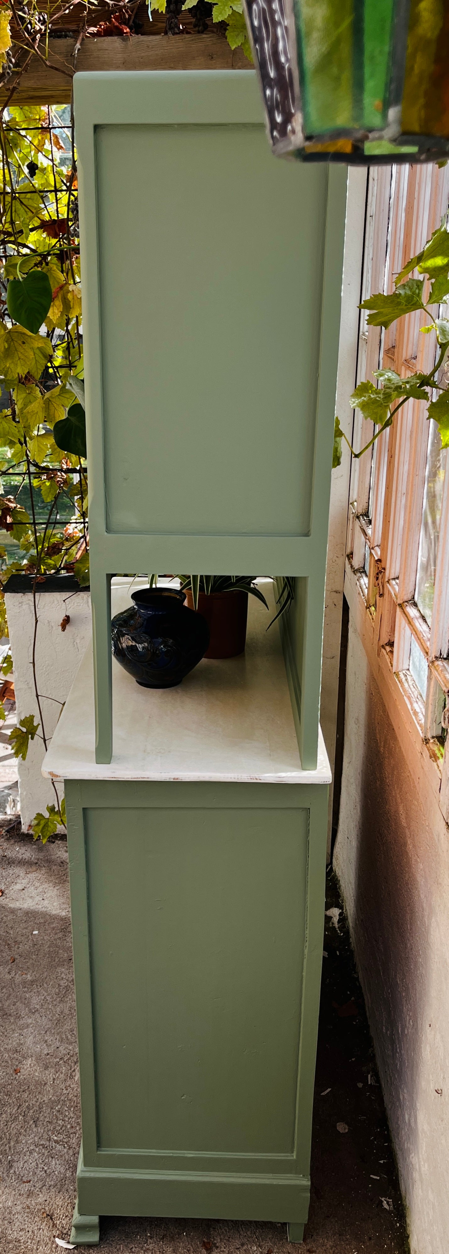 Overdelen består af et åbent skab med hylde, og står på et underskab med to skuffer samt to låger med fine greb. Bag lågerne gemmer sig en aftagelig hylde.
