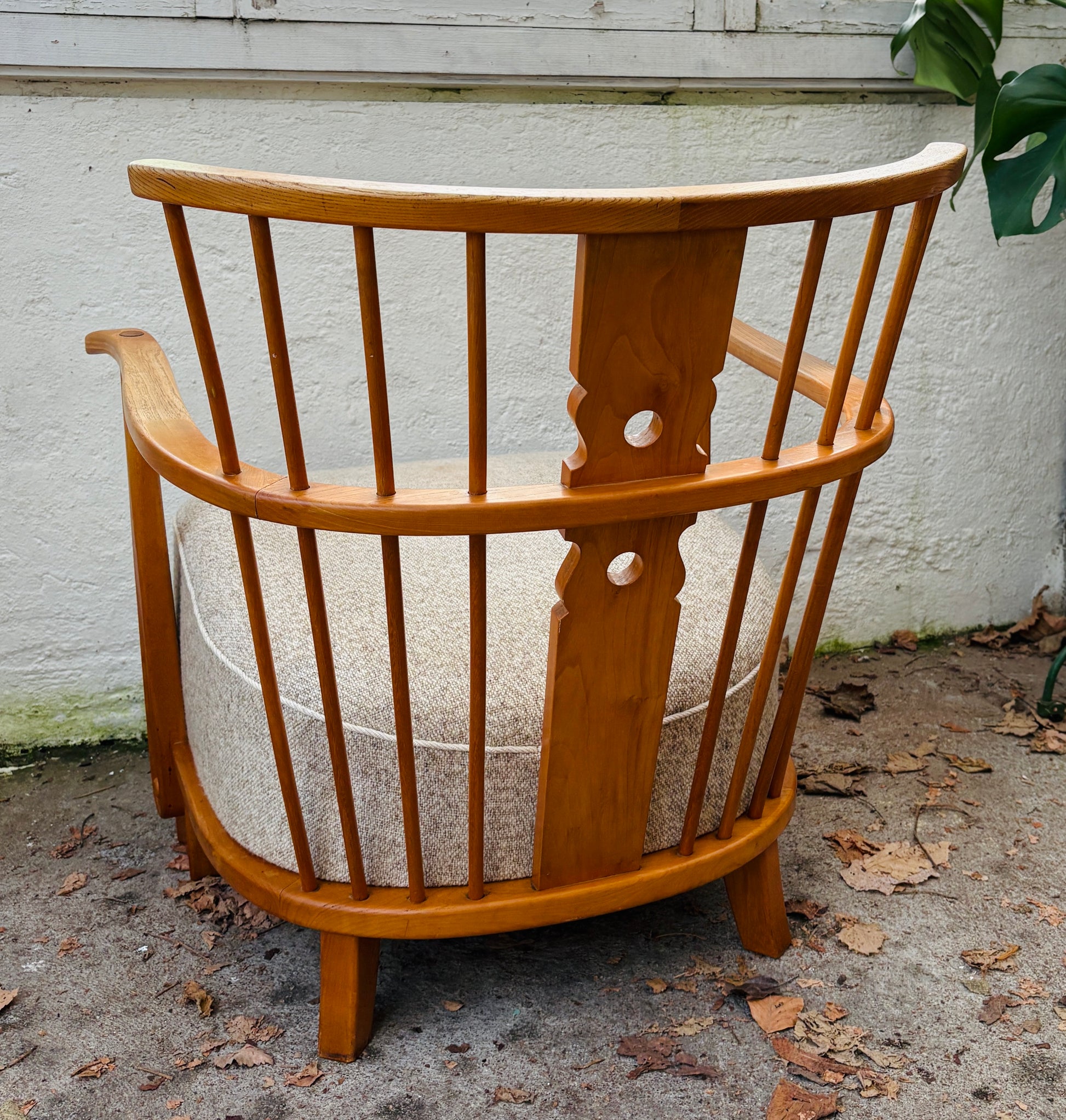 Stolen er lavet i massivt elm og står på et robust firbenet stel med smukt buede armlæn. Det åbne ryglæn med otte slanke træspindler skaber et let udtryk og giver samtidig god støtte. Et tydeligt eksempel på tidlig dansk møbelkunst, hvor både funktionalitet og æstetik er i højsædet.