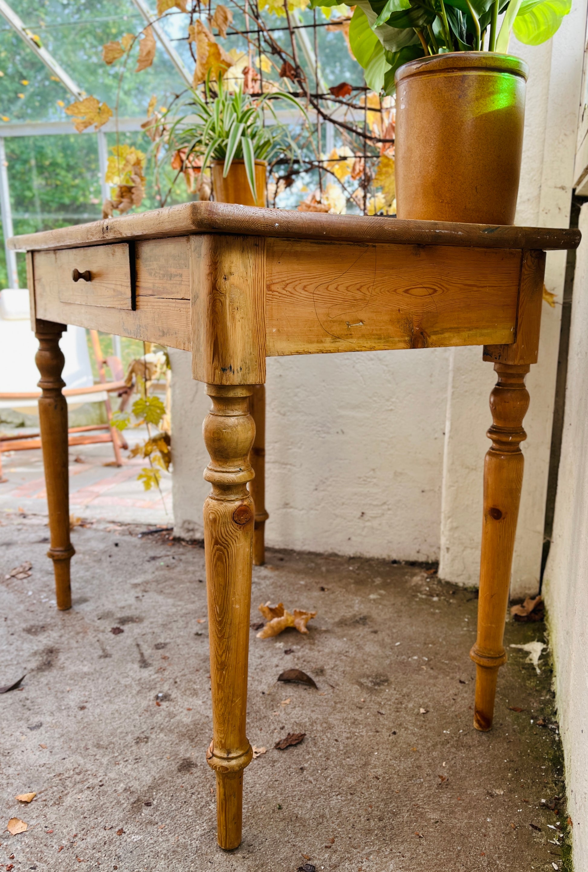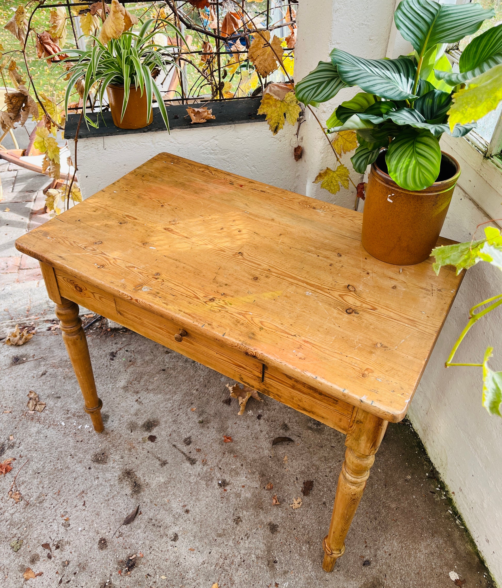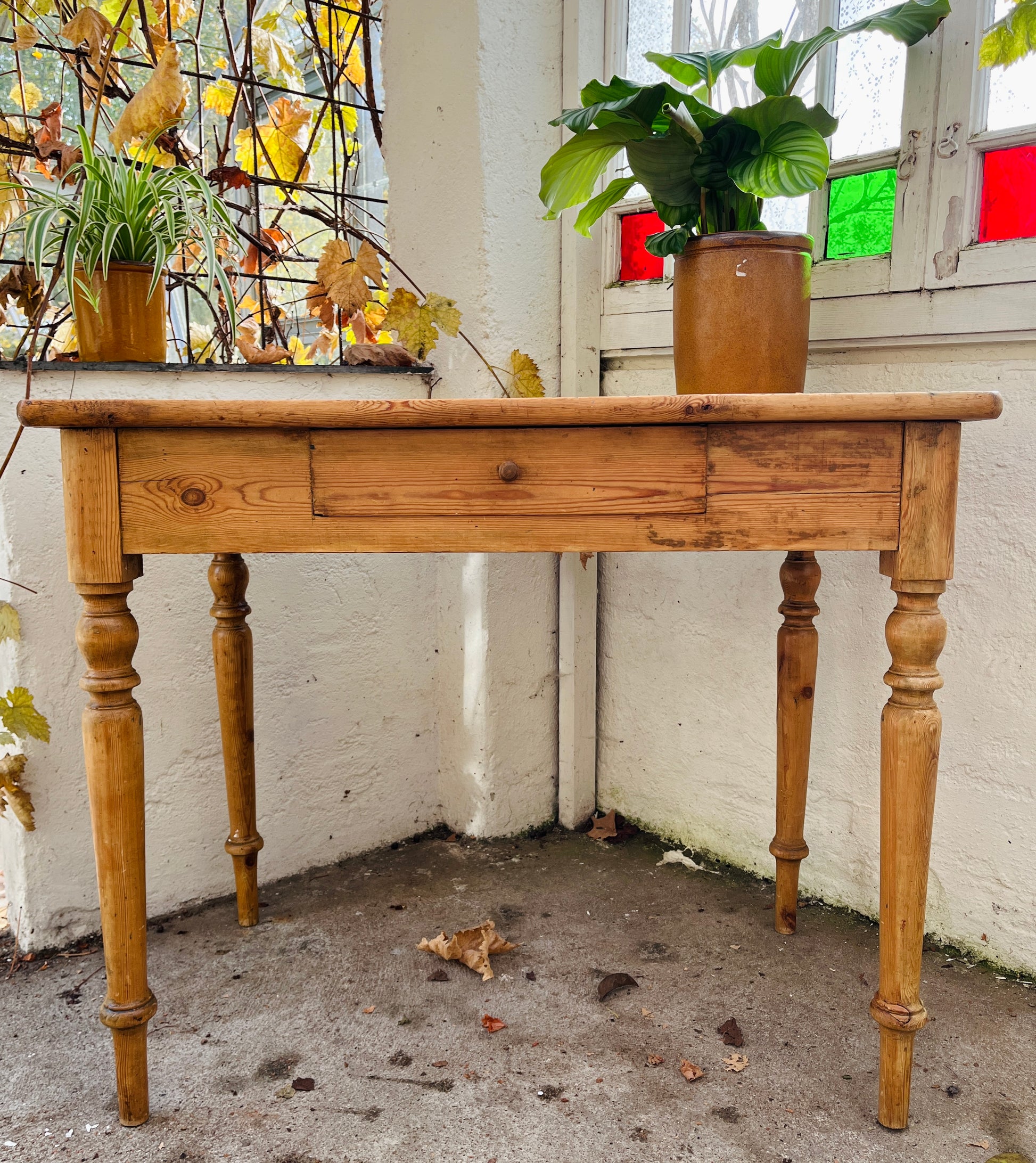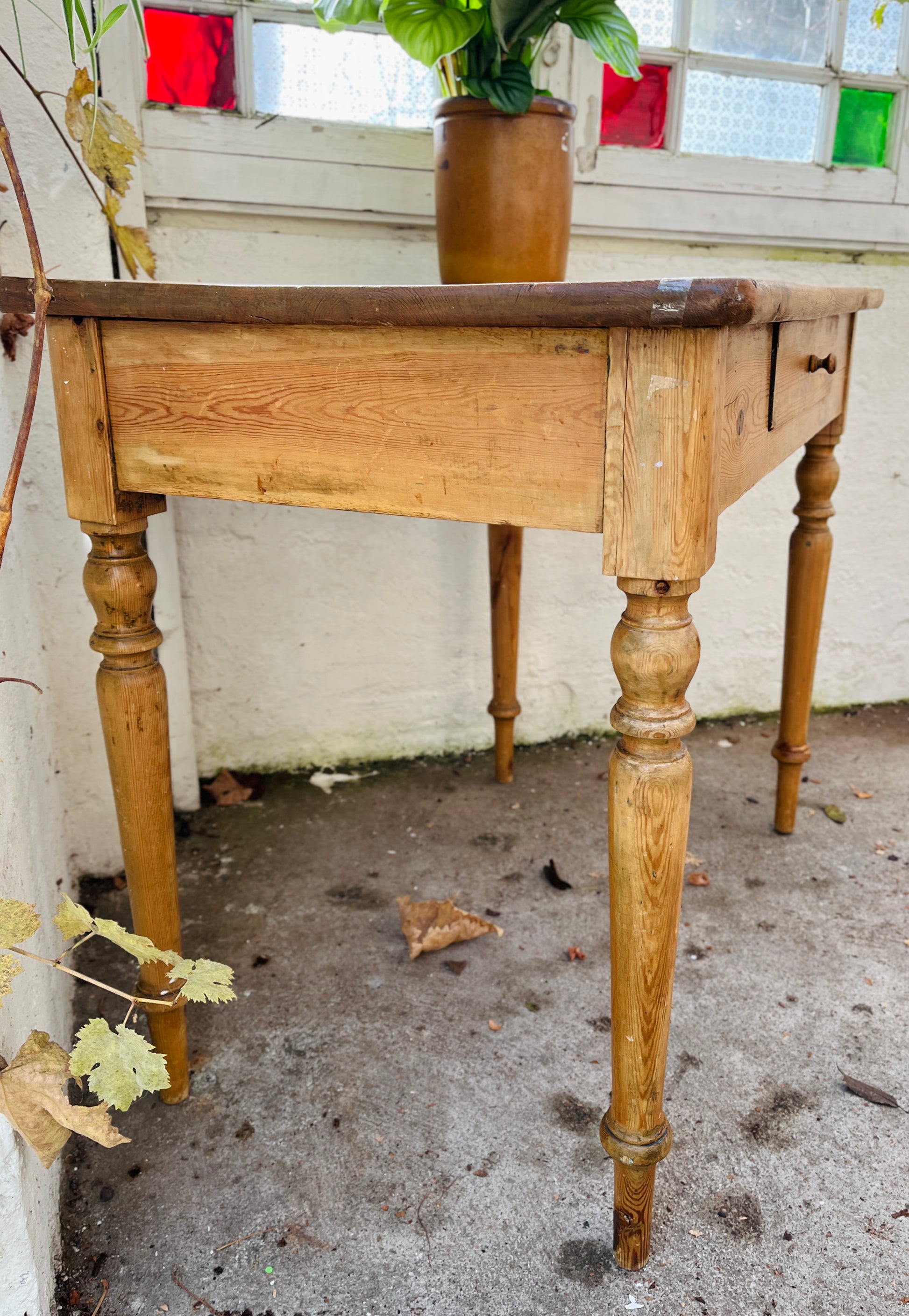 Gammelt fyrretrædbord med skuffe. Stabilt og med masser af charme og patina