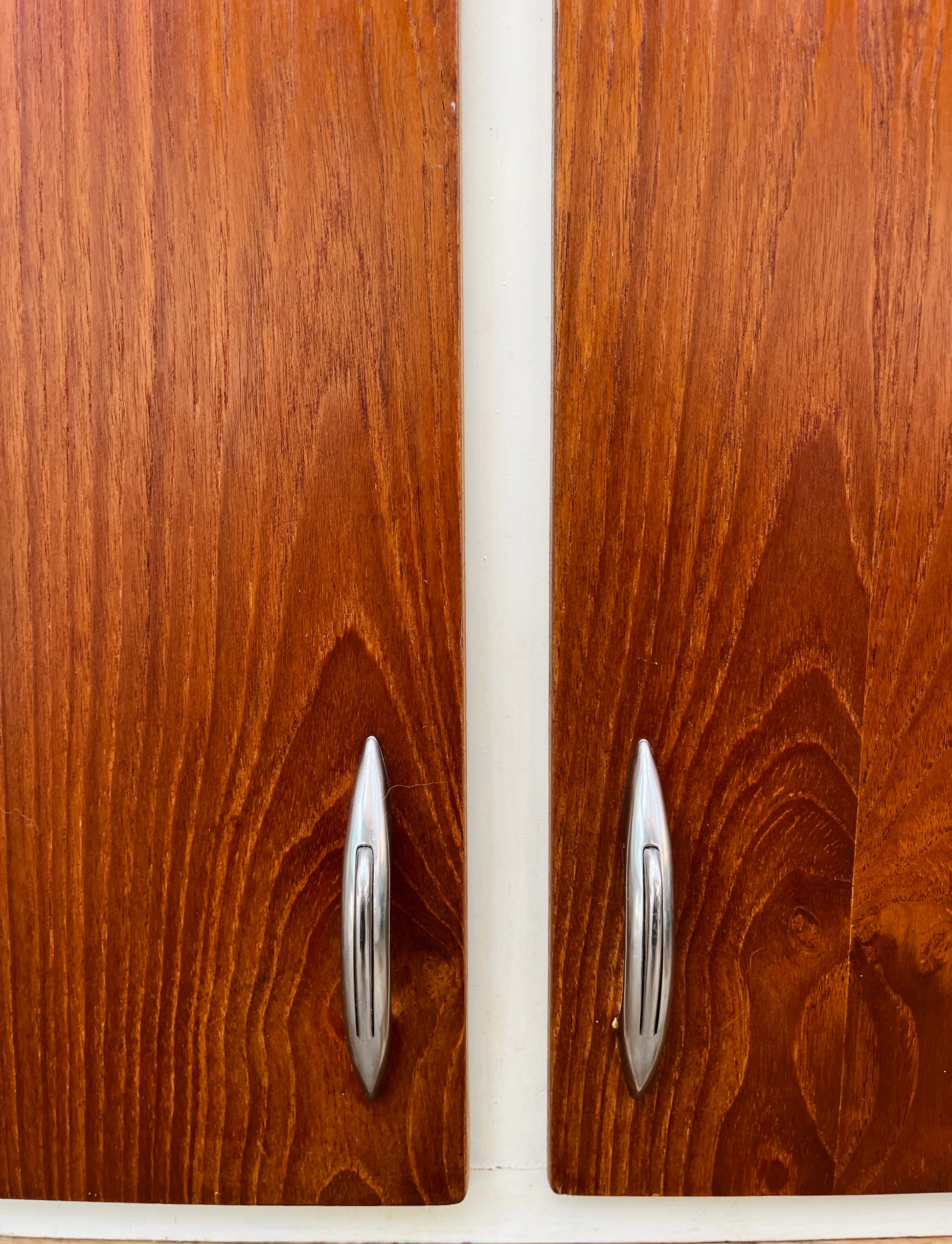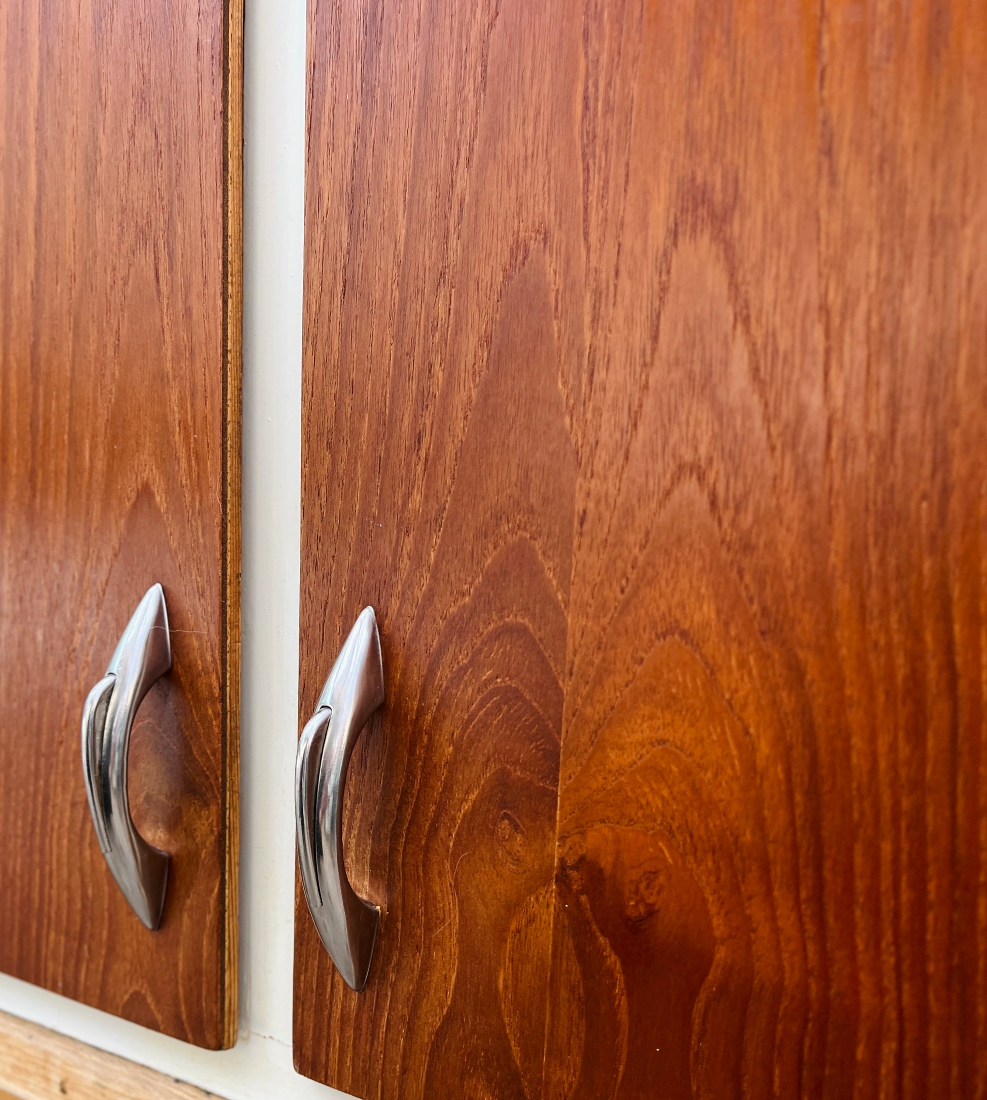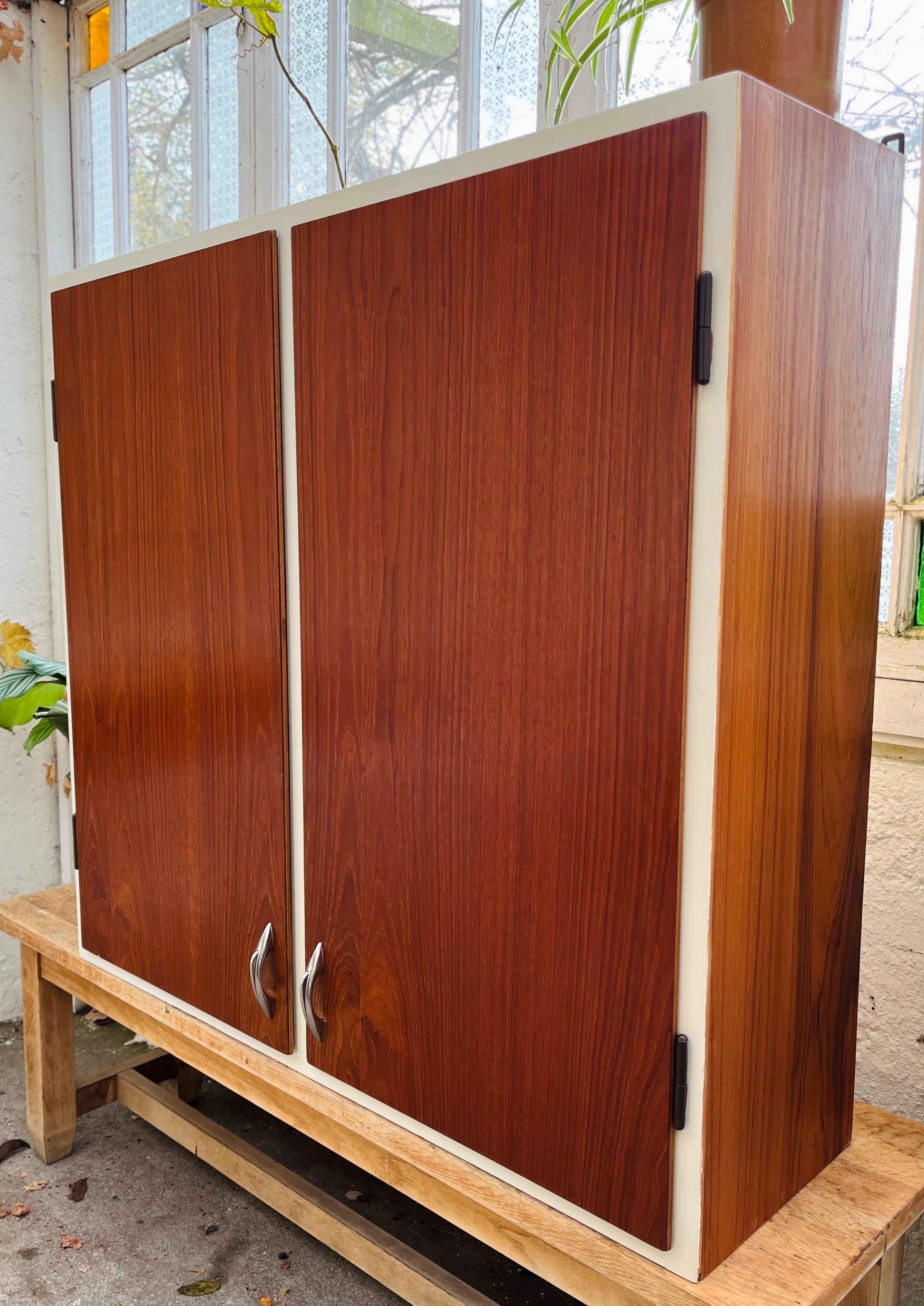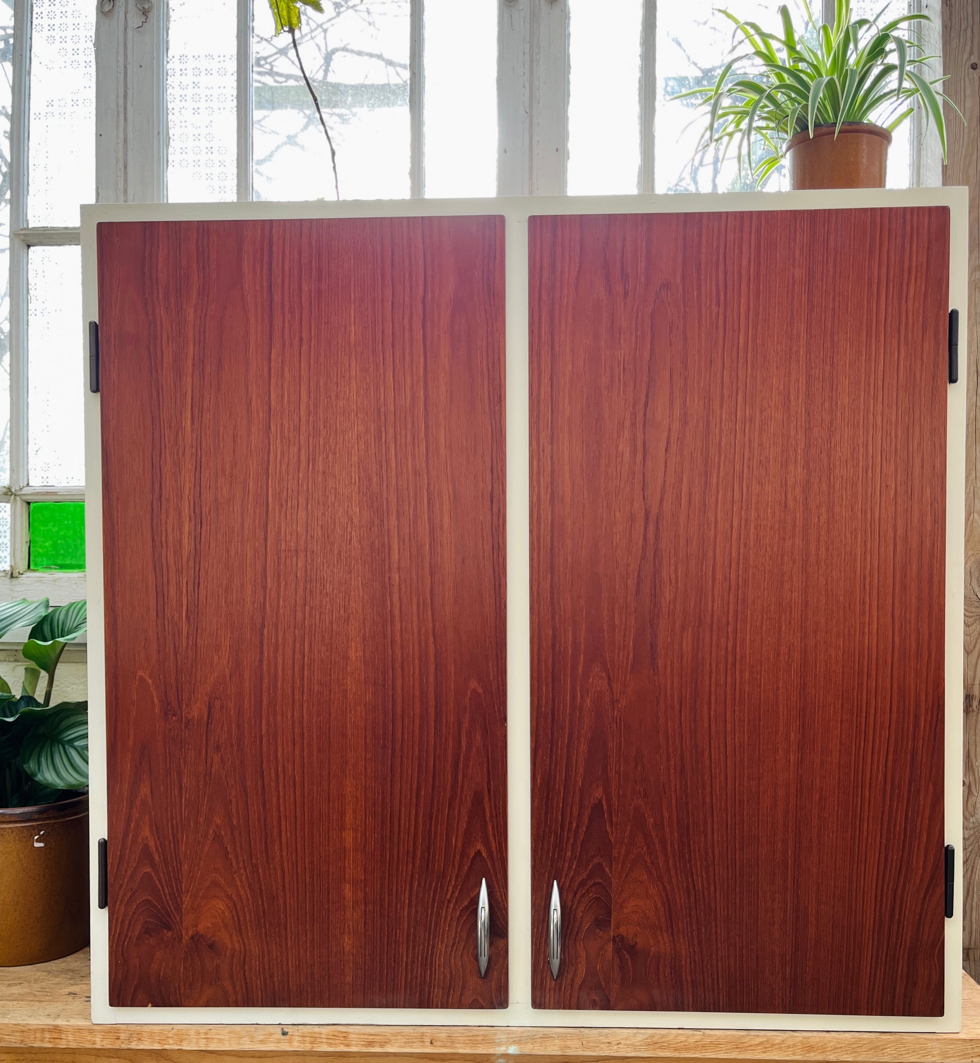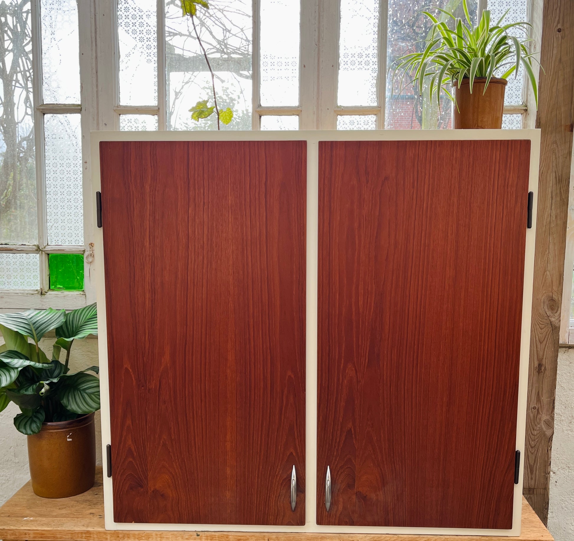 Charmerende køkkenskab til ophæng med teak-låger, sider, bund og top. Skabet har tre fastsiddende hylder med en afstand på ca. 21–23 cm samt originale greb. I god vintage stand.