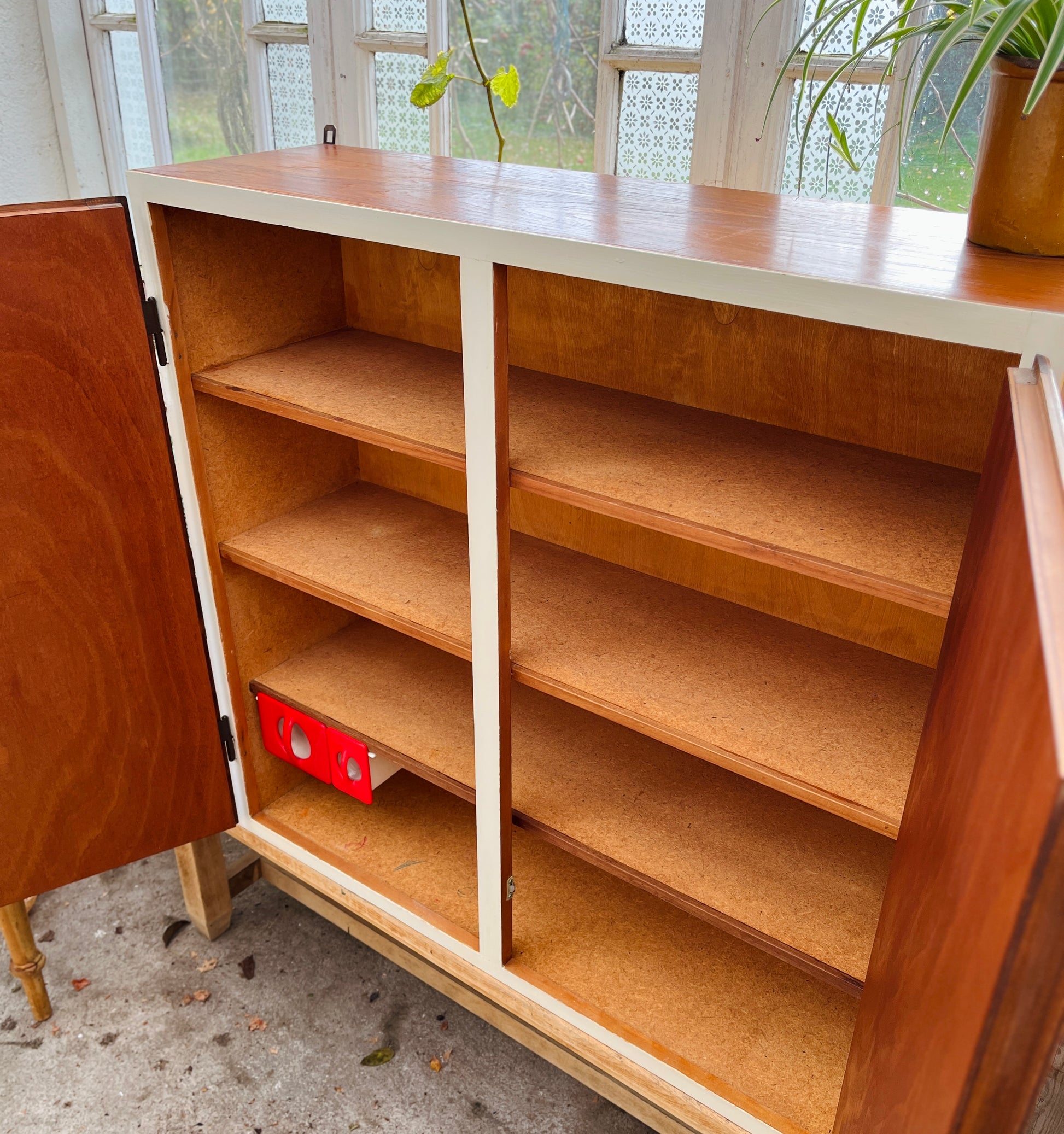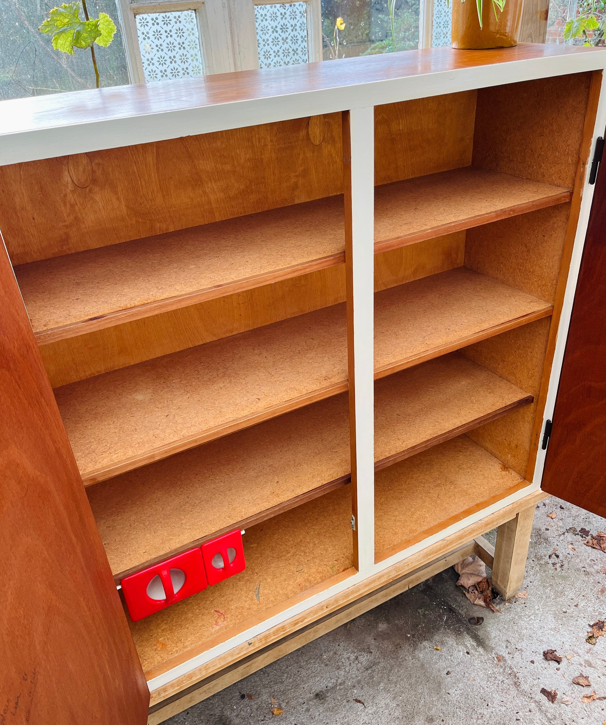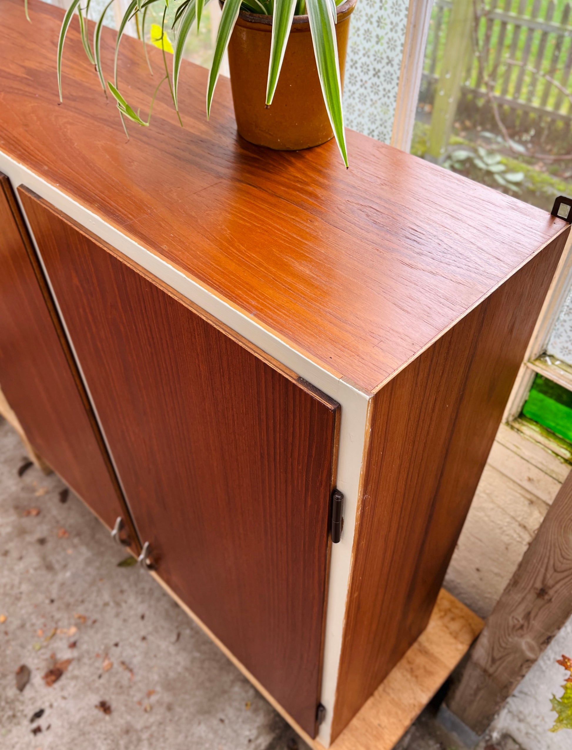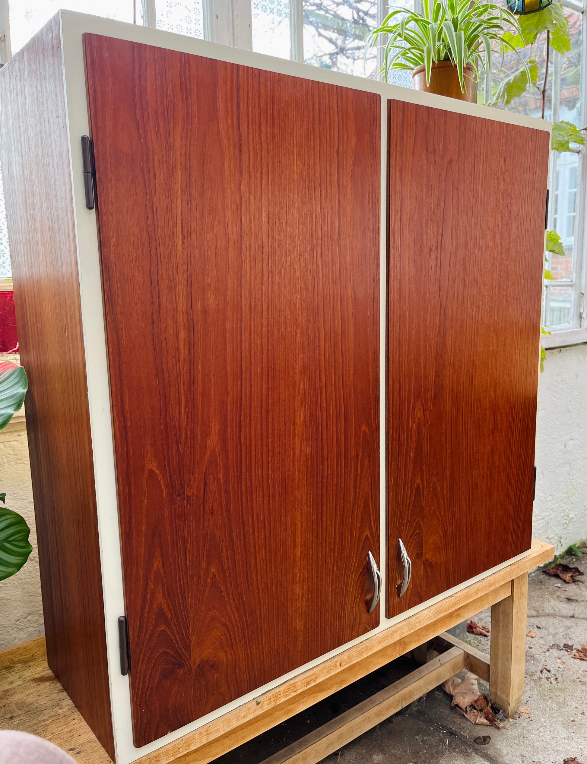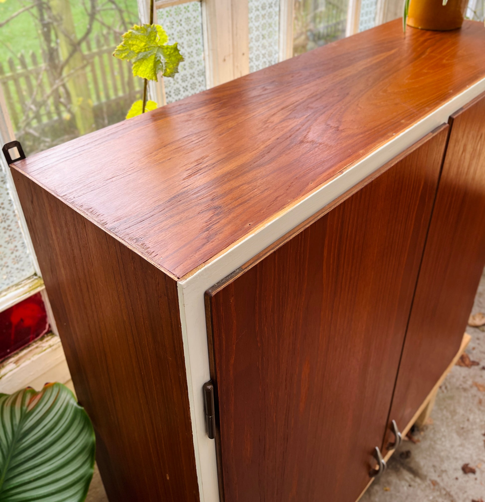 Charmerende køkkenskab til ophæng med teak-låger, sider, bund og top. Skabet har tre fastsiddende hylder med en afstand på ca. 21–23 cm samt originale greb. I god vintage stand.