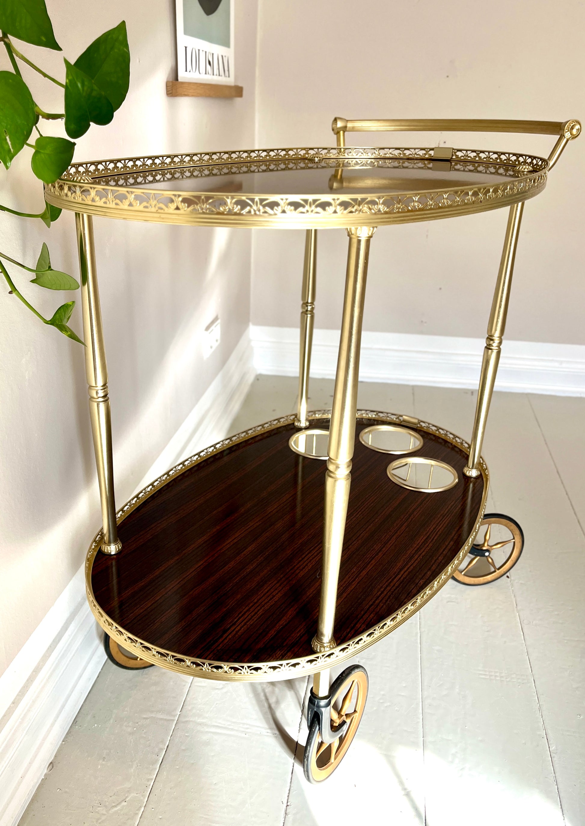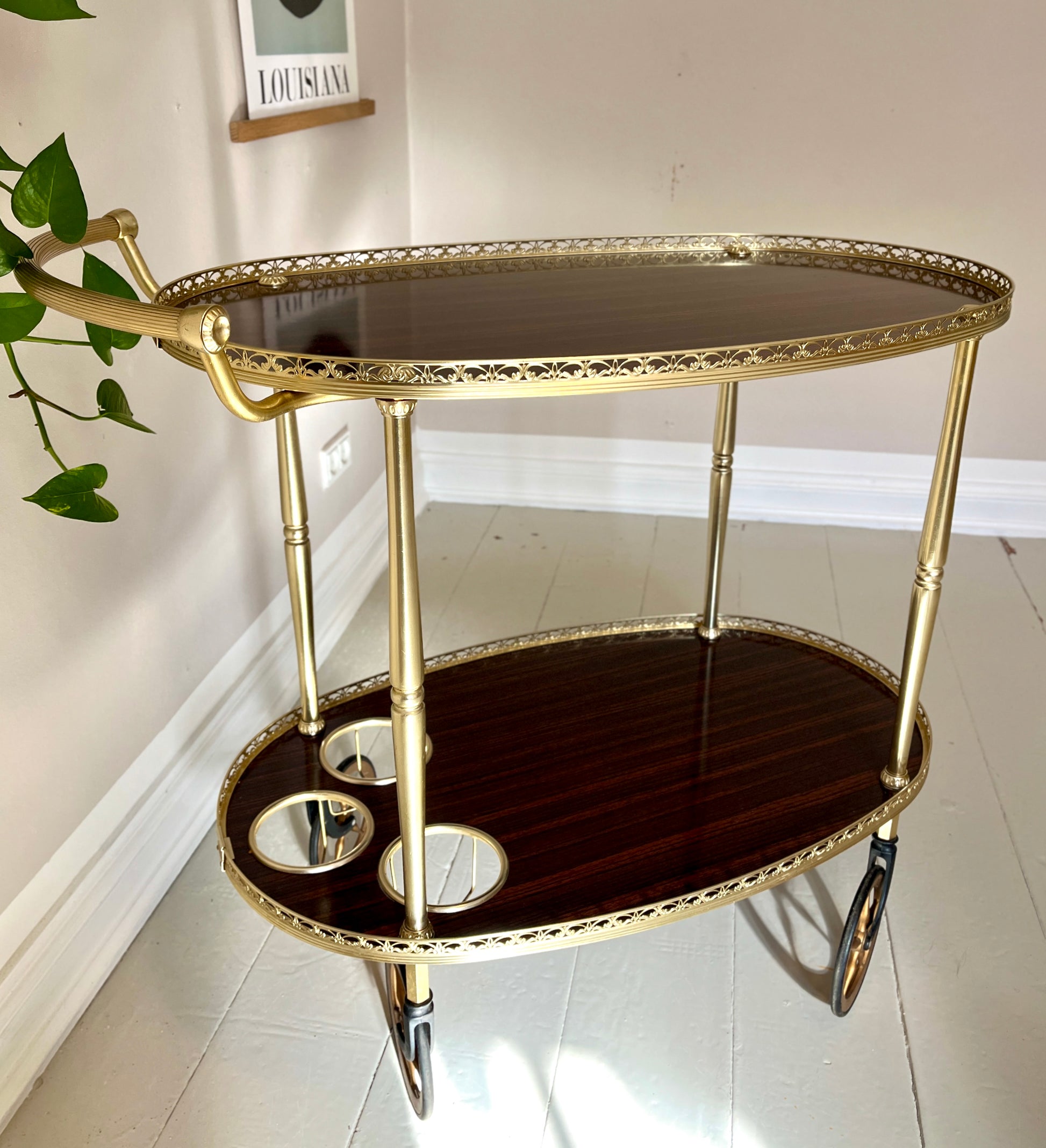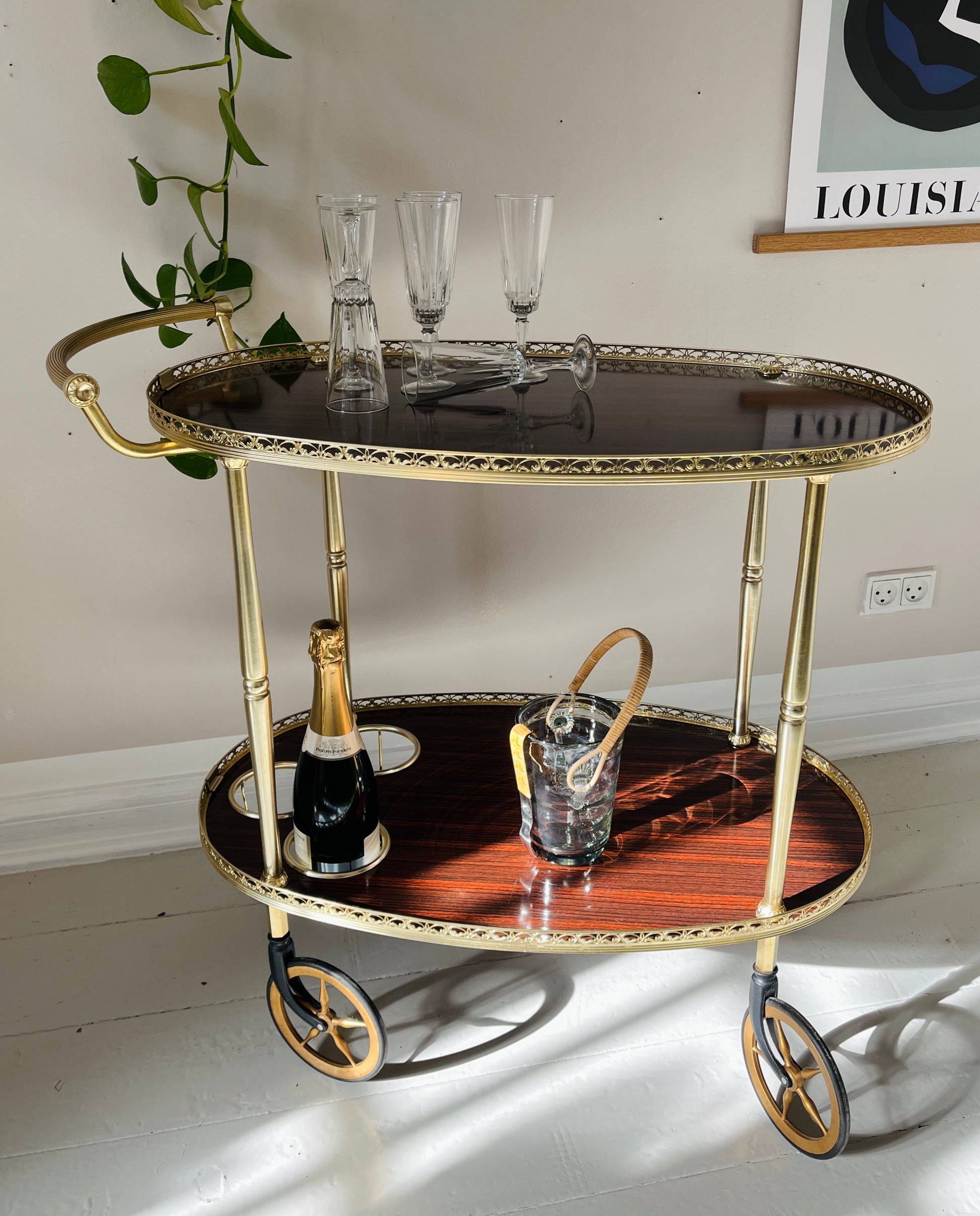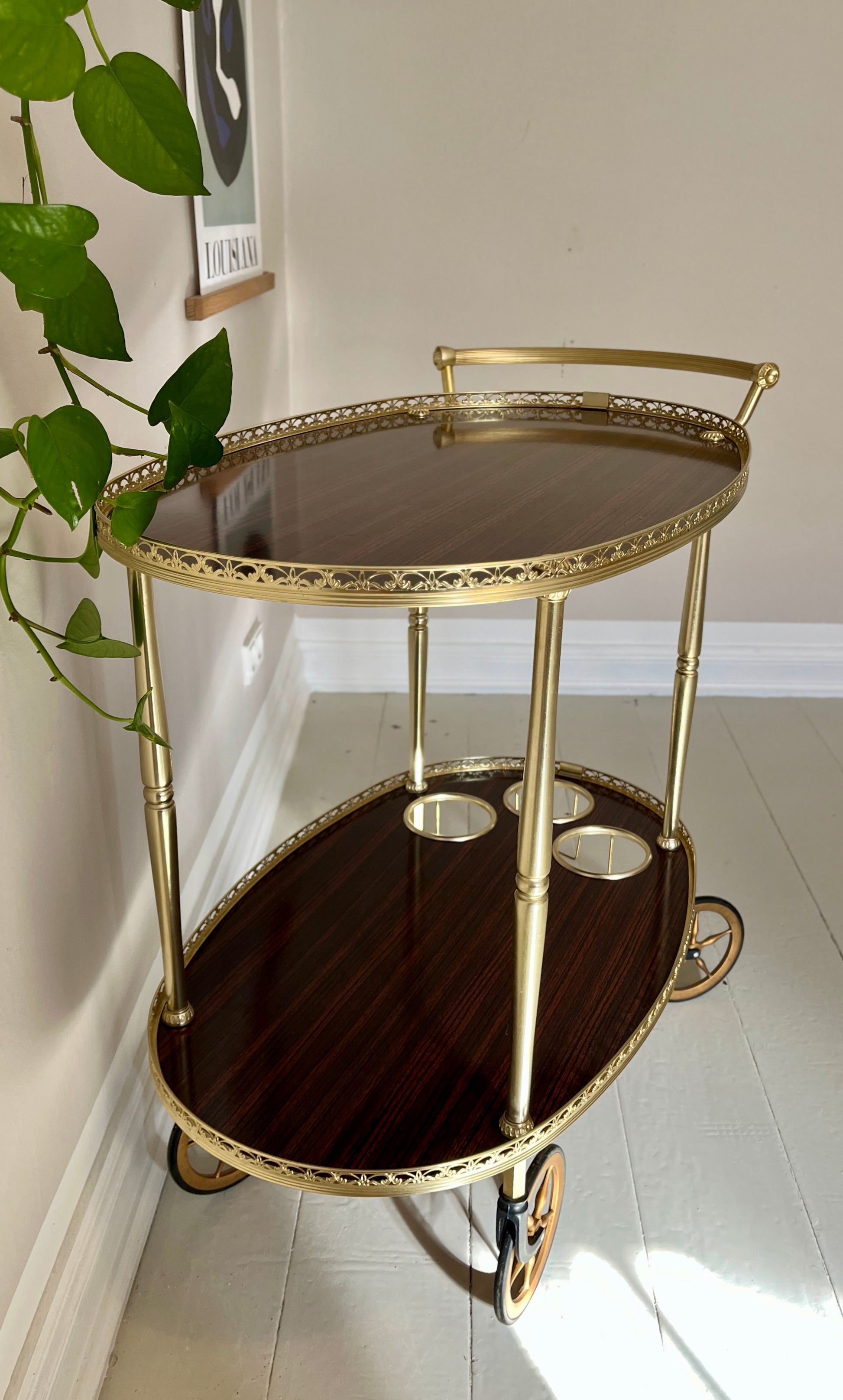Elegant italiensk barvogn fra midten af 1900-tallet i flot vintage stand. Smuk oval form med tre flaskerum på nederste hylde. Se billederne for de mange smukke detaljer.