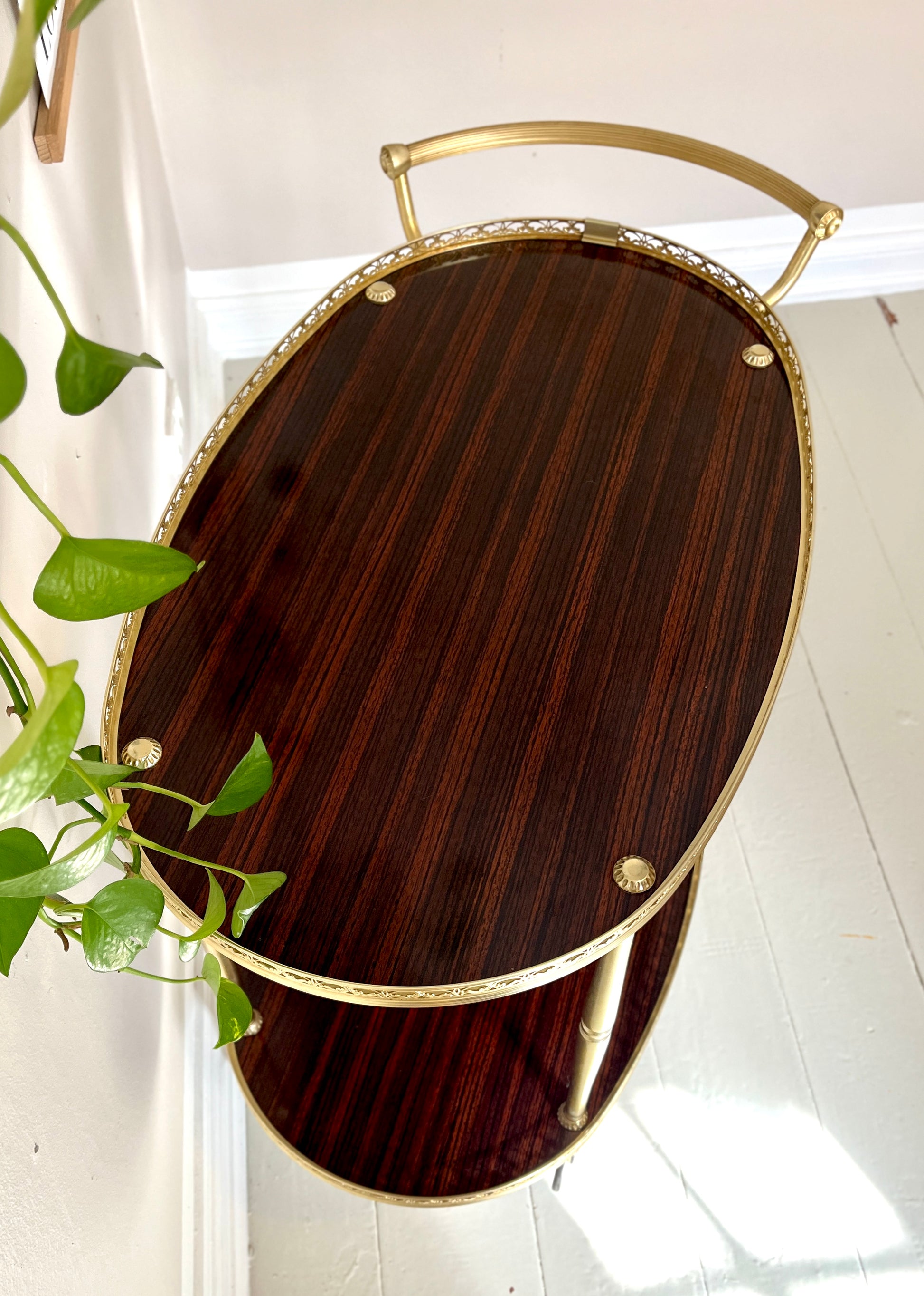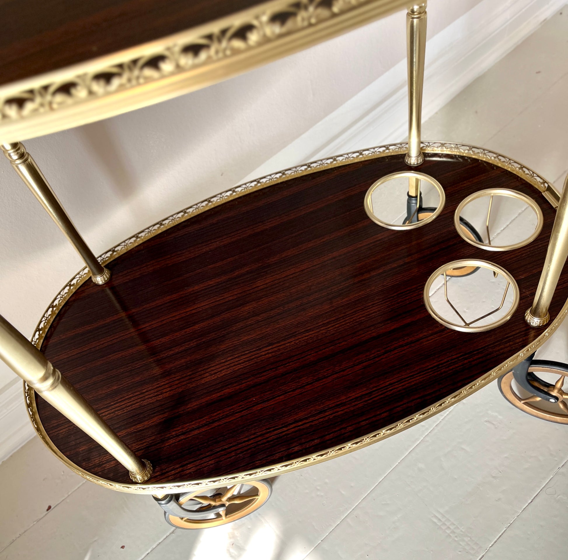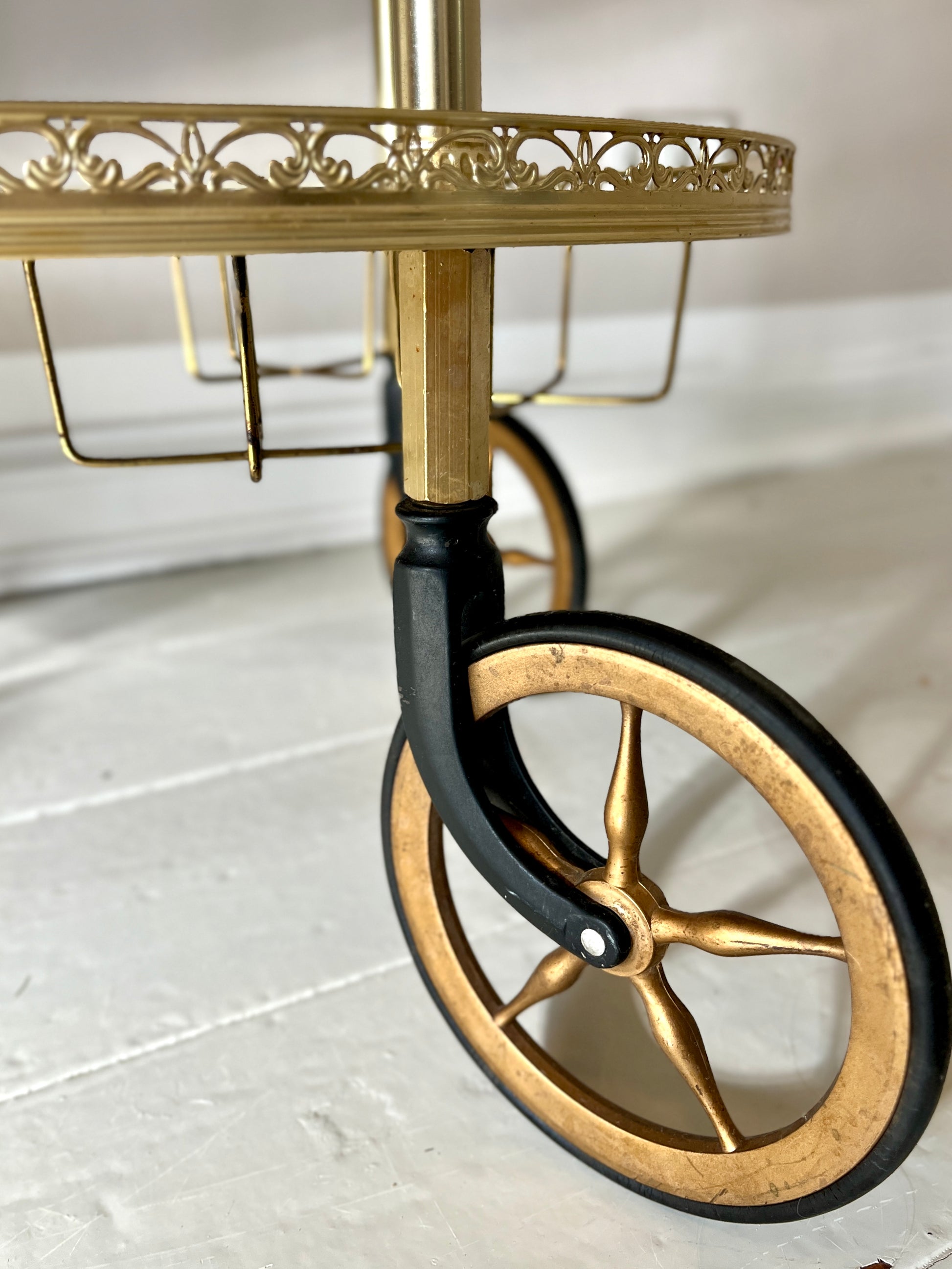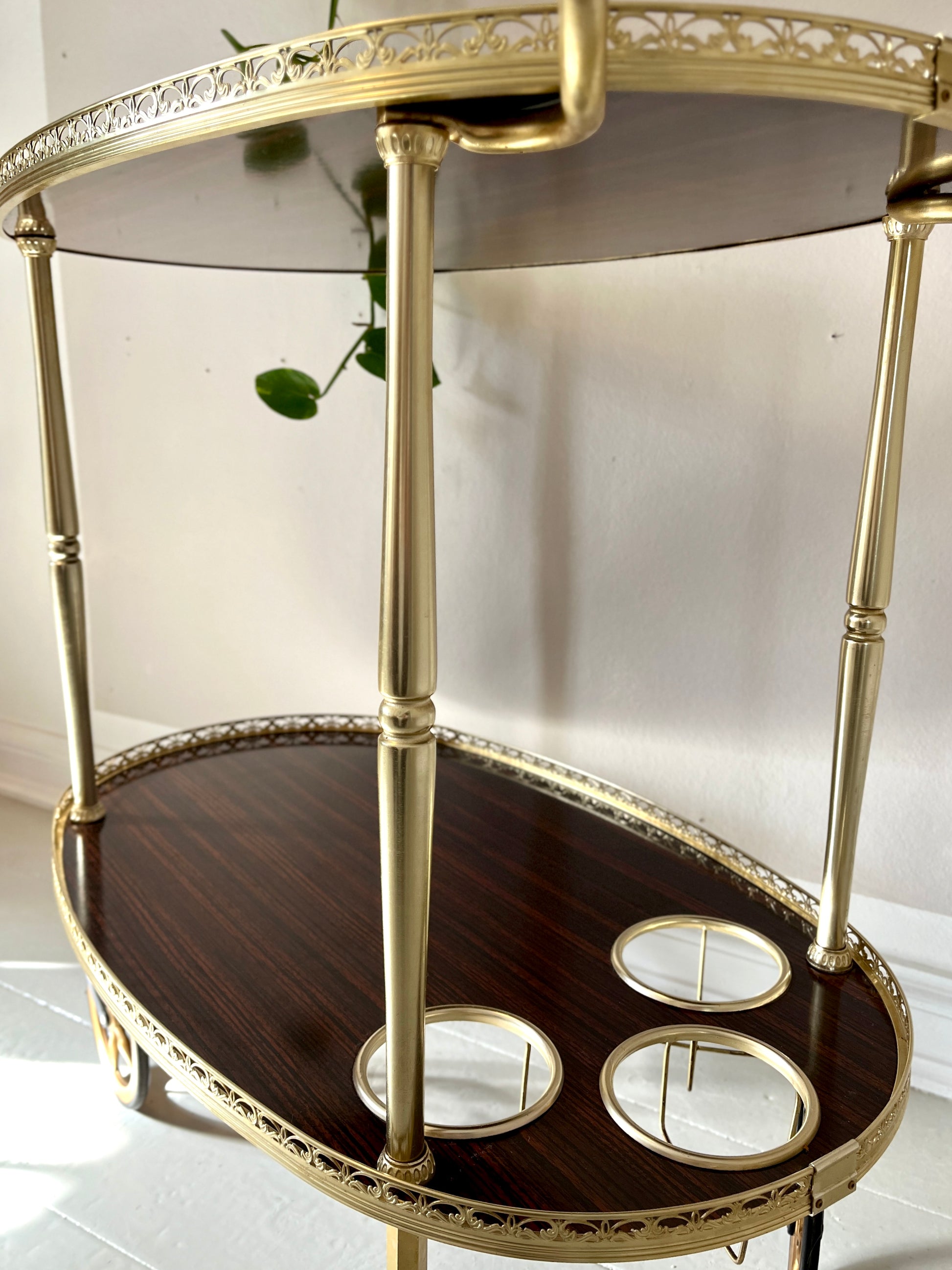 Elegant italiensk barvogn fra midten af 1900-tallet i flot vintage stand. Smuk oval form med tre flaskerum på nederste hylde. Se billederne for de mange smukke detaljer.