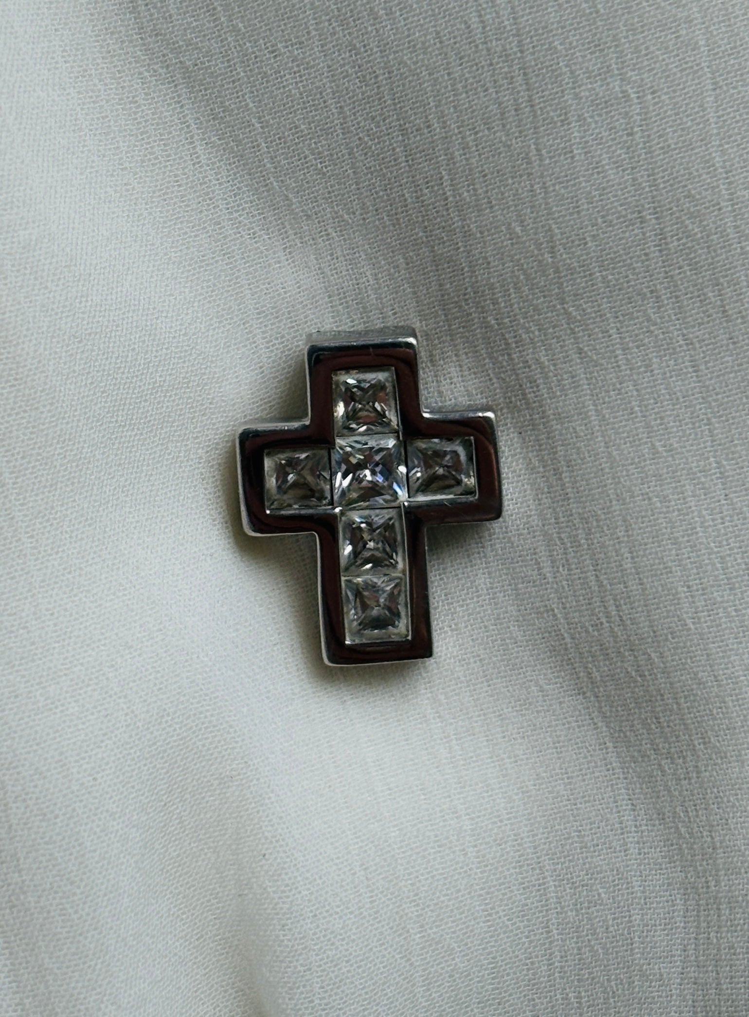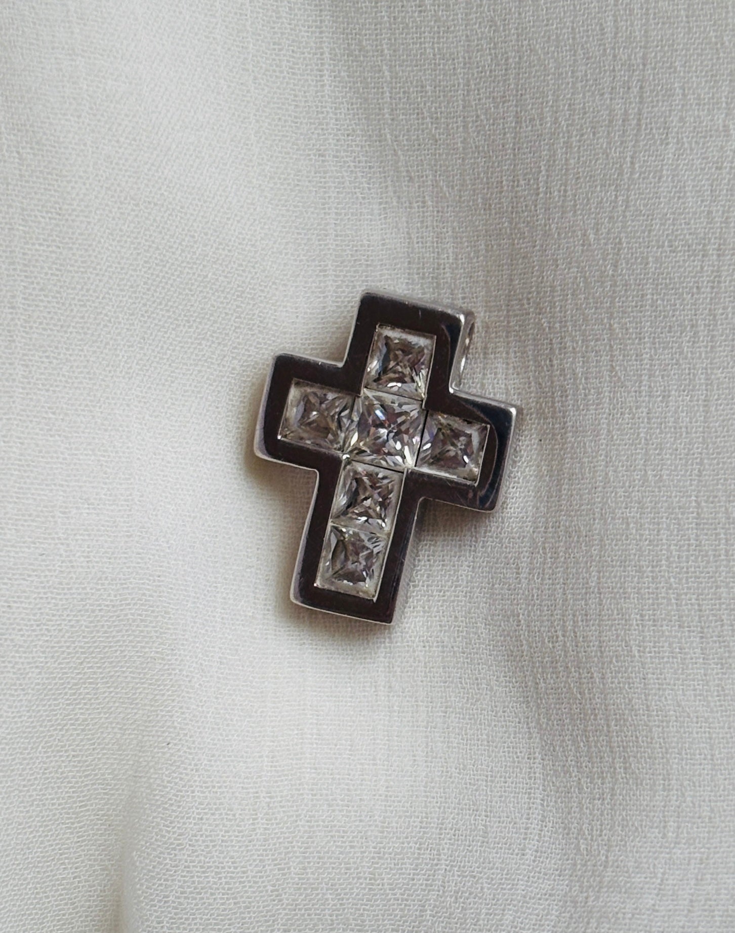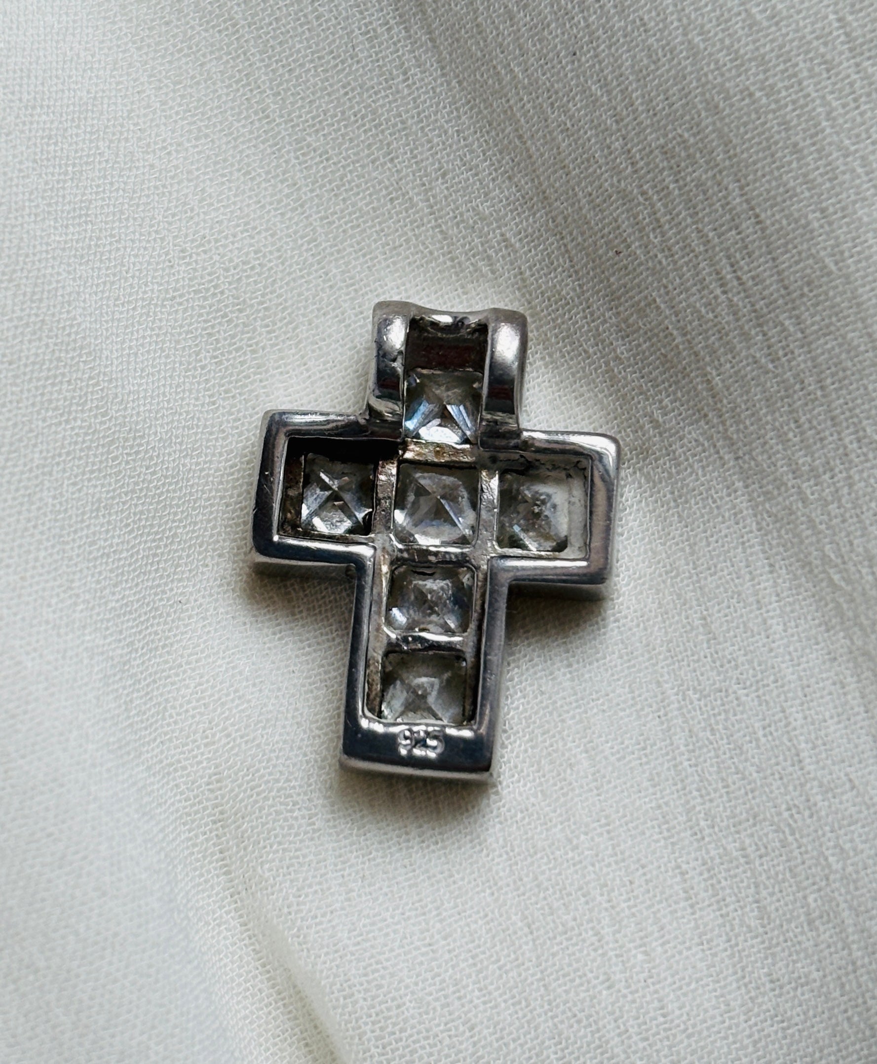 Finy kors-vedhæng i 925 sterlingsølv, dekoreret med små klare zirkonia. Højde ca. 2 cm, bredde ca. 1,5 cm – en tidløs klassiker, perfekt til hverdagsbrug eller som gave.