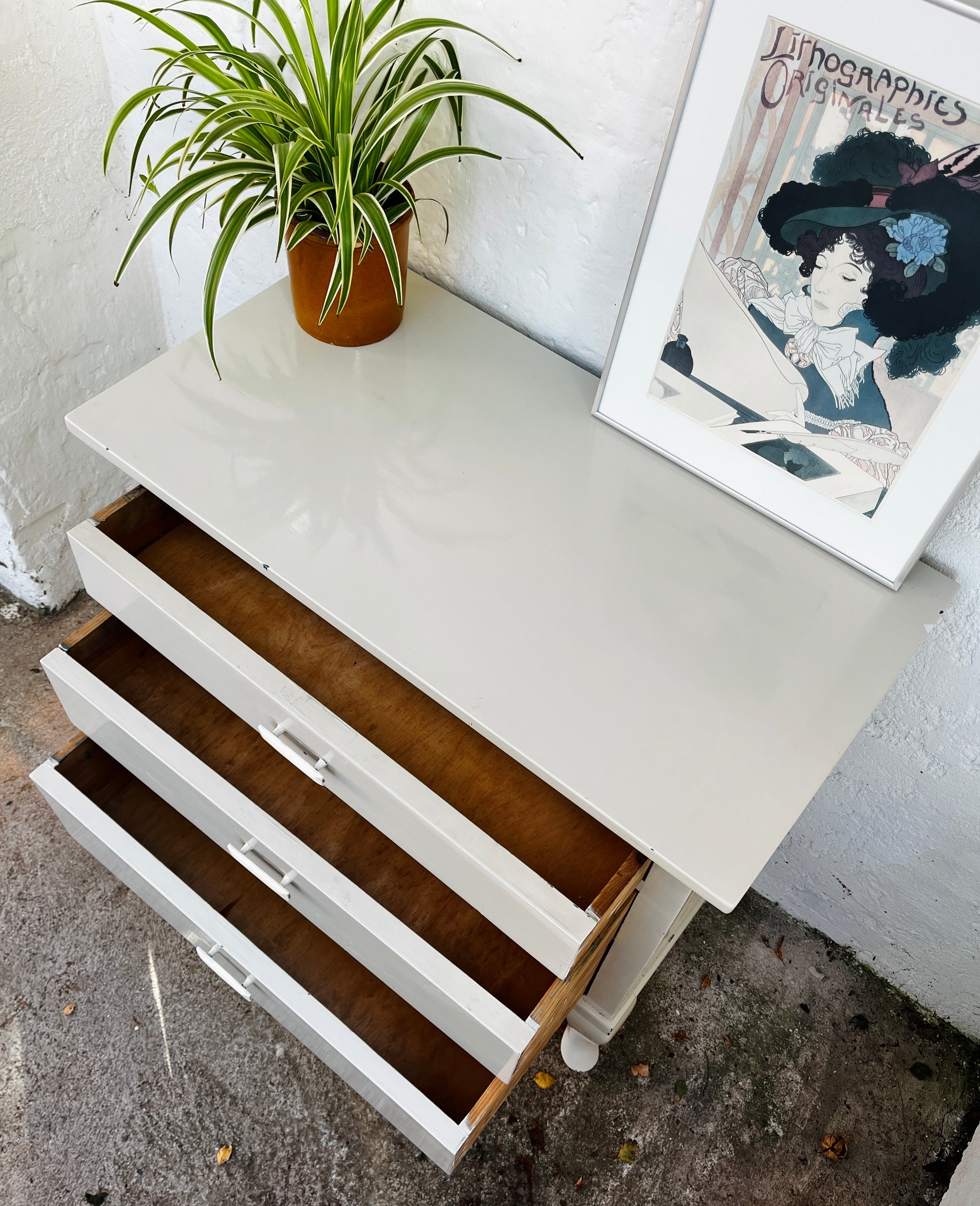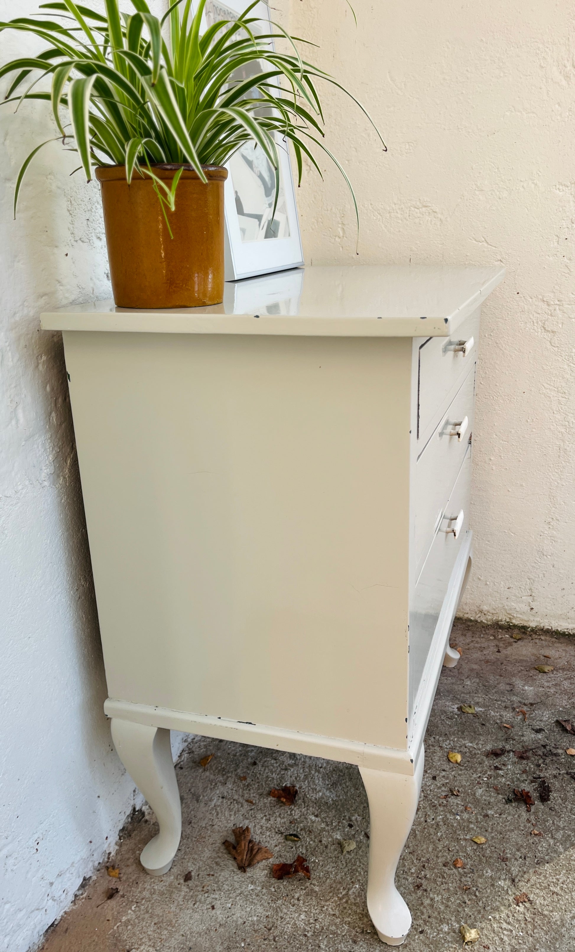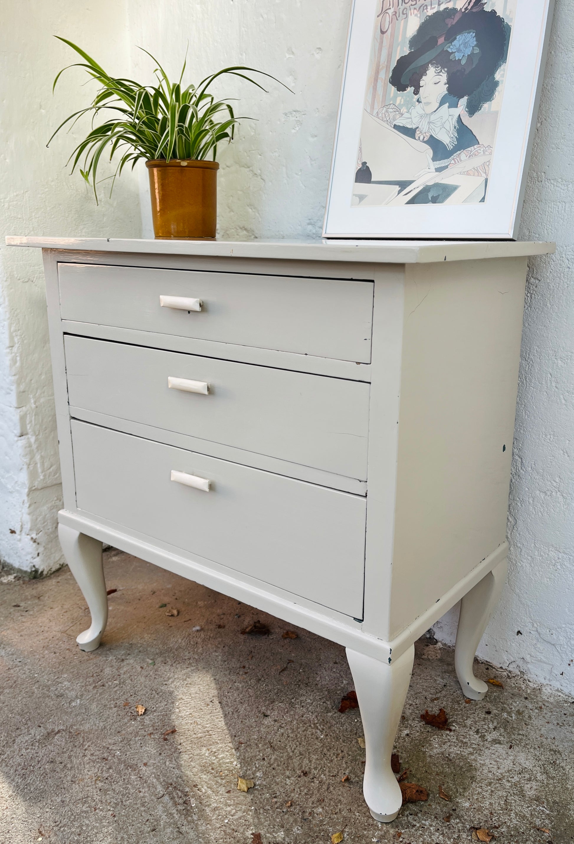 Charmerende kommode i massiv fyrretræ, malet i knækket hvid med blank finish. Skufferne glider let, og kommoden er i god vintage stand. Se billeder for detaljer og finish.