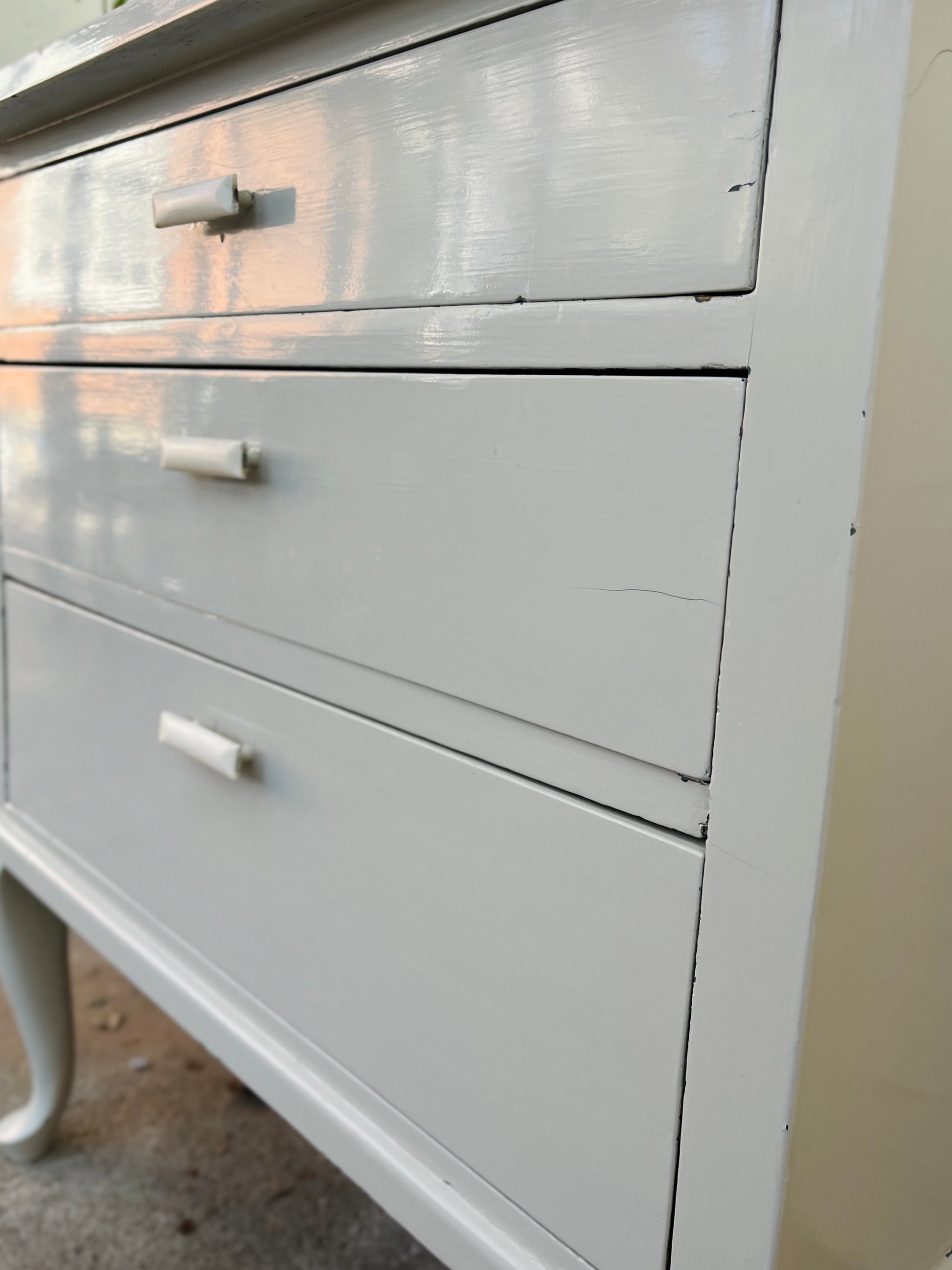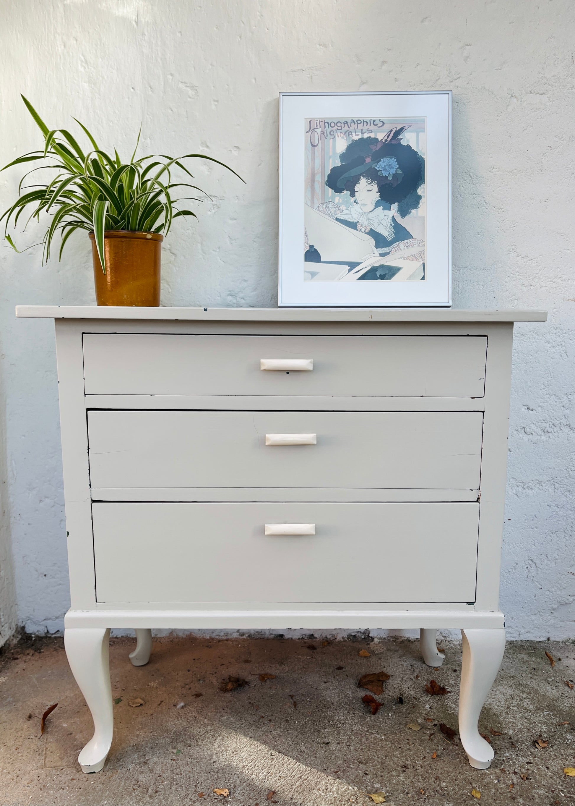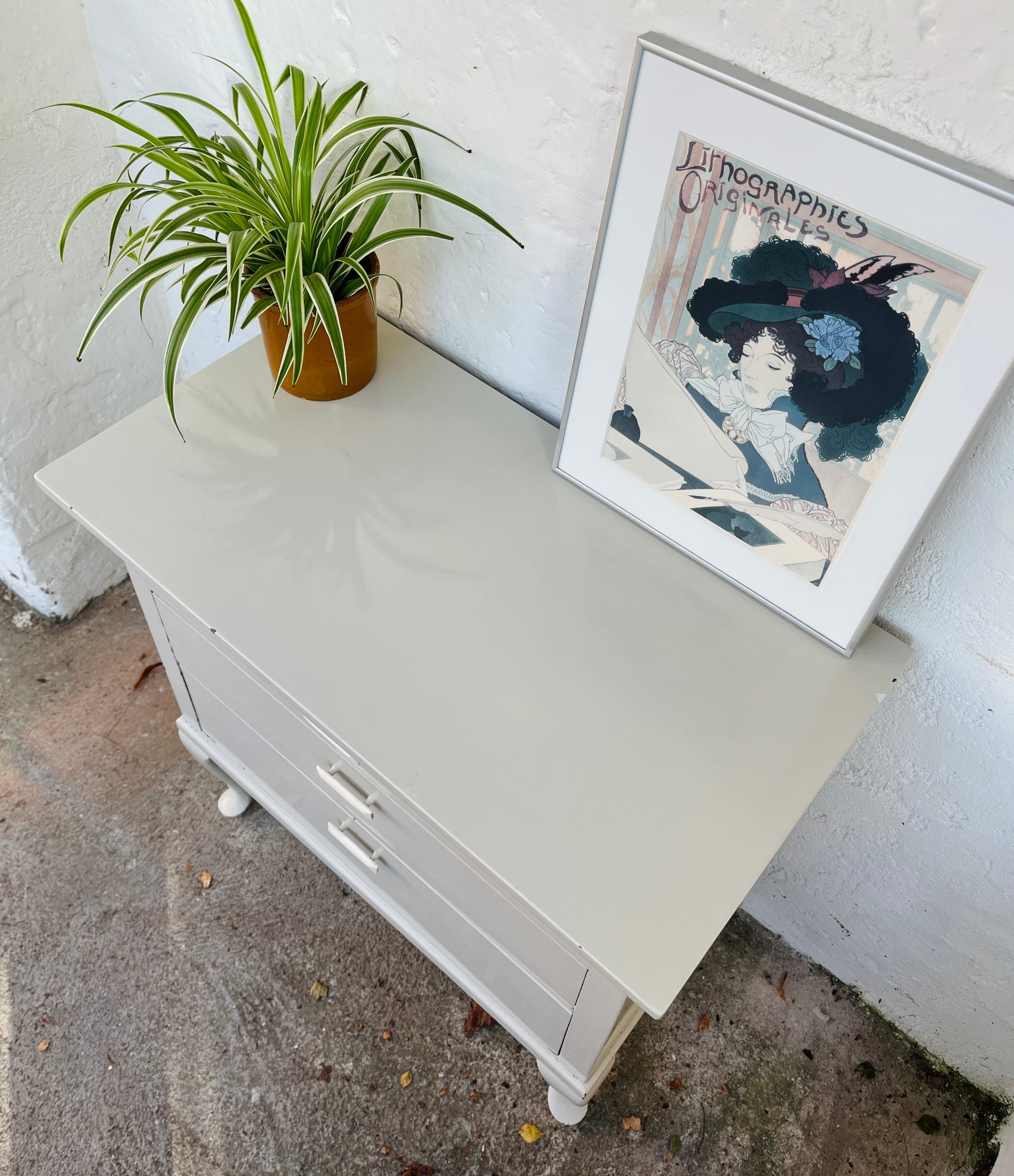 Charmerende kommode i massiv fyrretræ, malet i knækket hvid med blank finish. Skufferne glider let, og kommoden er i god vintage stand. Se billeder for detaljer og finish.