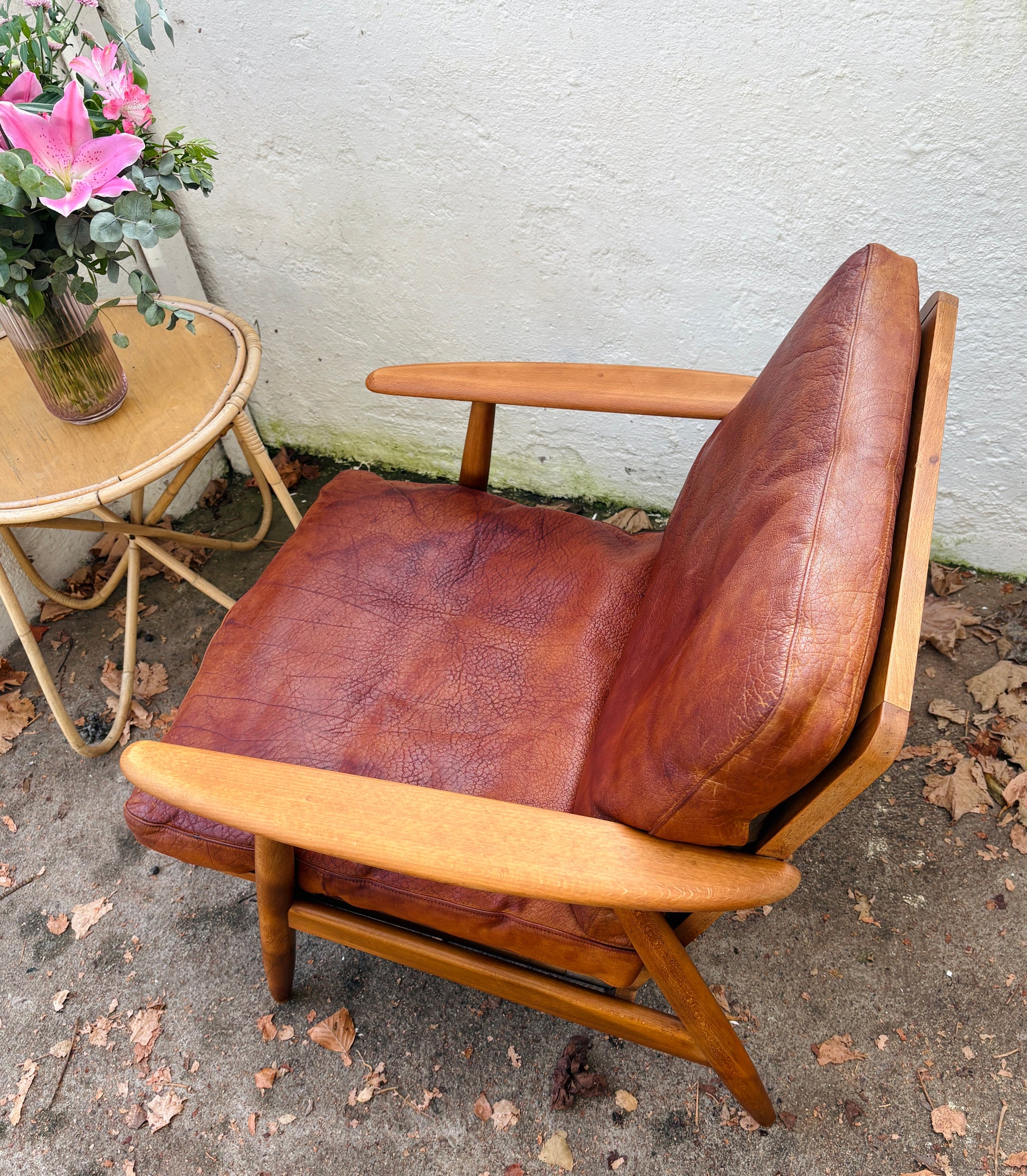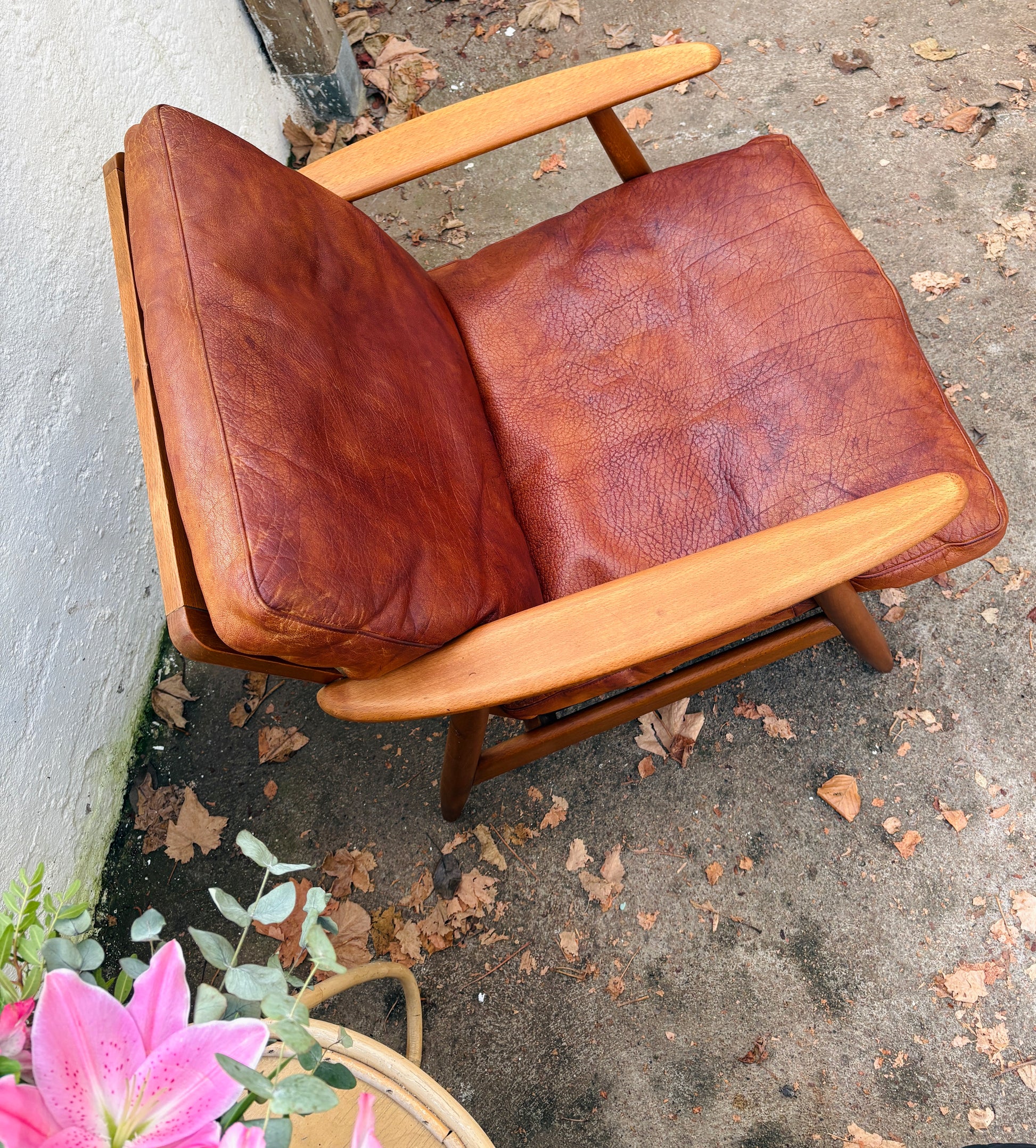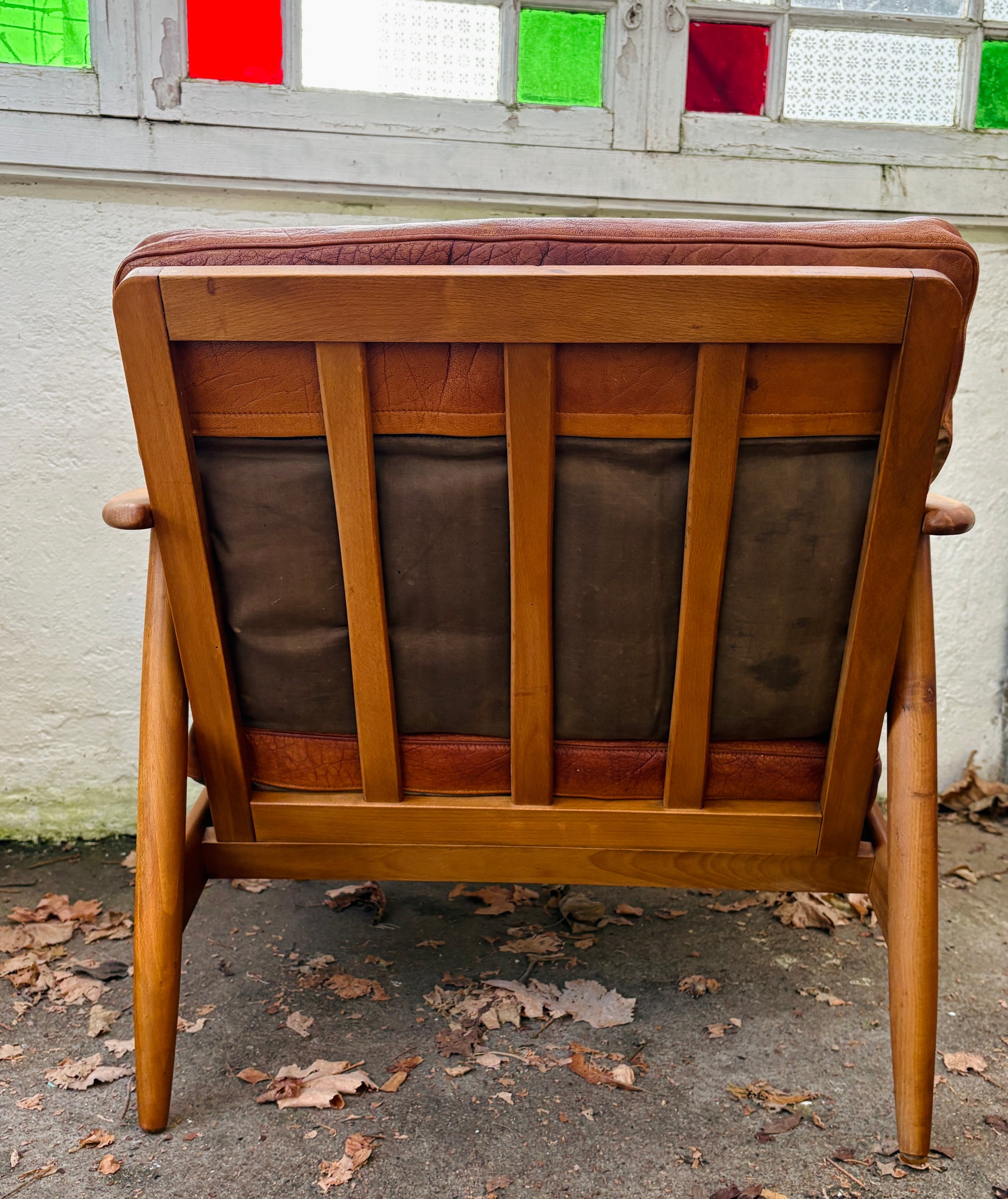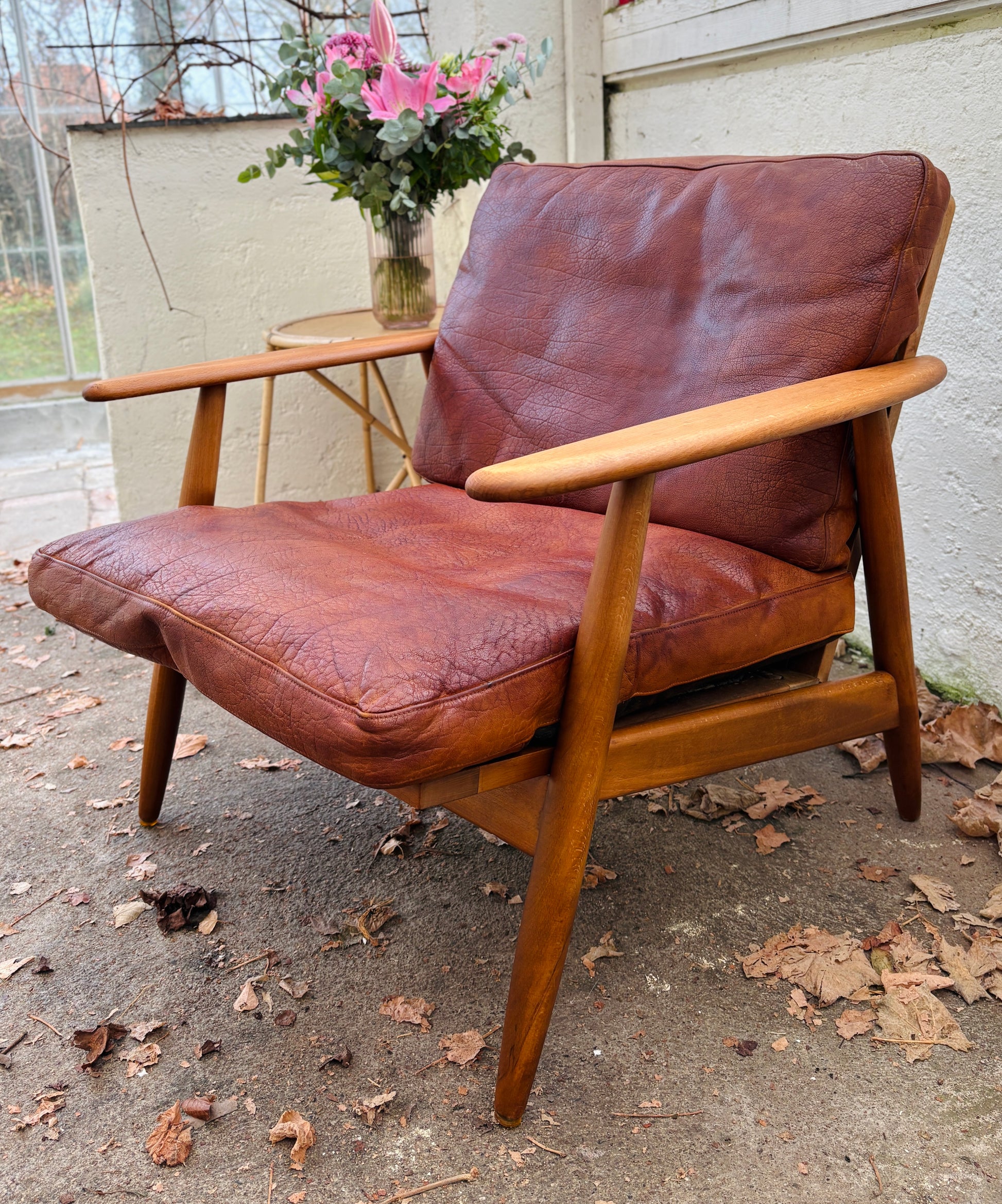 Klassisk retro lænestol i massiv bejdset bøg – en tidløs model med flot formgivning og behagelig siddekomfort. Aftagelige hynderne i læder (uoriginale) og gjorde i bunden for optimal støtte. Stolen står både stabil og intakt.