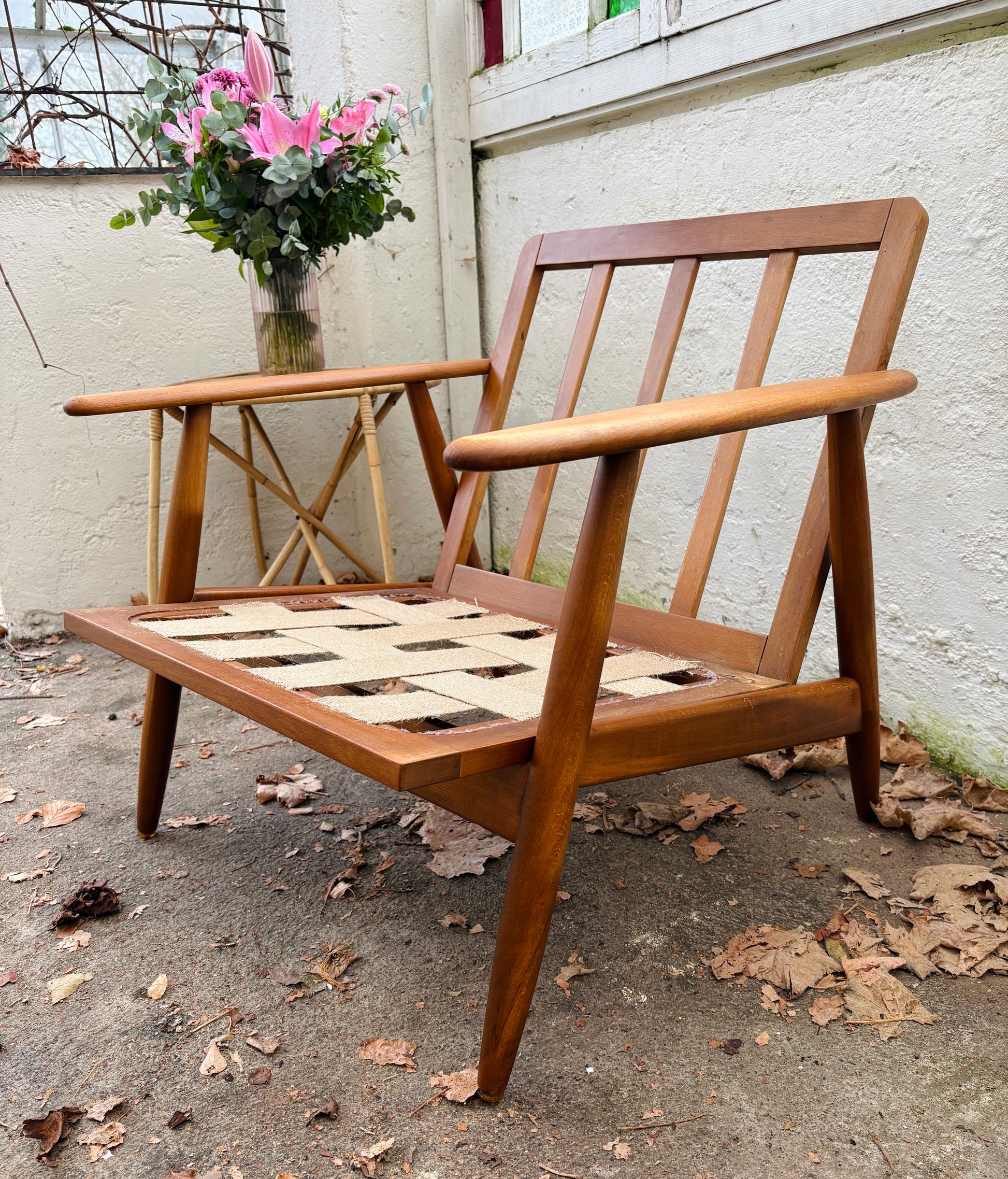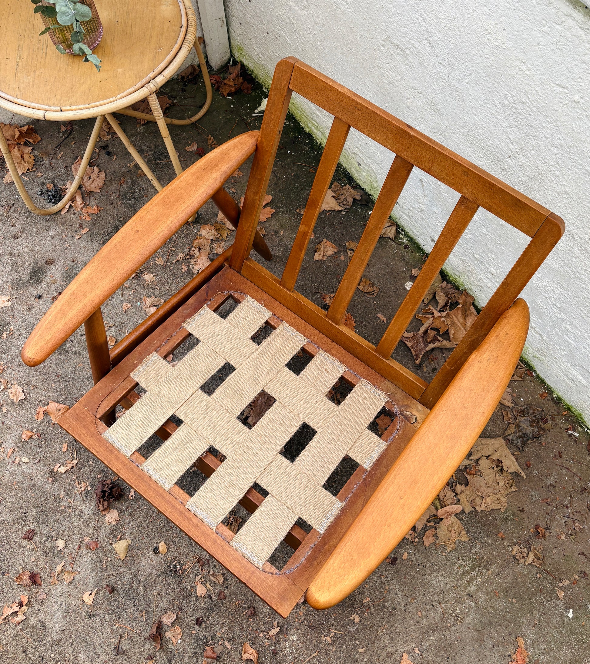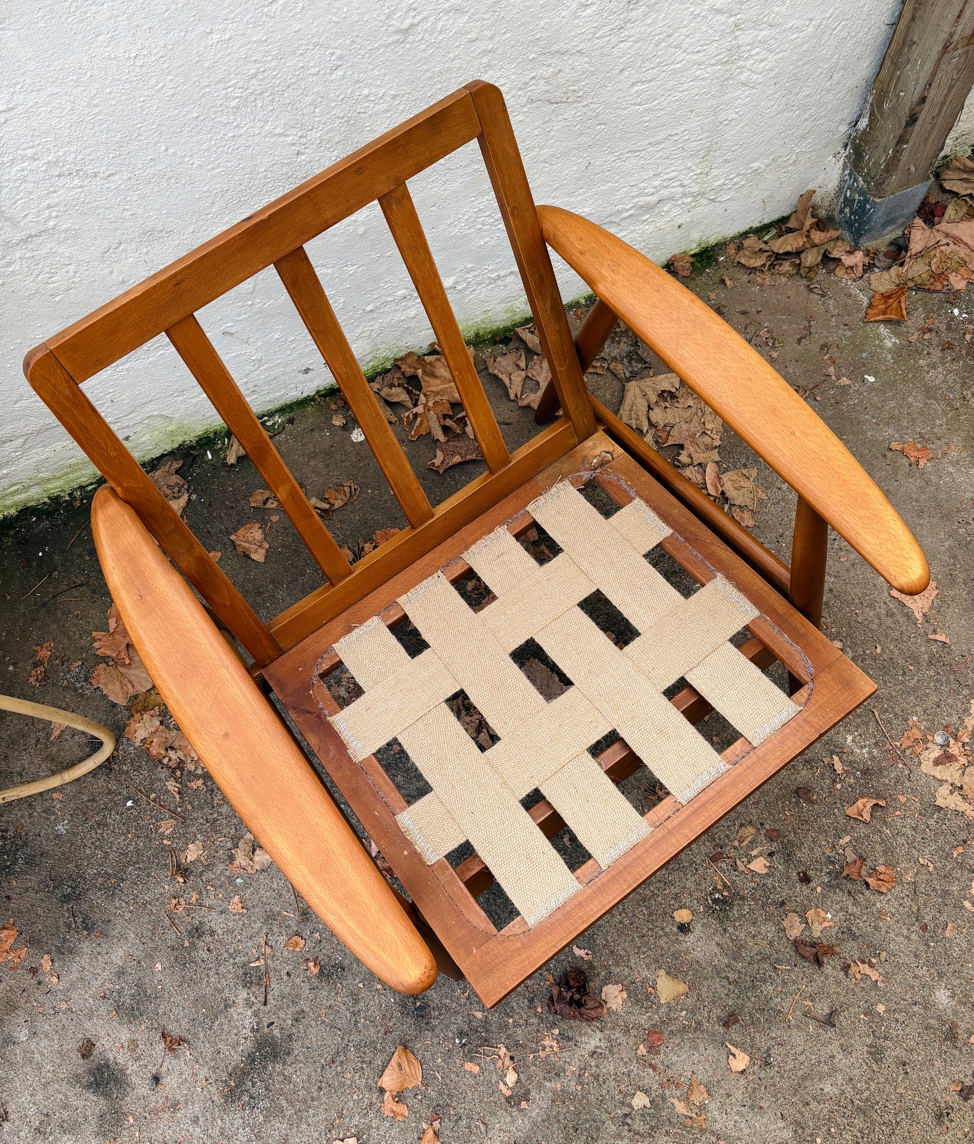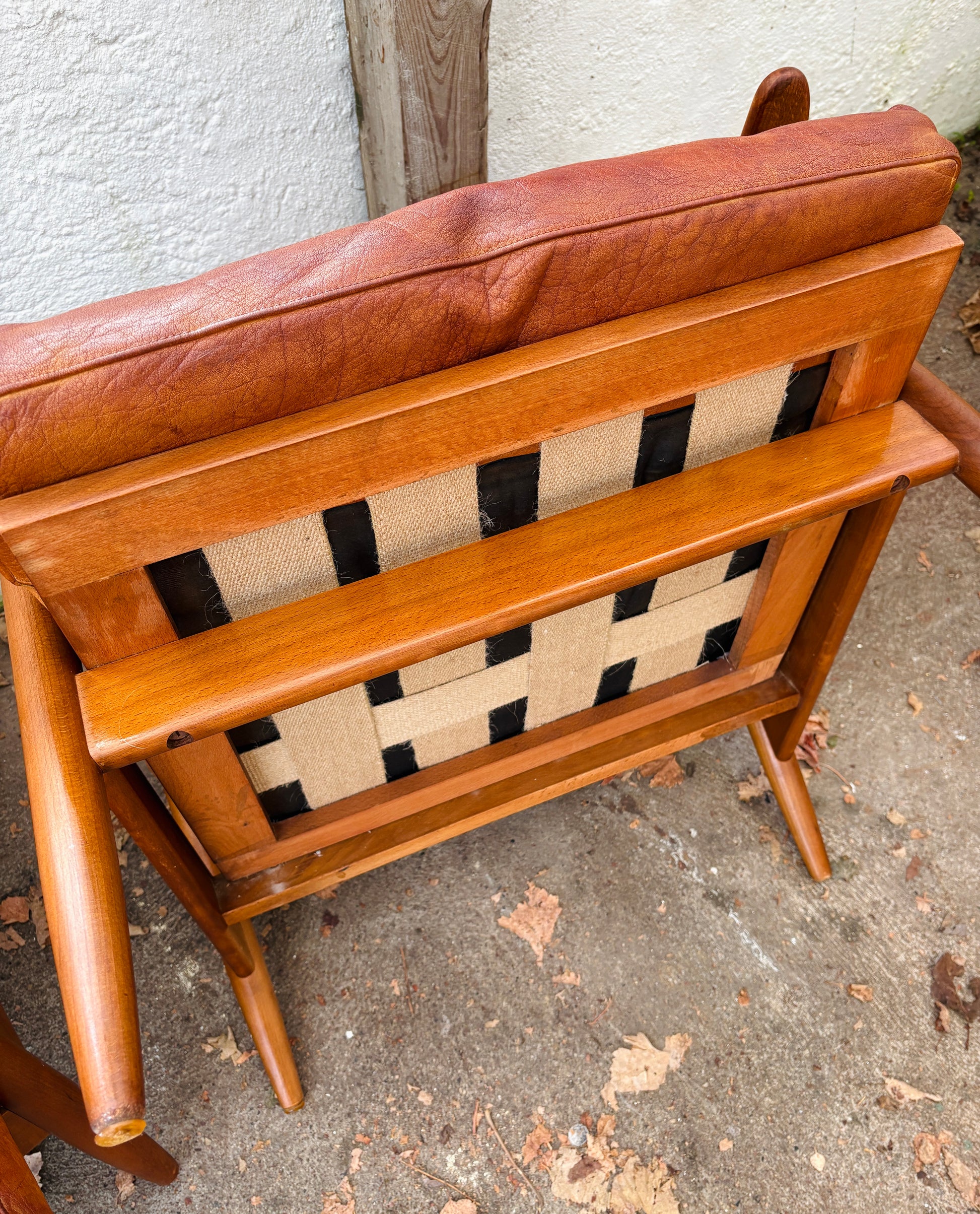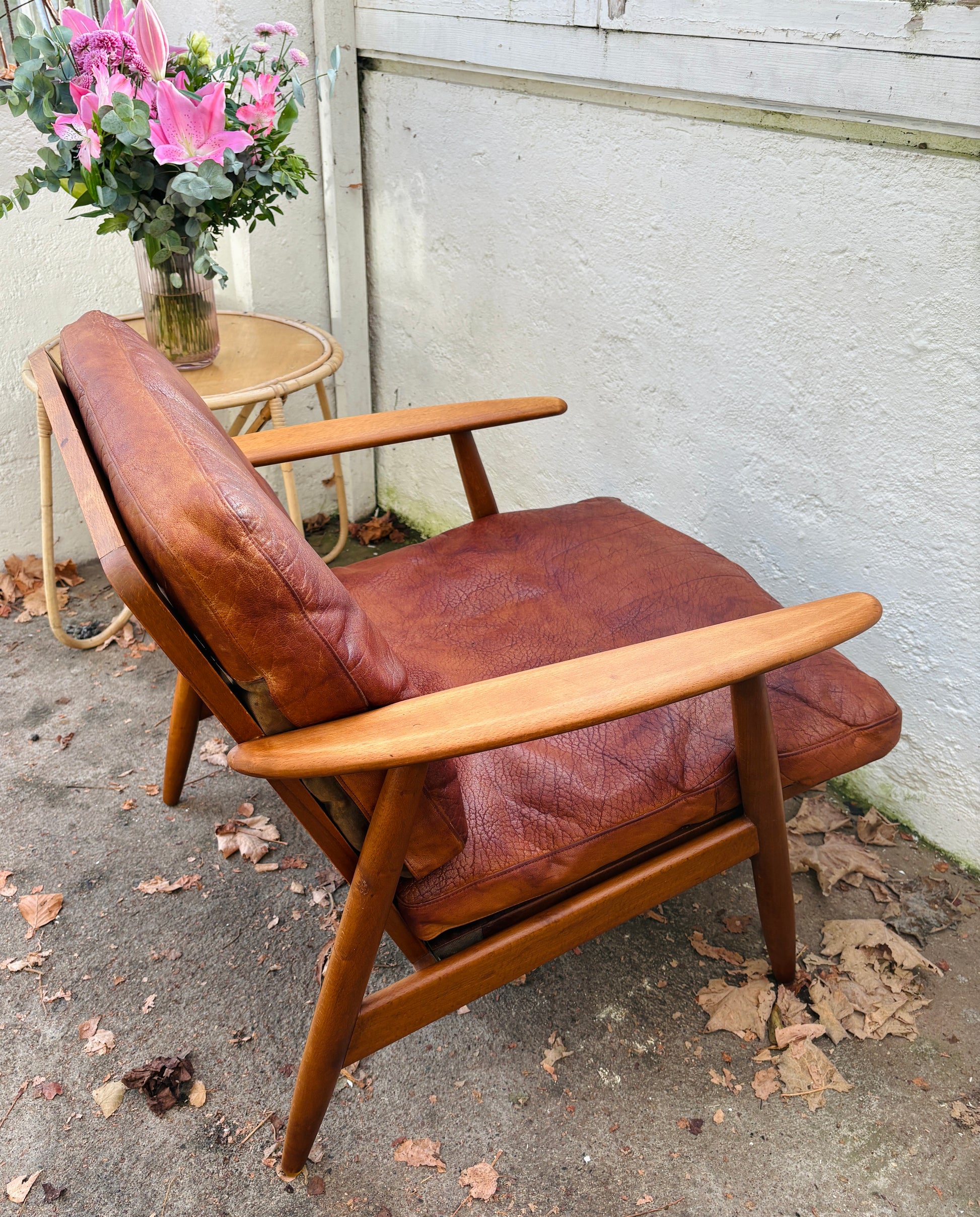 Klassisk retro lænestol i massiv bejdset bøg – en tidløs model med flot formgivning og behagelig siddekomfort. Aftagelige hynderne i læder (uoriginale) og gjorde i bunden for optimal støtte. Stolen står både stabil og intakt.