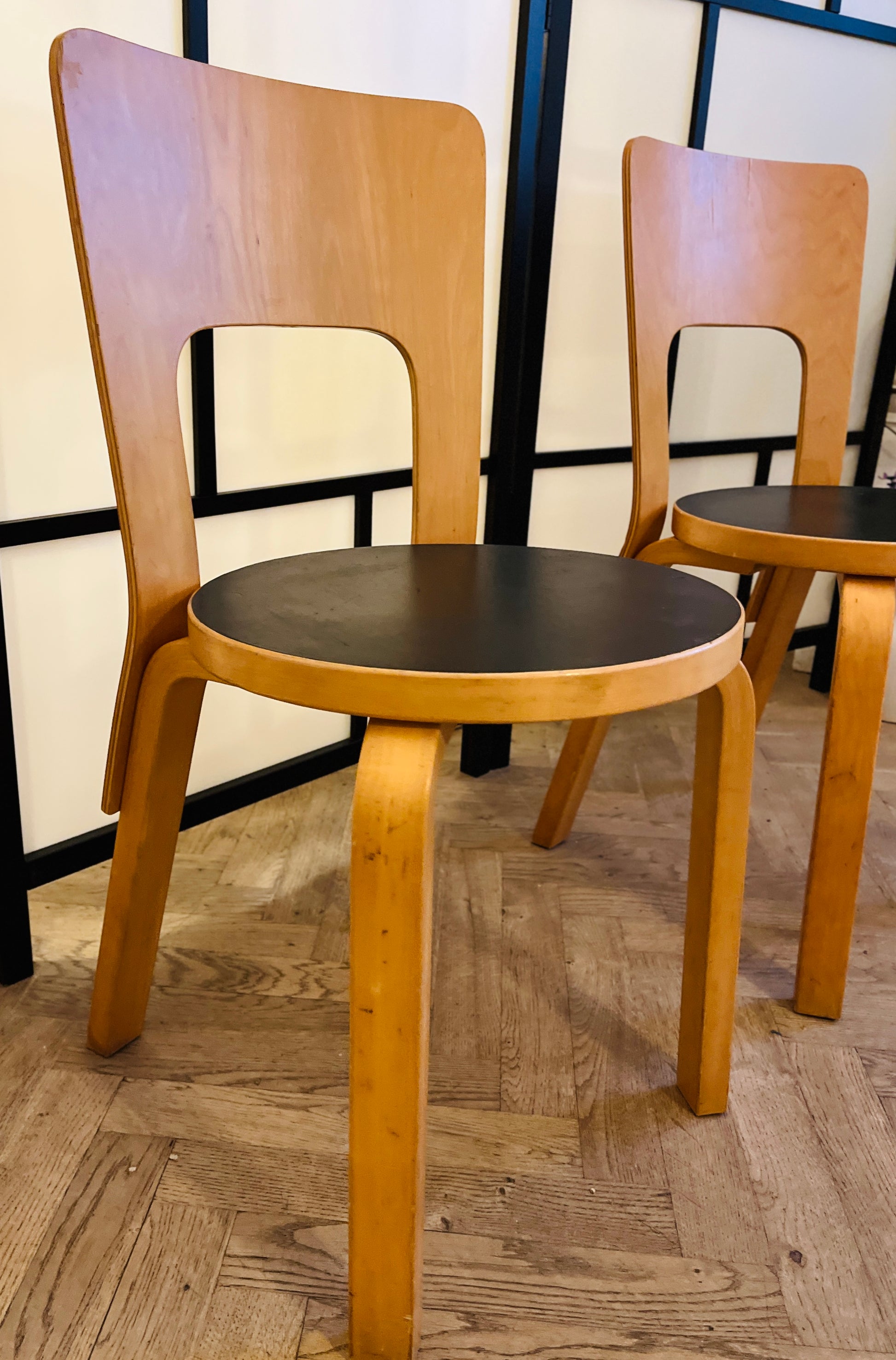 Sæt med to originale Alvar Aalto Model 66 stole, designet i 1935 og produceret af Artek. Model 66 er en klassiker fra Aalto, kendetegnet ved det ikoniske bøjede birkestel, det organiske formsprog og det enkle, farvede sæde.