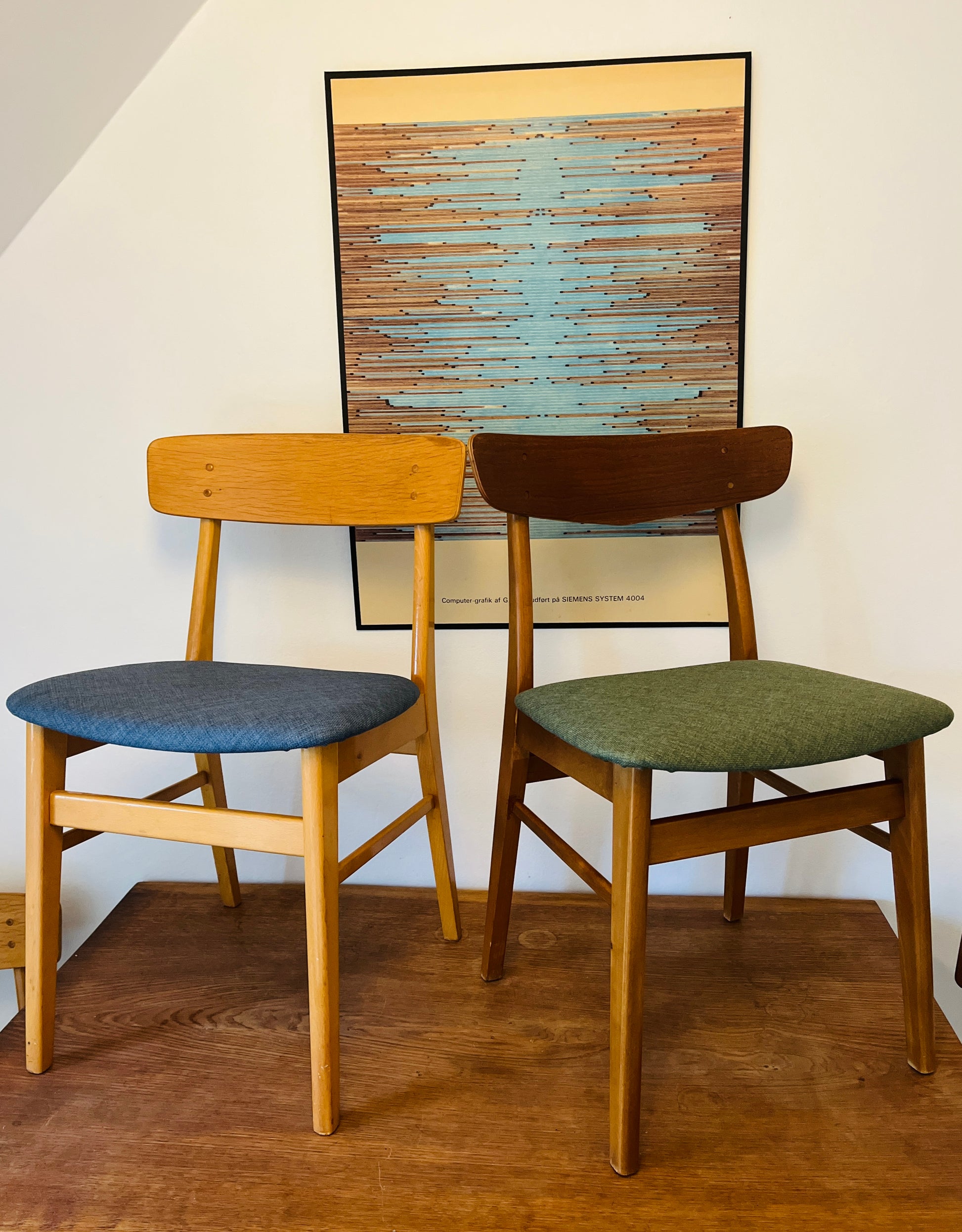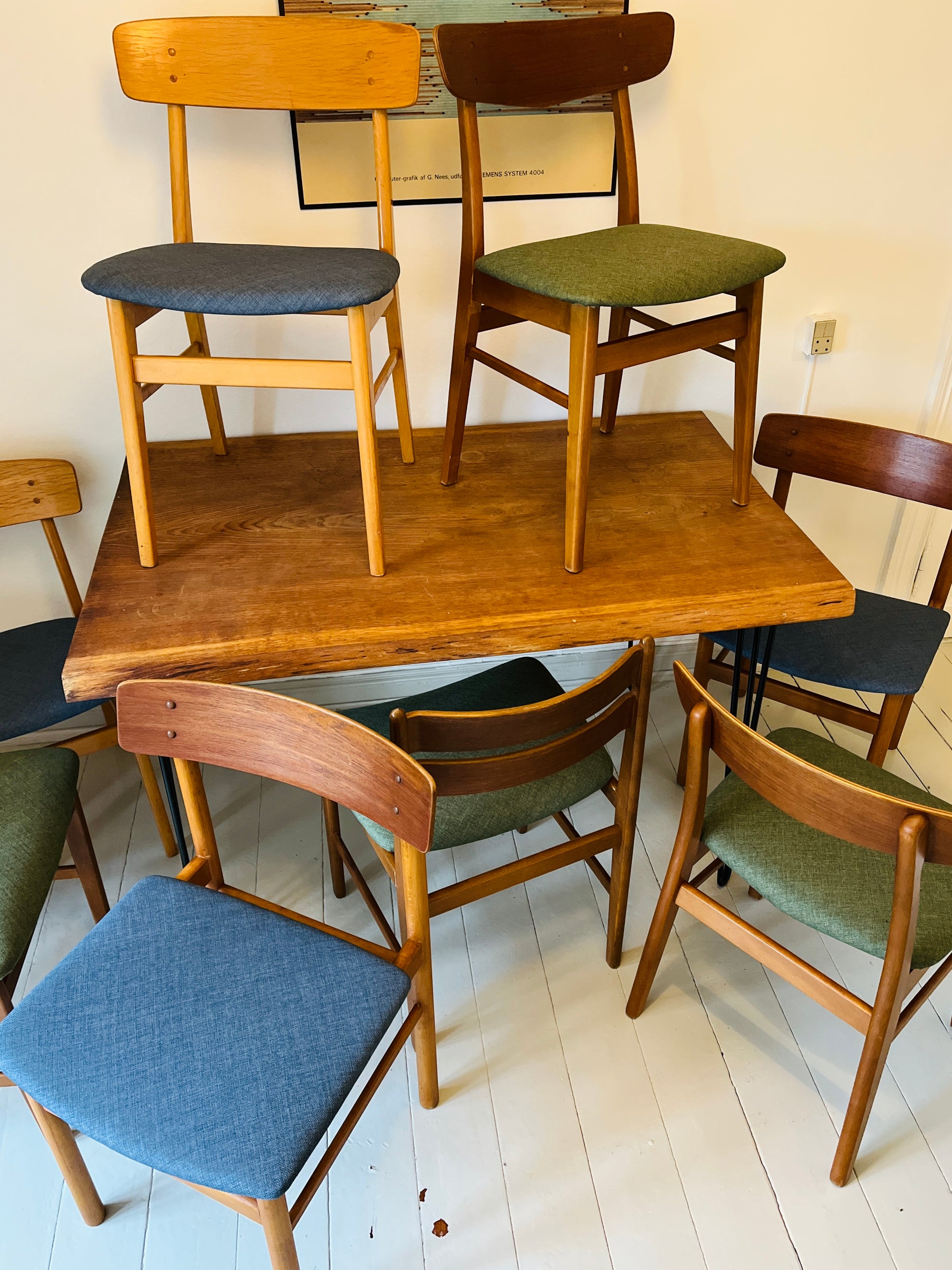 Samling af spisebordsstole fra 1960erne med hver deres charme. Forskellige modeller med fælles træk: stel af bøg og ryg af teak eller eg.