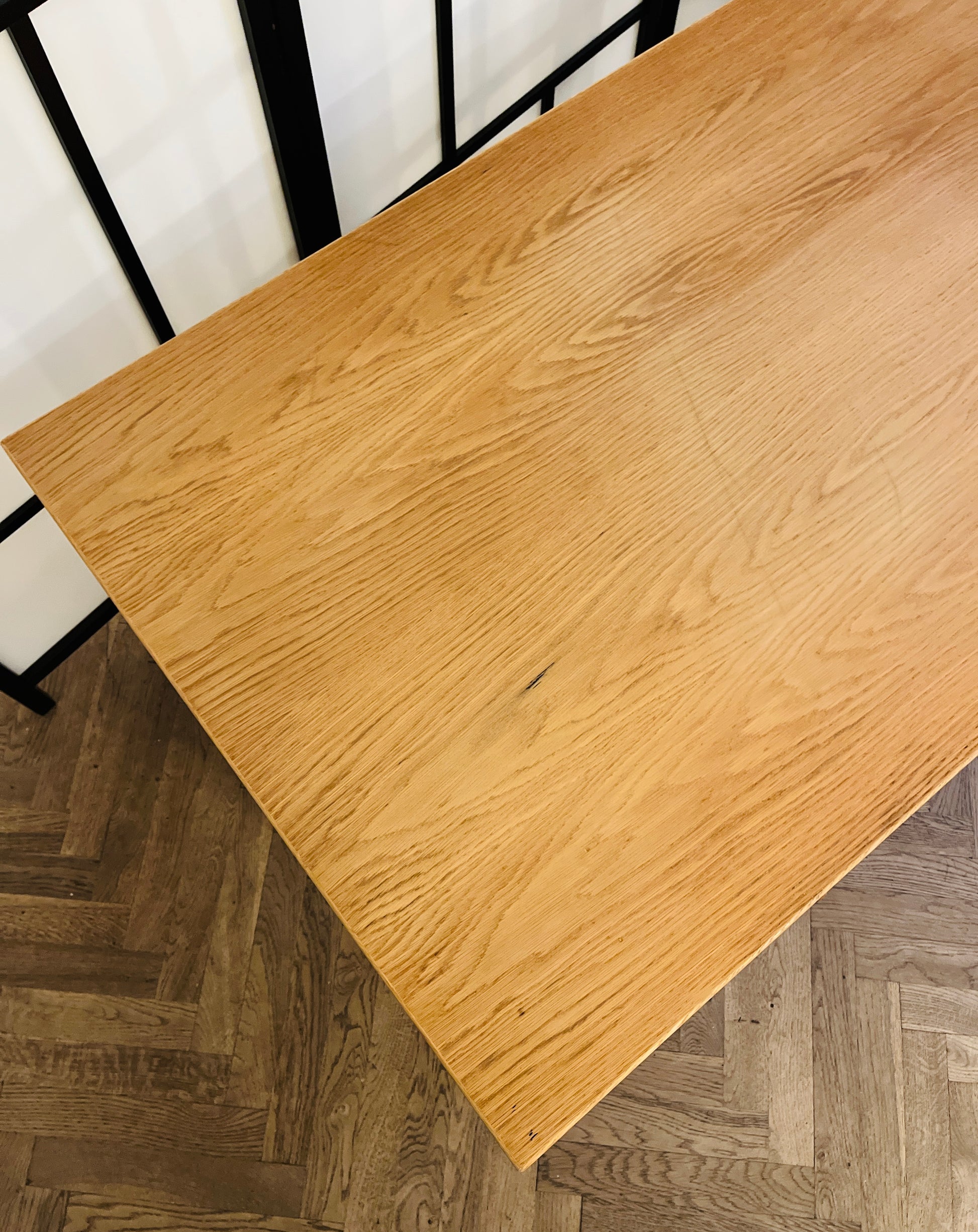 Klassisk skrivebord fra 1960’erne, designet af Hans J. Wegner og udført i massivt og fineret egetræ. Bordet har to rummelige skuffer og kan stå frit i rummet, så det både fungerer som arbejdsbord og som et flot designmøbel.