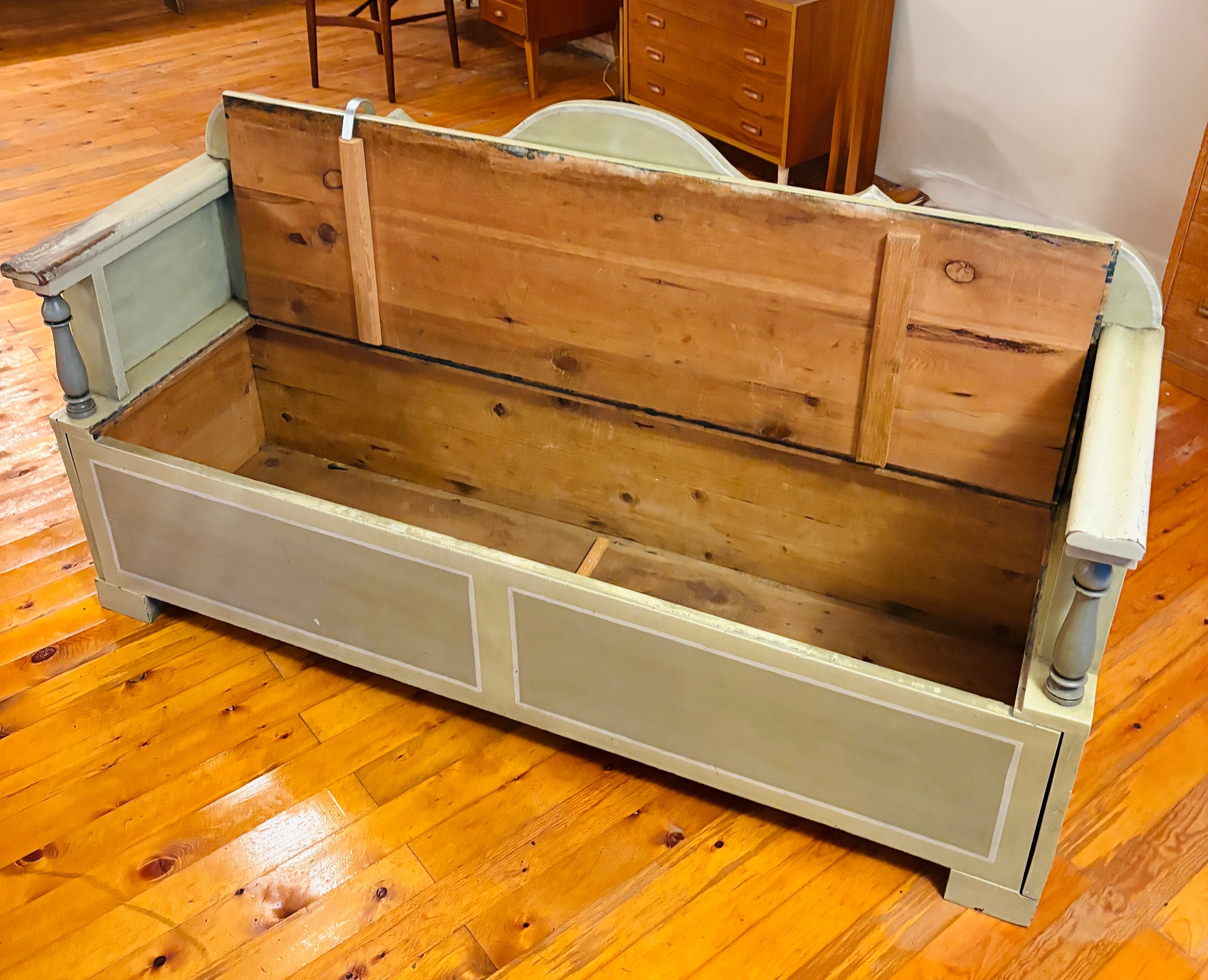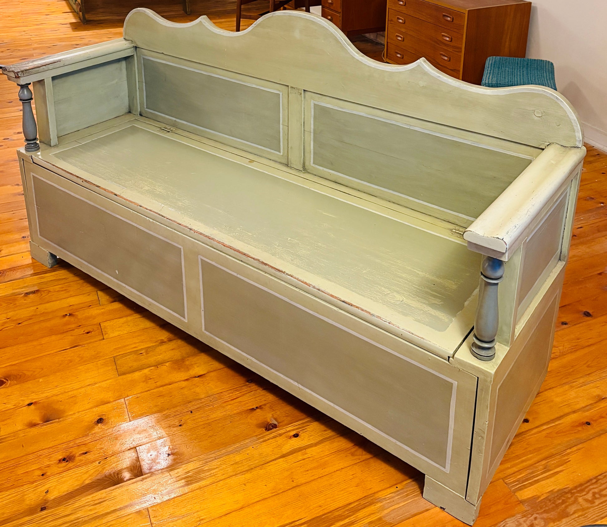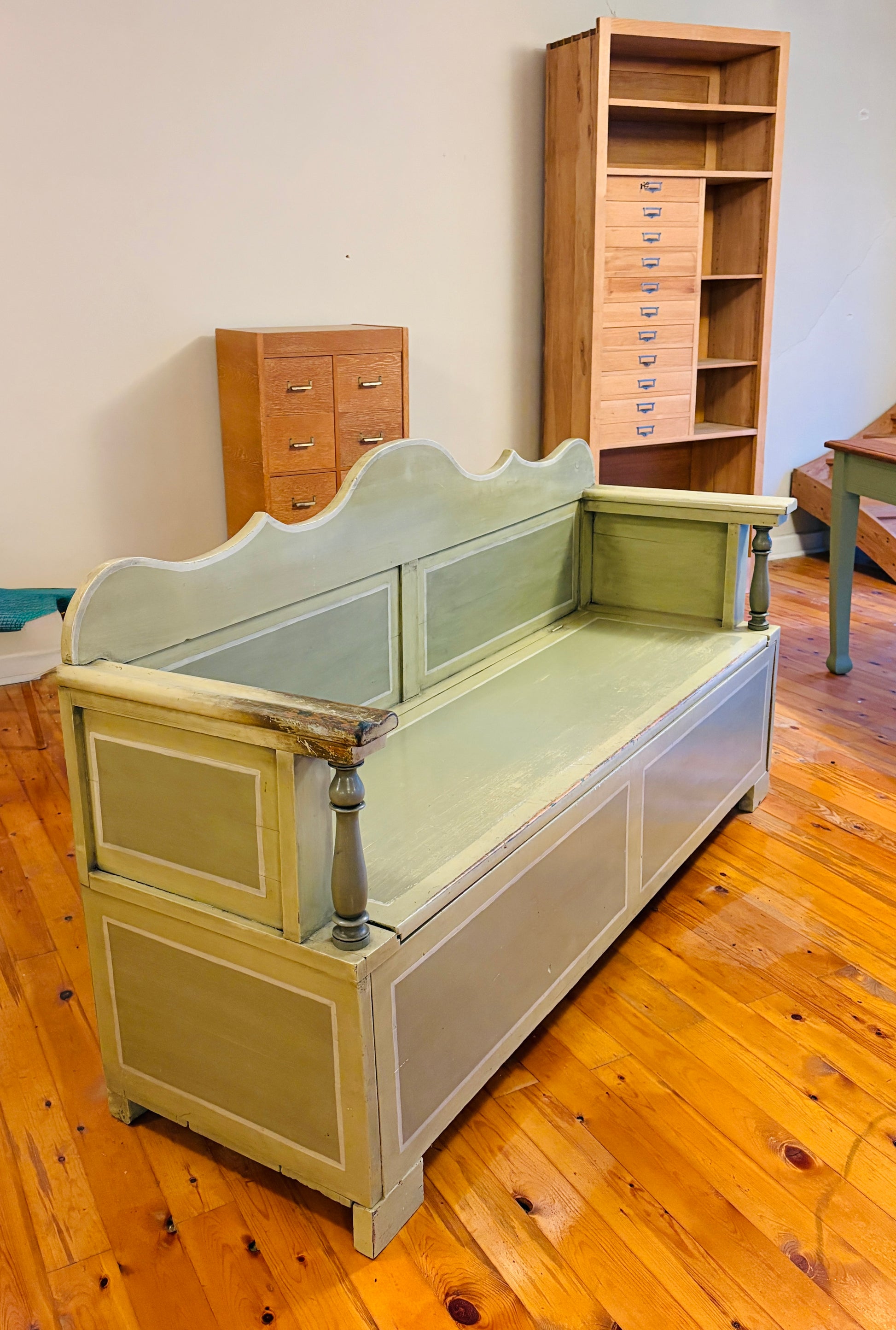 Svensk slagbænk med praktisk opbevaringsplads under sædet og mulighed for udtræk. Bænken har fine, håndværksmæssige detaljer og er malet i smukke grønne nuancer, som giver den et karakterfuldt udtryk.