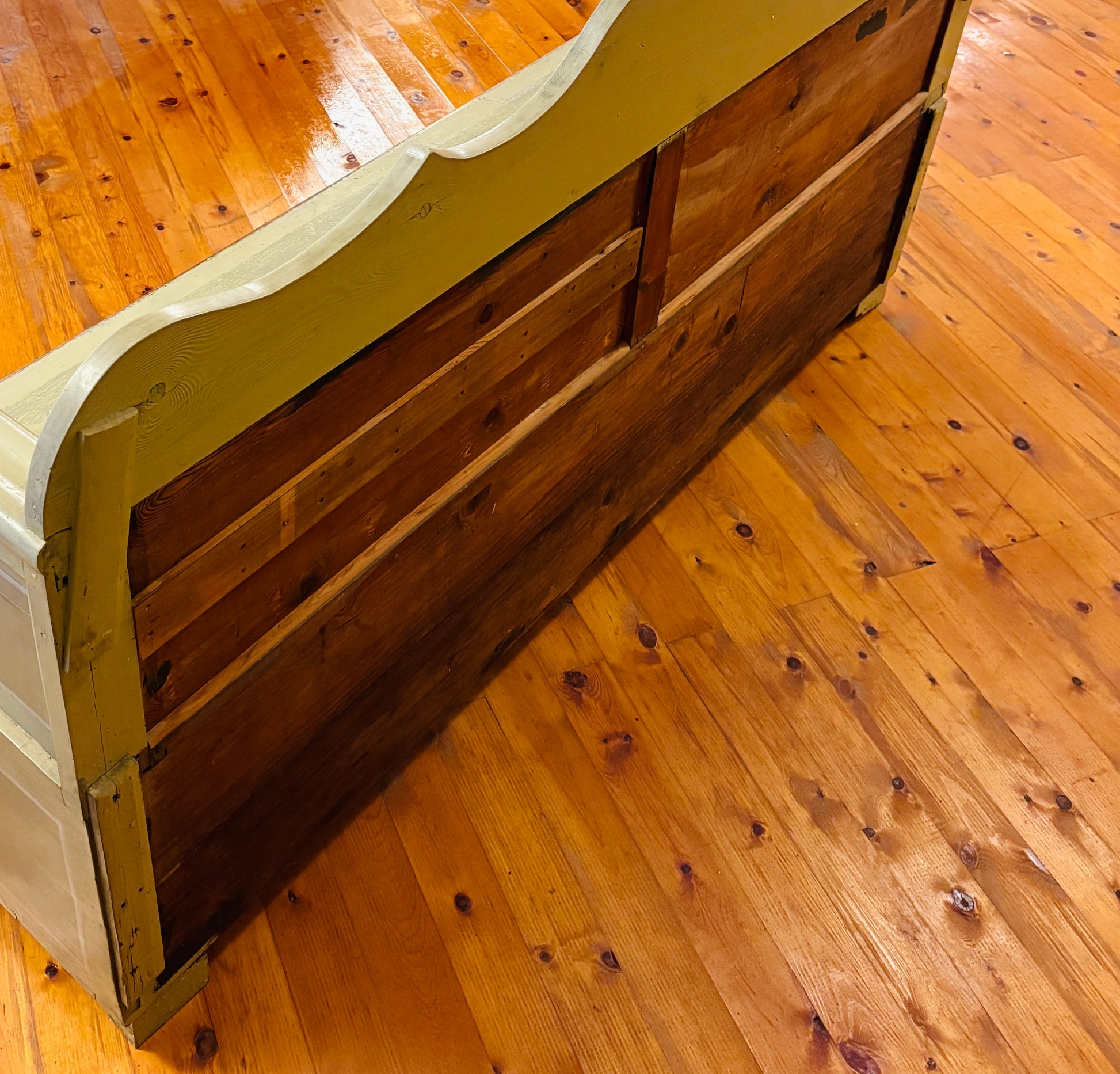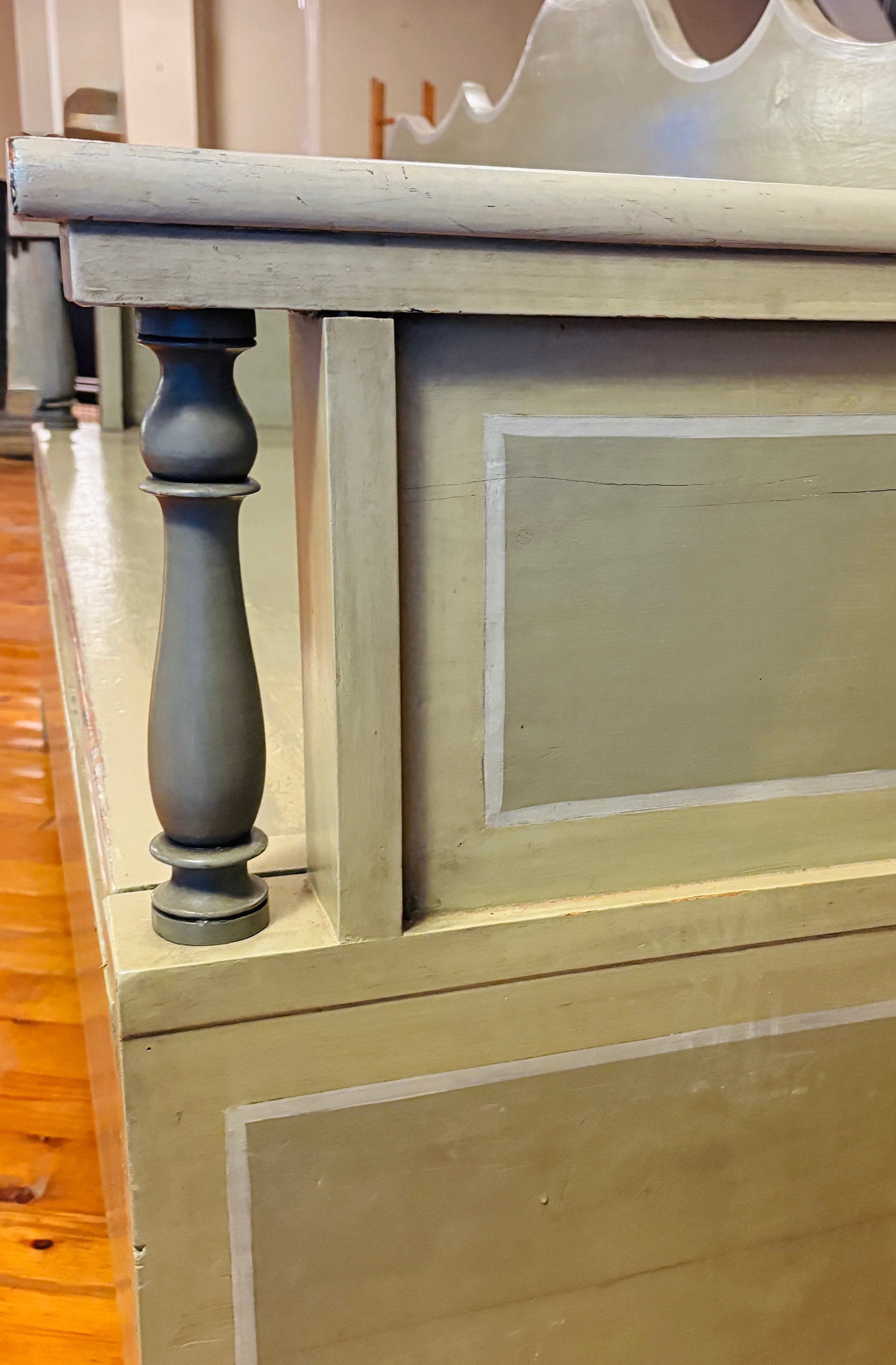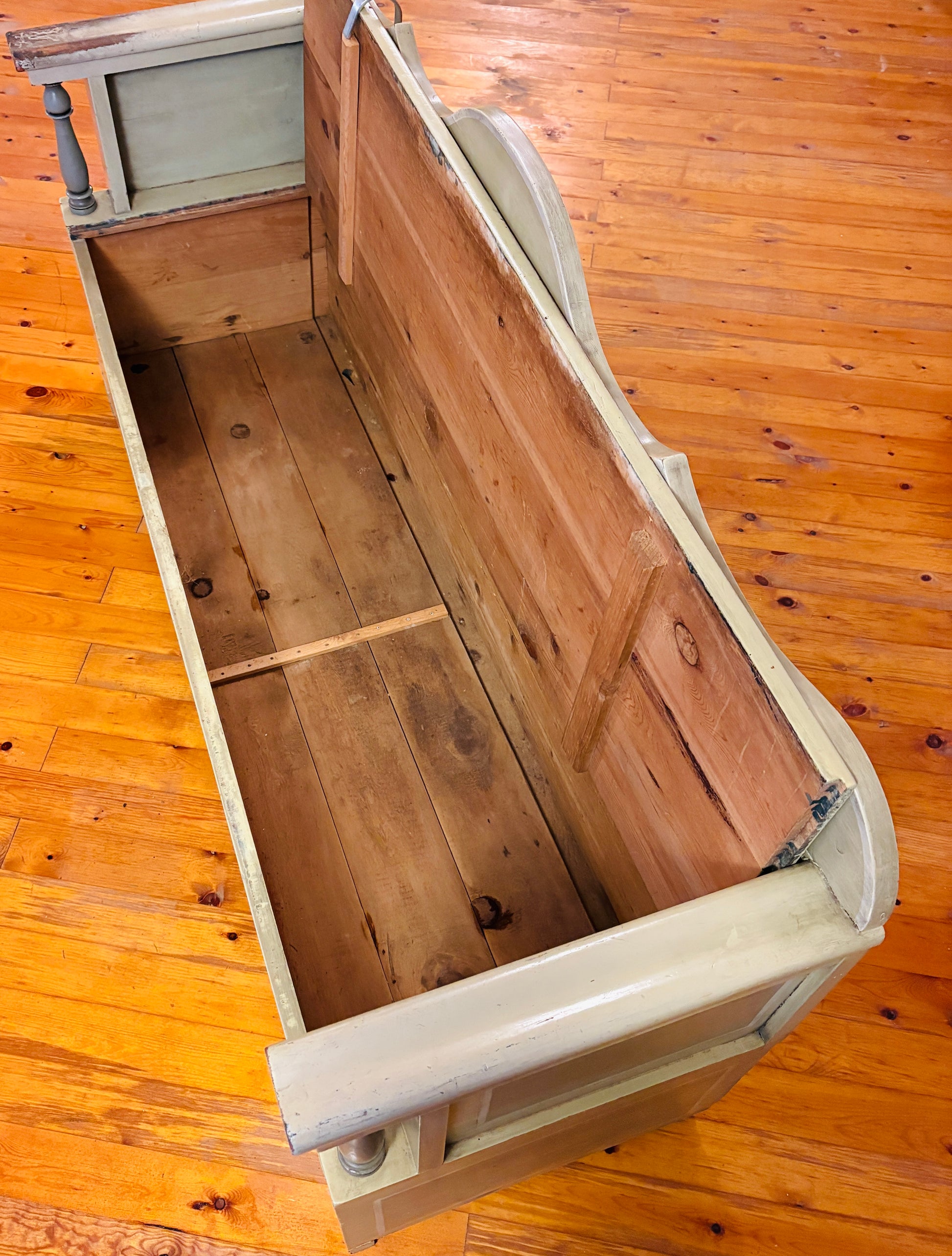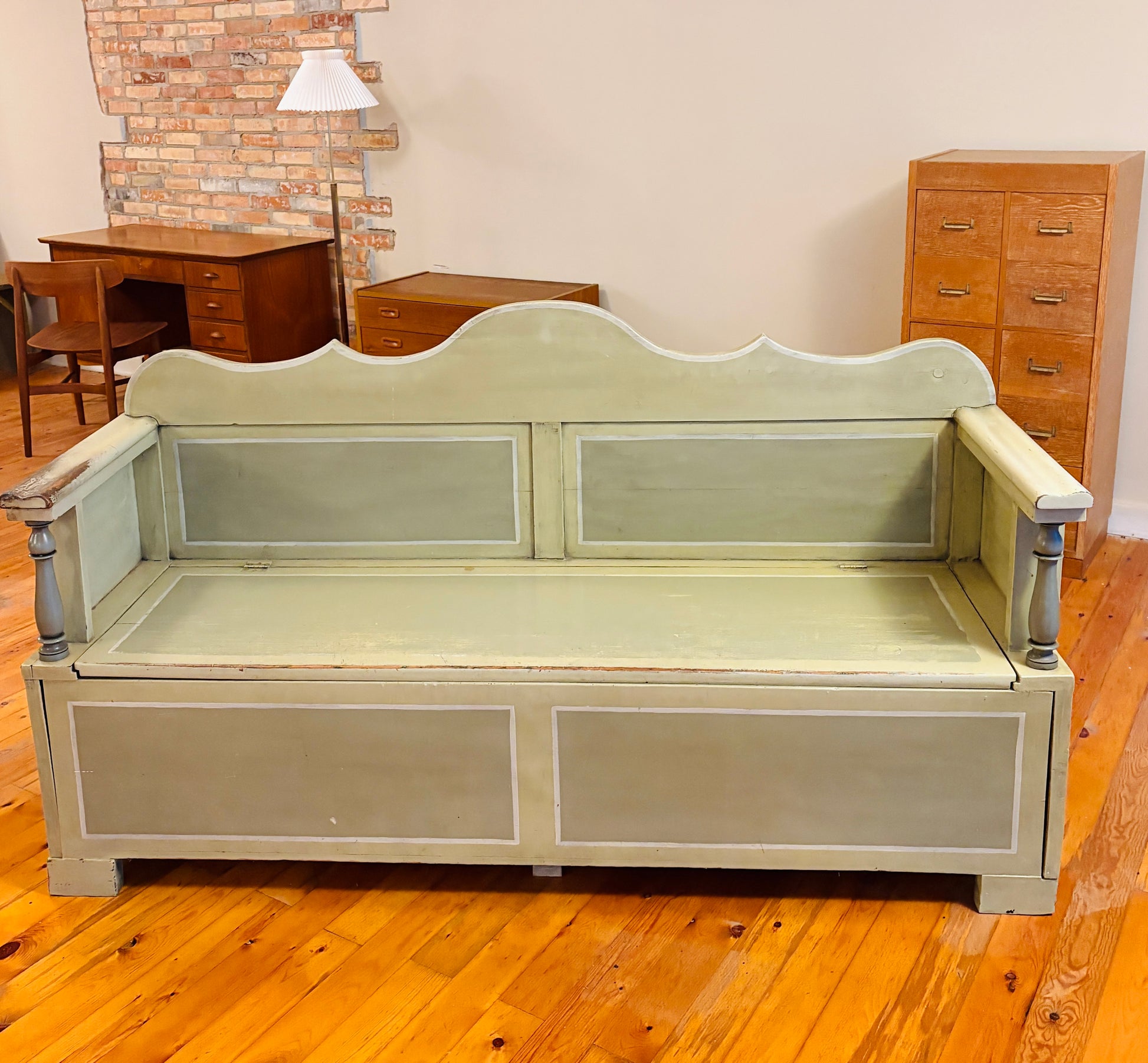 Svensk slagbænk med praktisk opbevaringsplads under sædet og mulighed for udtræk. Bænken har fine, håndværksmæssige detaljer og er malet i smukke grønne nuancer, som giver den et karakterfuldt udtryk.