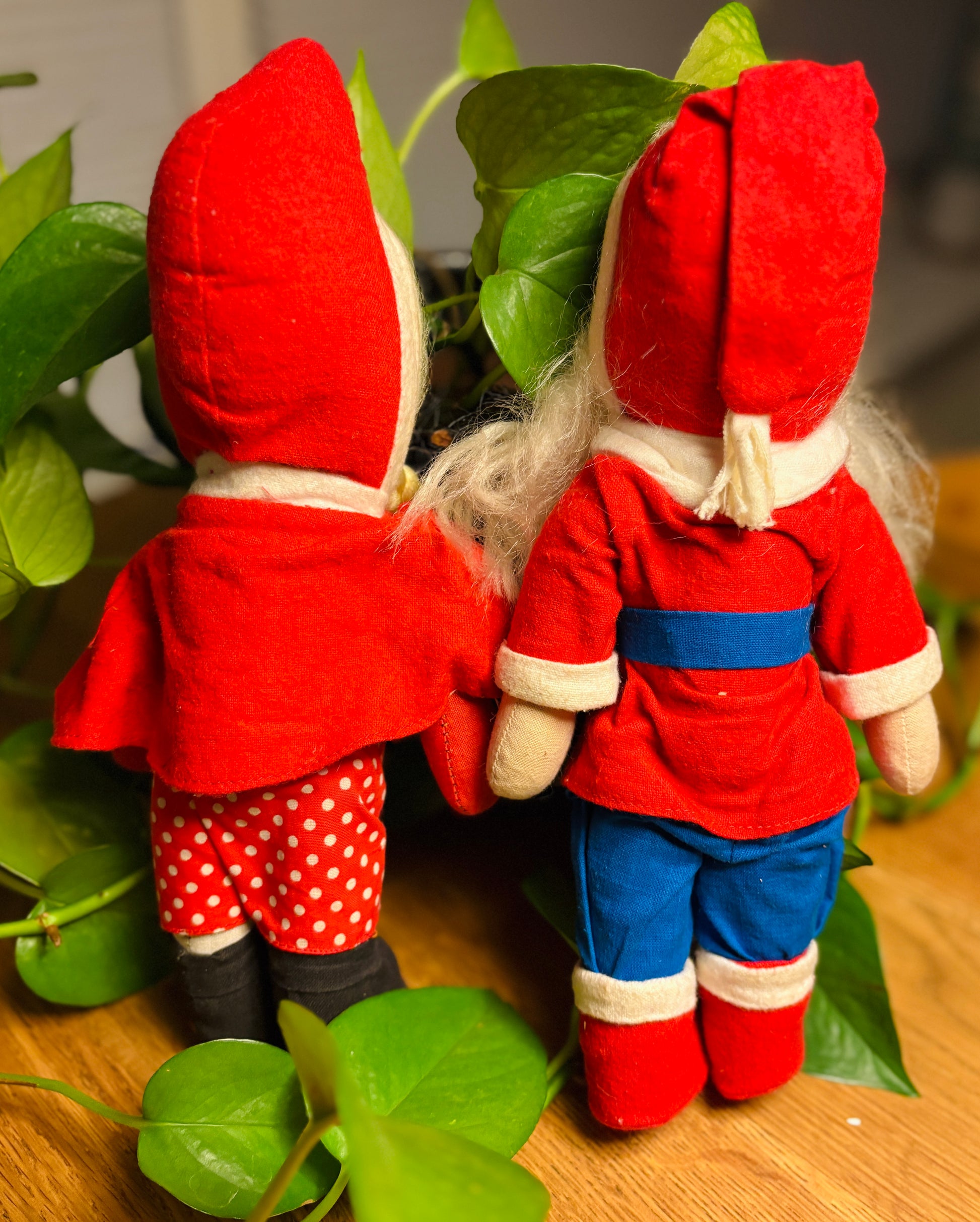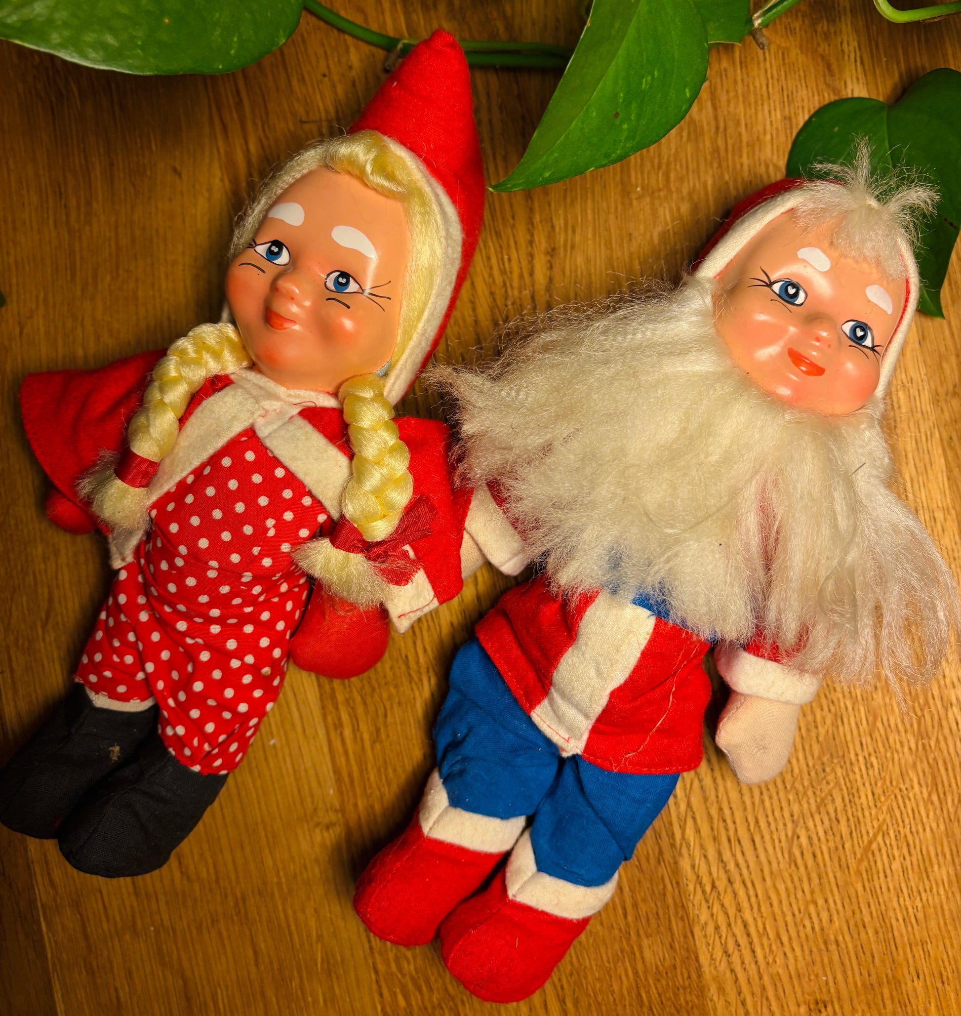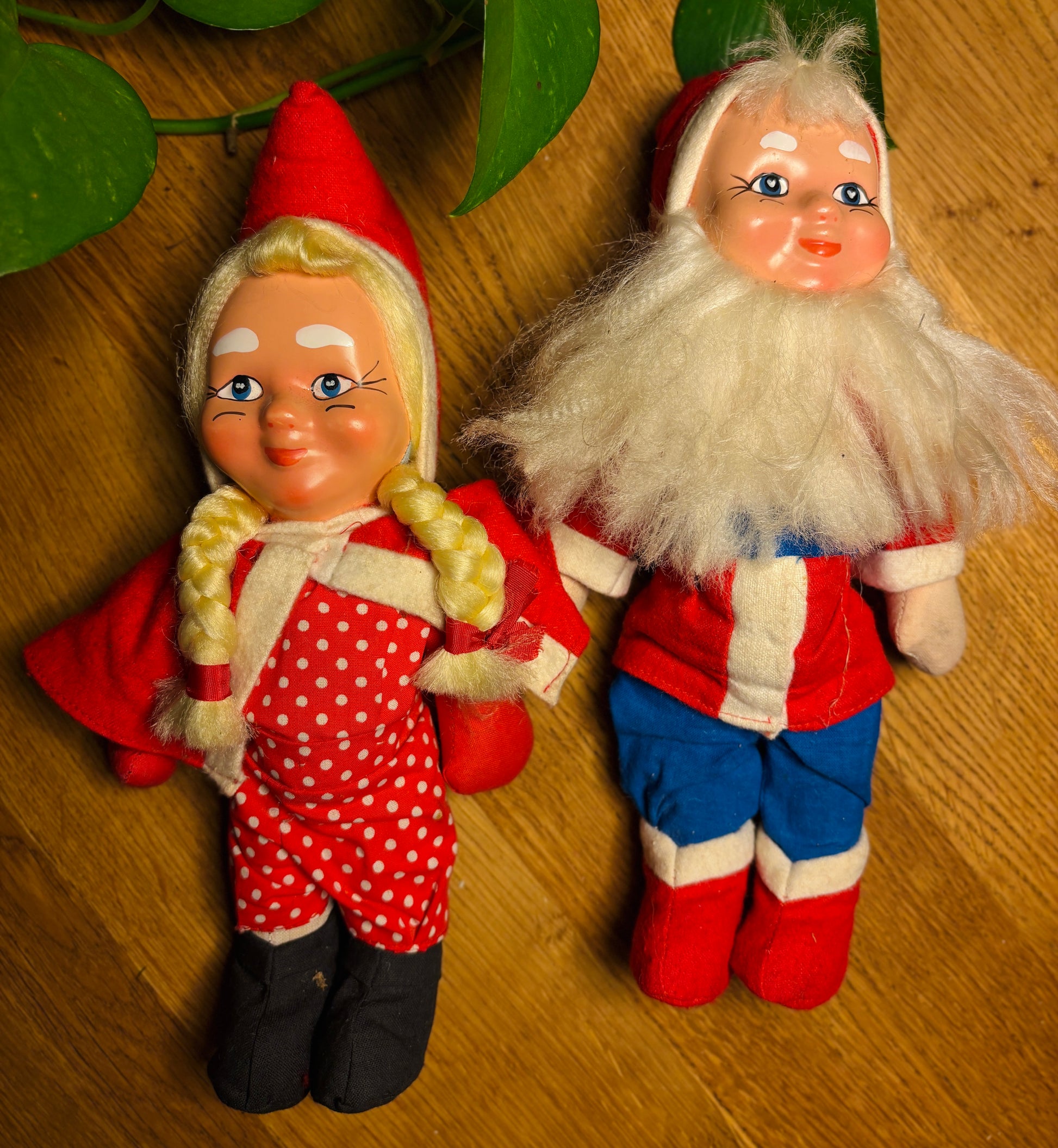 De fine stofnisser har de klassiske ansigter i kunststof, filtbeklædning og ulddetaljer. Sættet består af en nissepige med fletninger og en nisse med stort hvidt skæg. Pæn vintage-stand med alderstypisk patina. Se billeder for detaljer og stand.