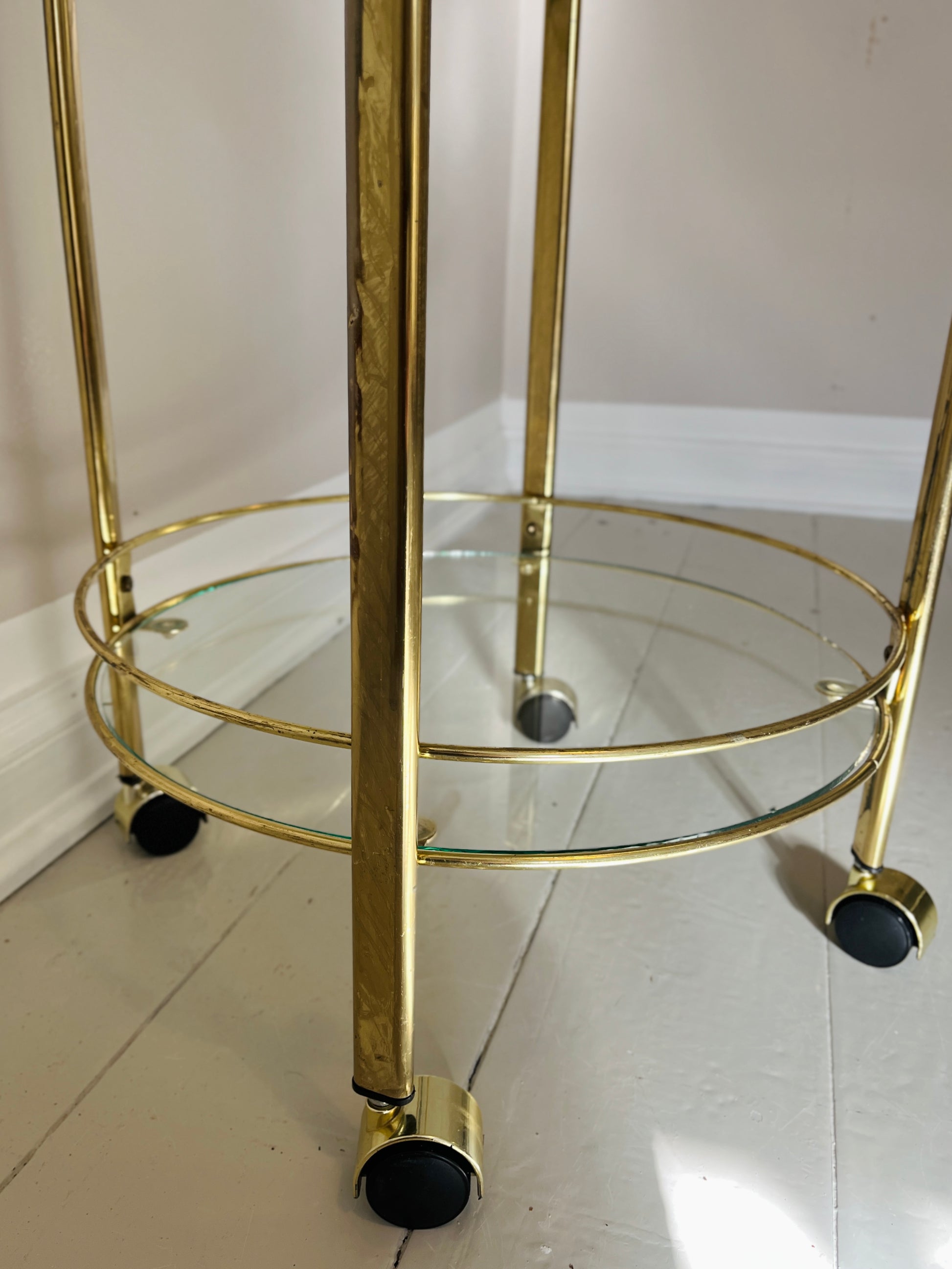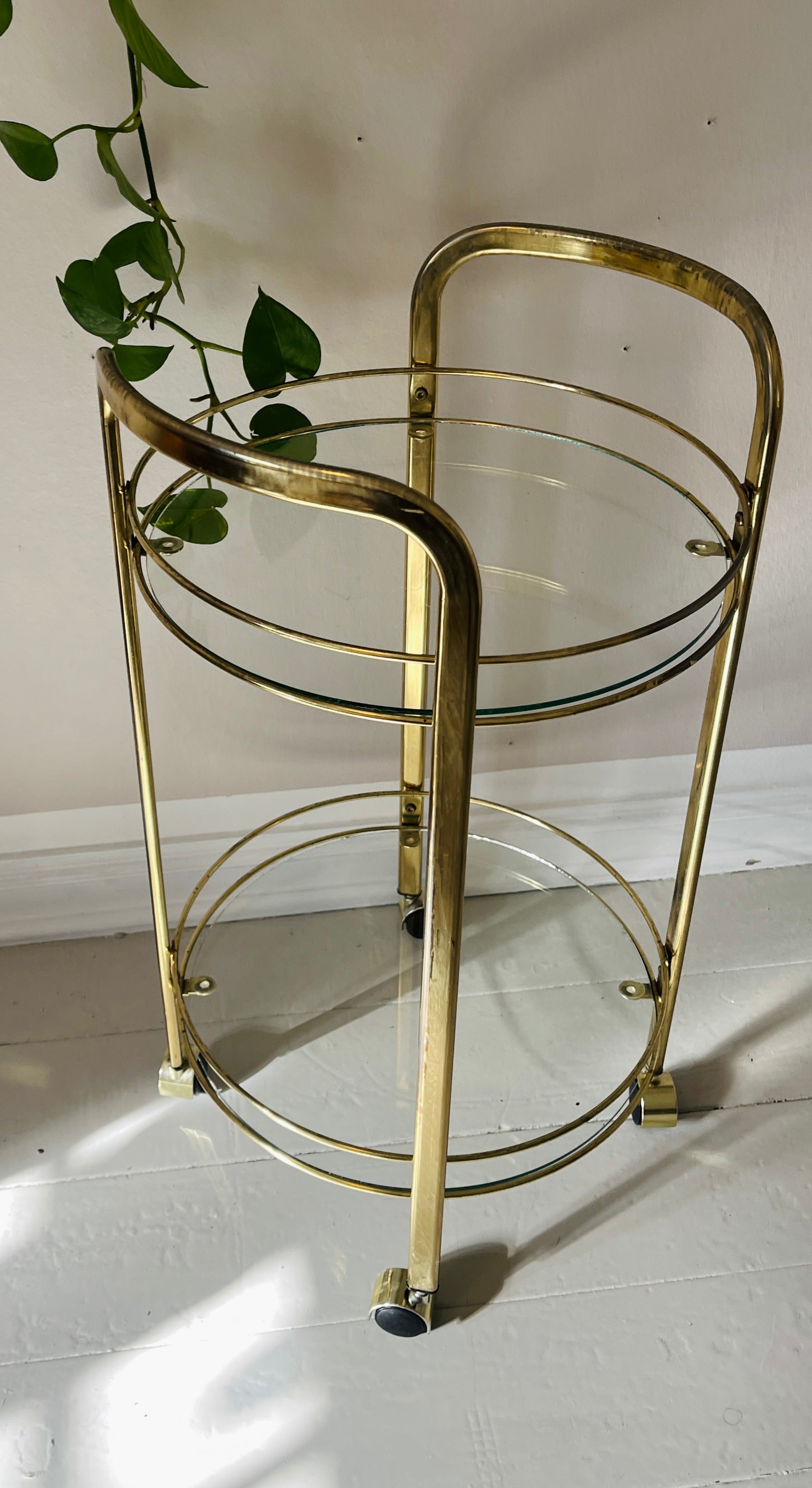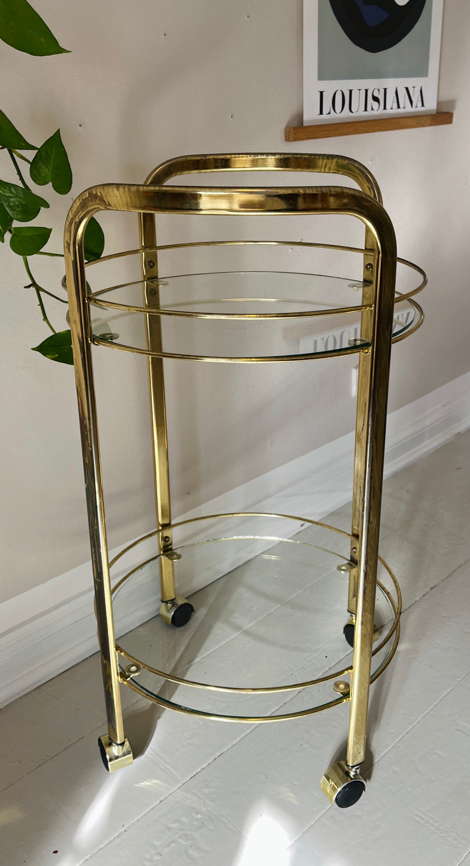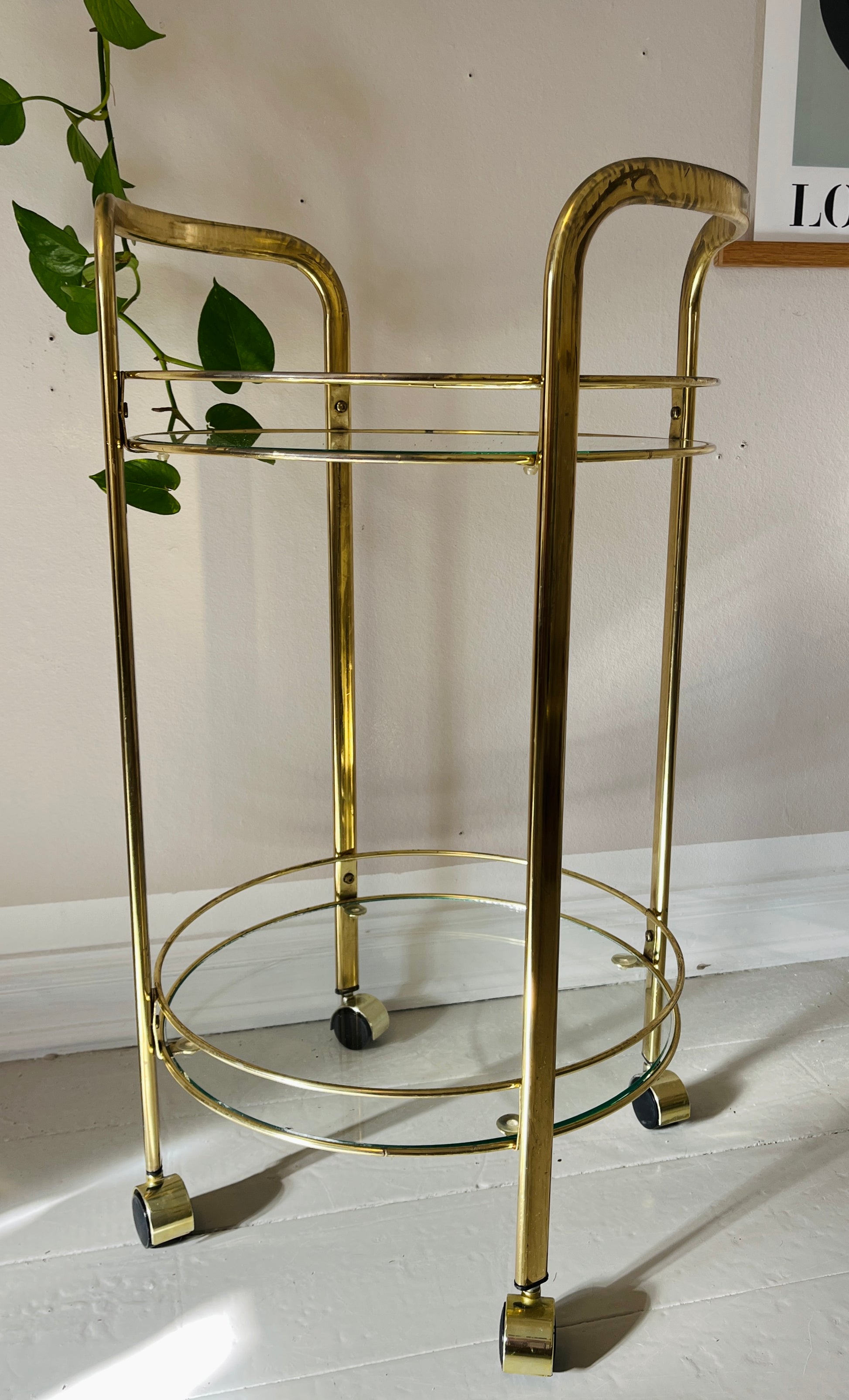 Smuk guldfarvet barvogn fra 1970erne/1980erne med to aftagelige glashylder. Stellet har fin patina, som giver et autentisk retro-look. Perfekt som cocktailvogn, sofabord eller sidebord.