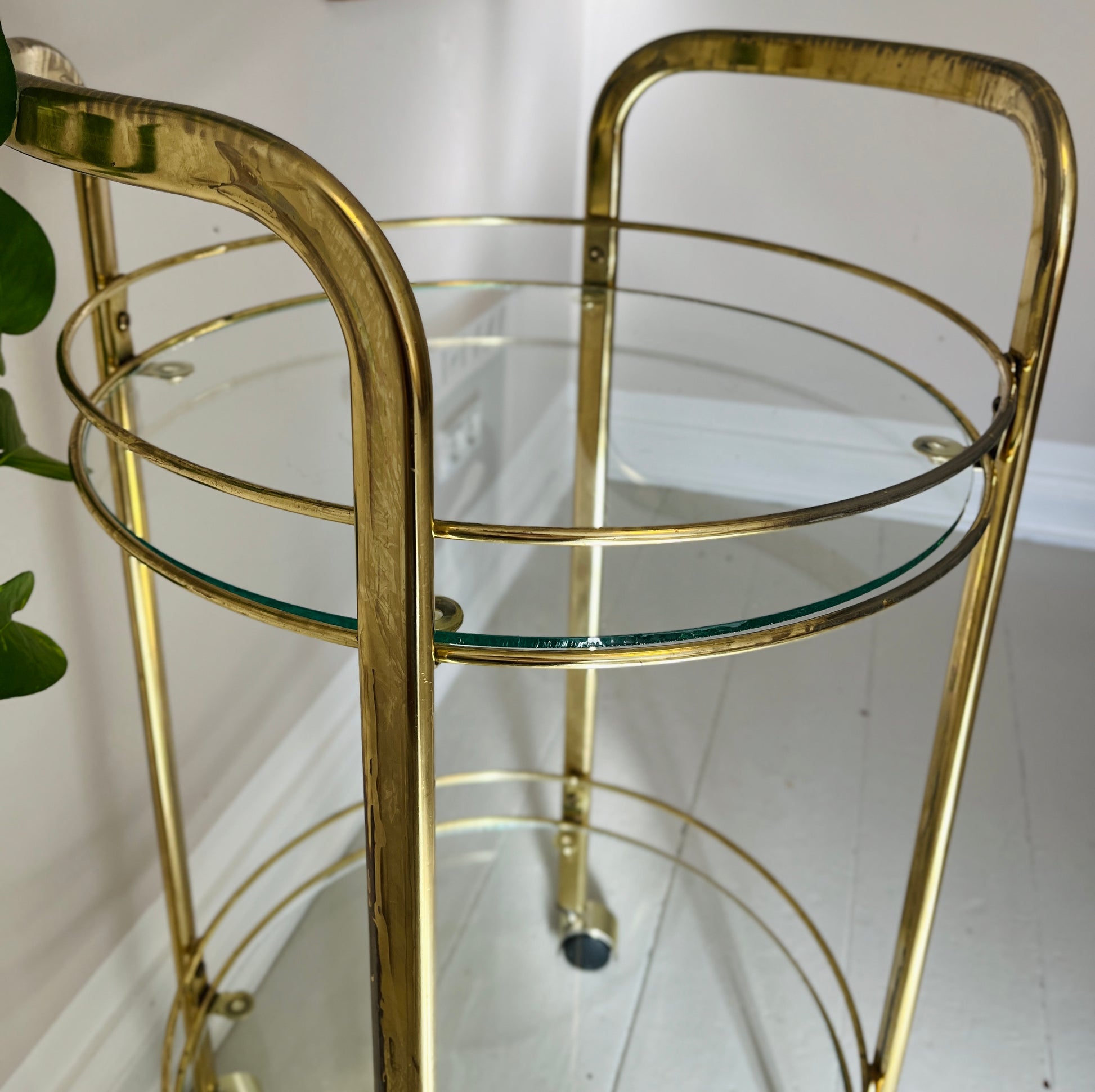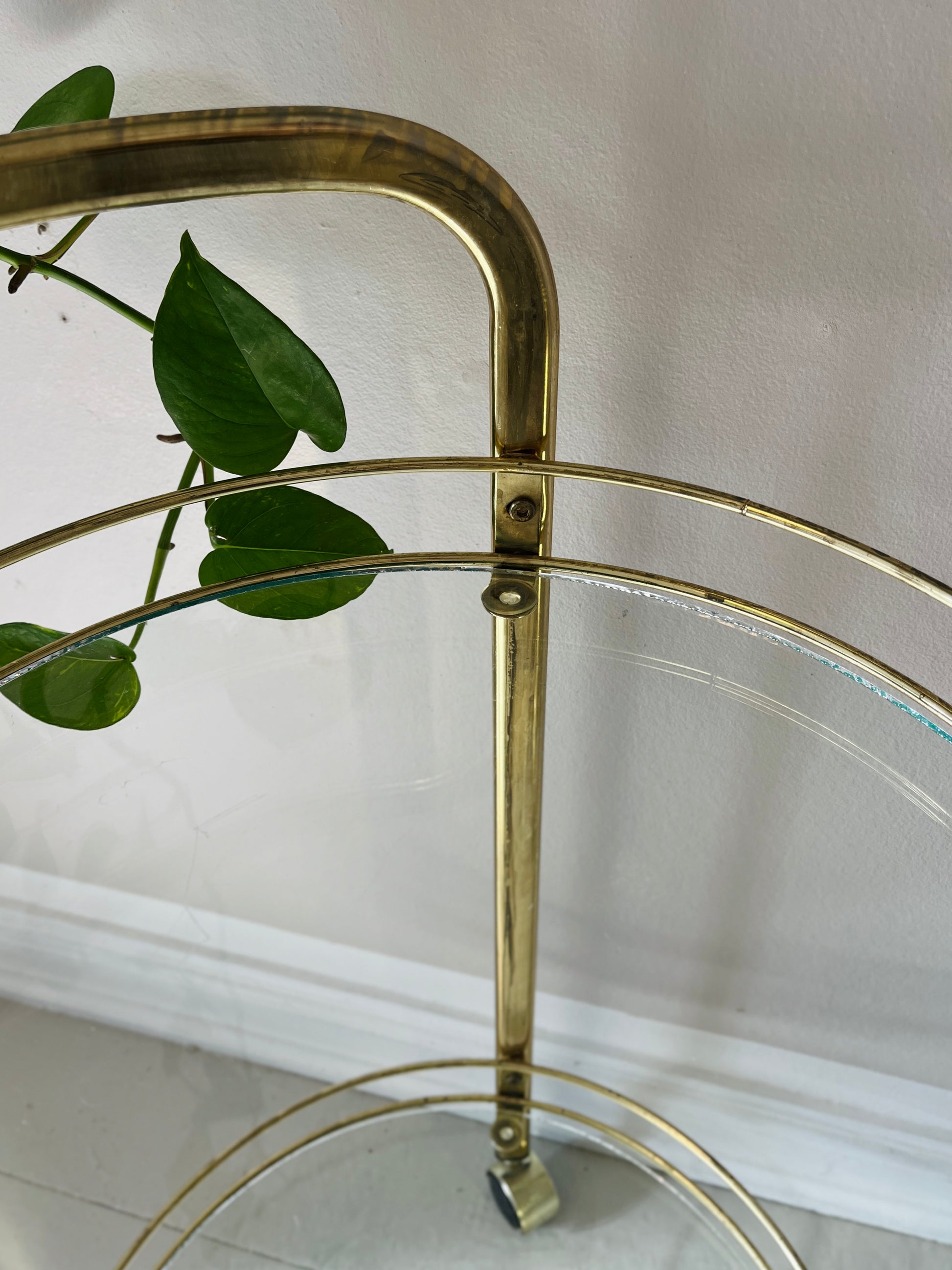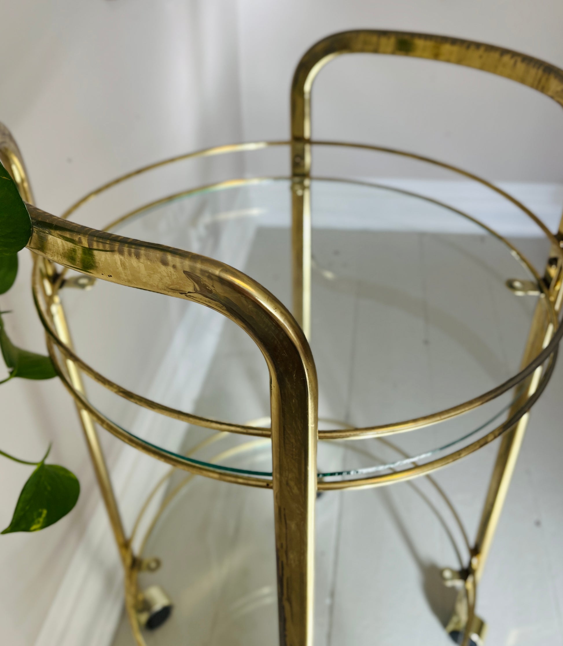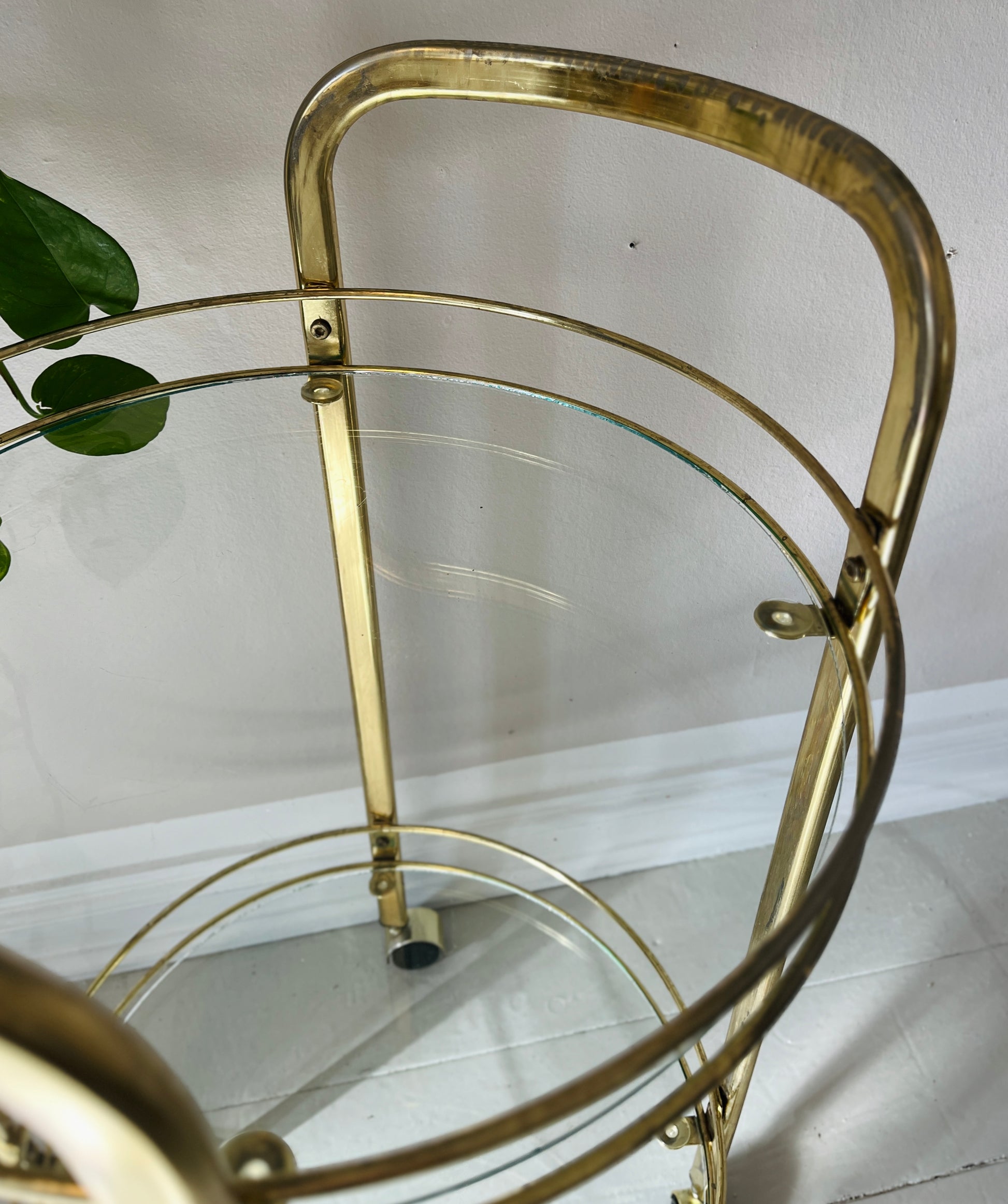 Smuk guldfarvet barvogn fra 1970erne/1980erne med to aftagelige glashylder. Stellet har fin patina, som giver et autentisk retro-look. Perfekt som cocktailvogn, sofabord eller sidebord.
