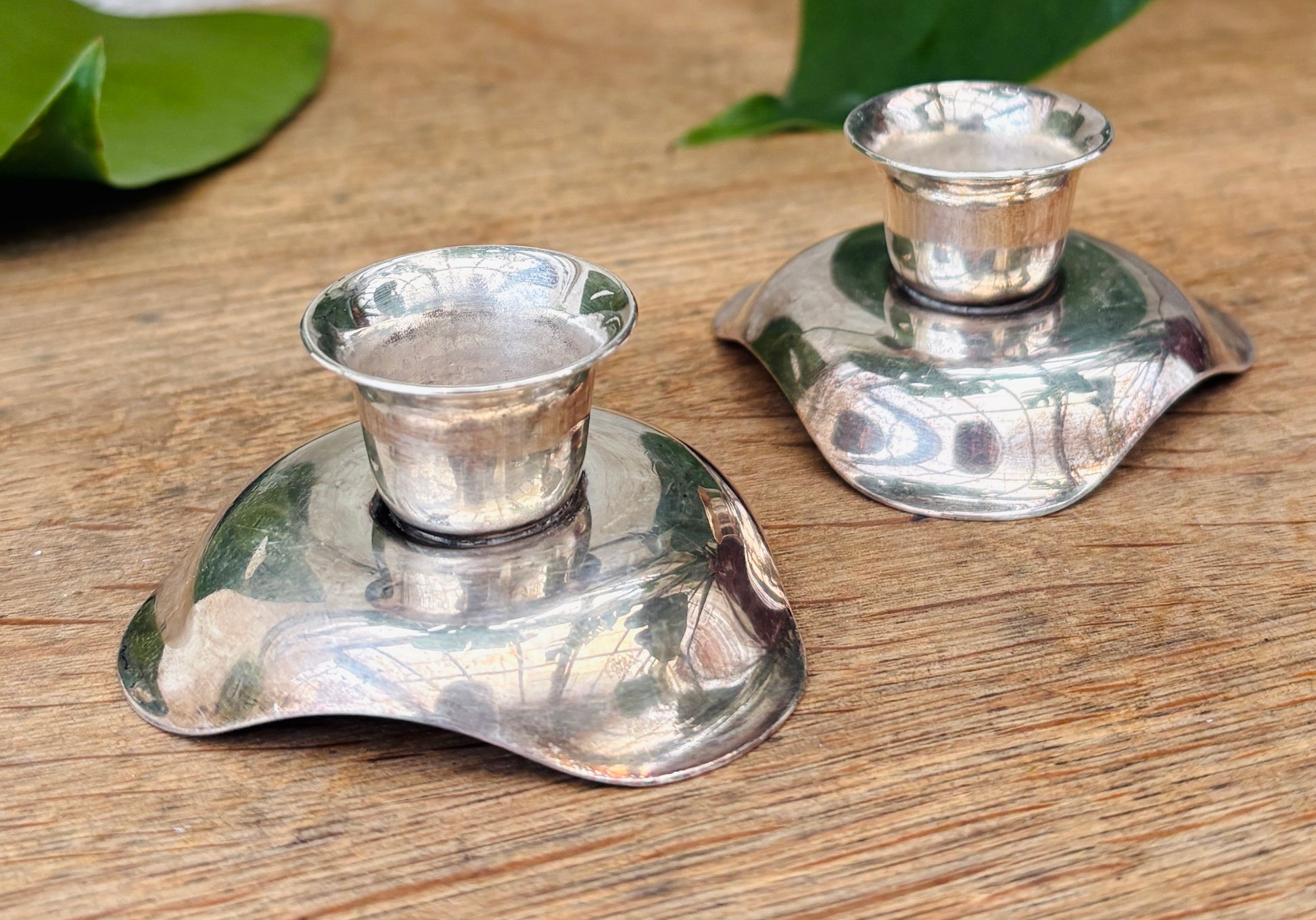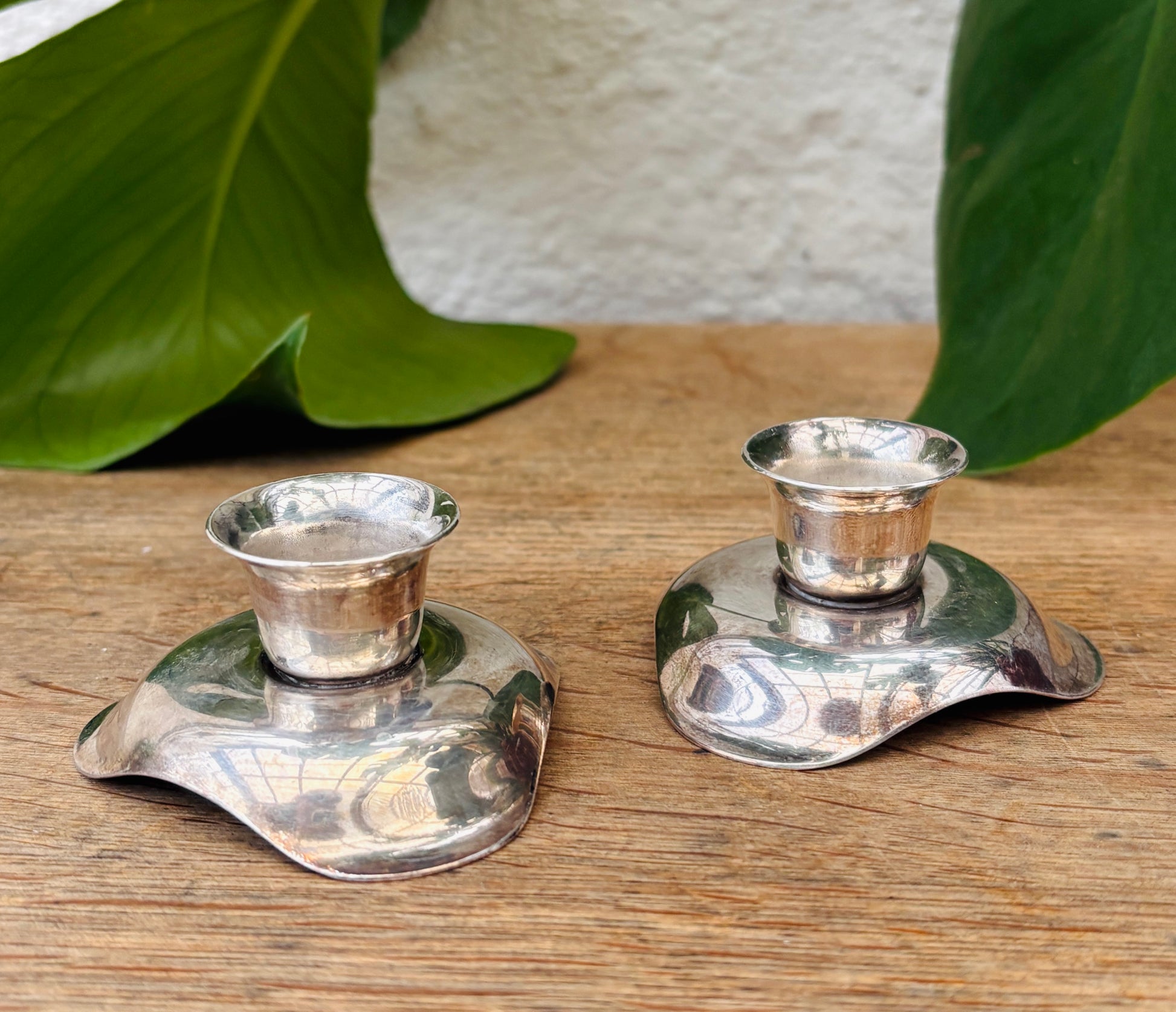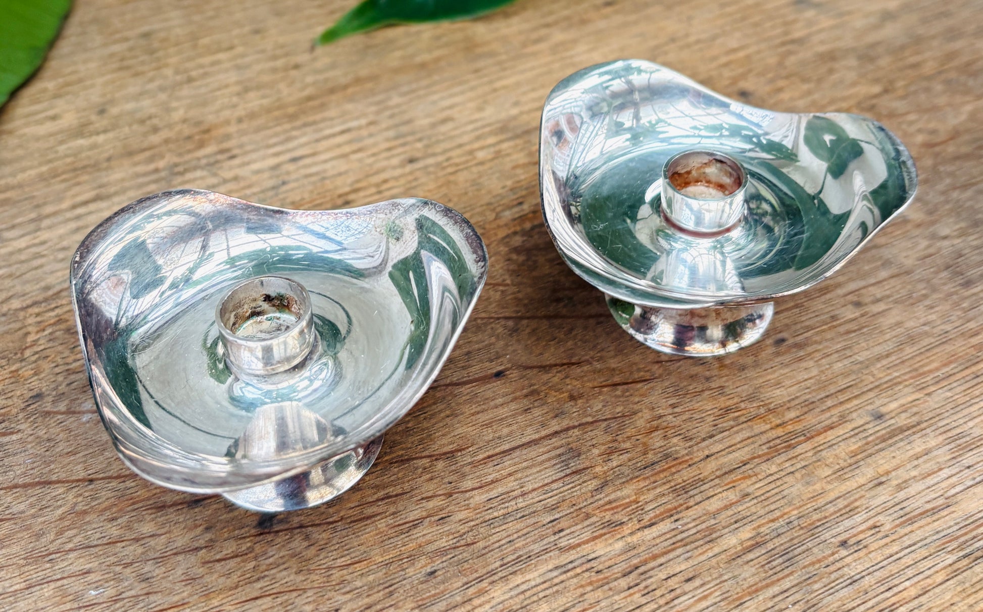 Smukt sæt vintage lysestager i patineret sølvplet fra Hans O. Hansen (HOH Denmark) fra 1950’erne-60’erne. De klassiske danske lysestager er vendbare og passer til både store og små lys.