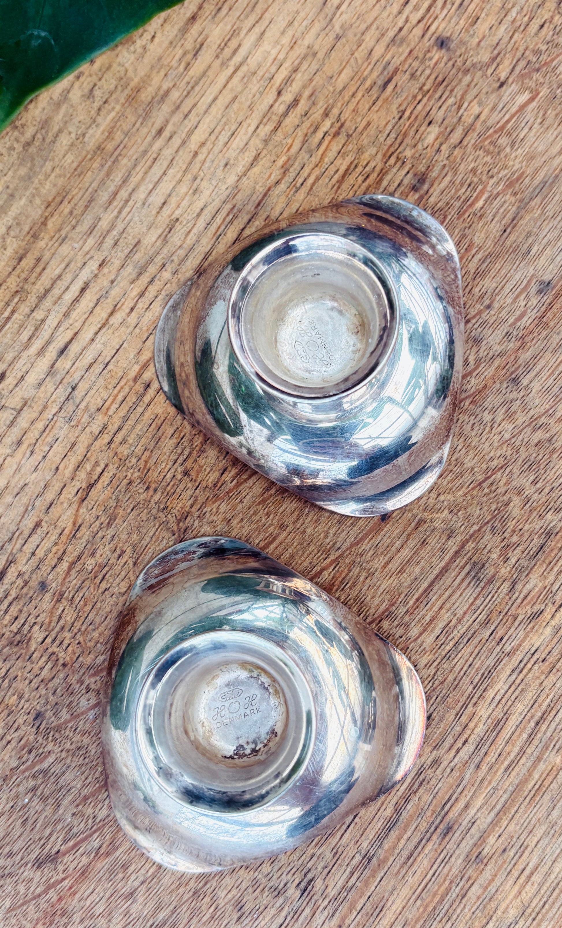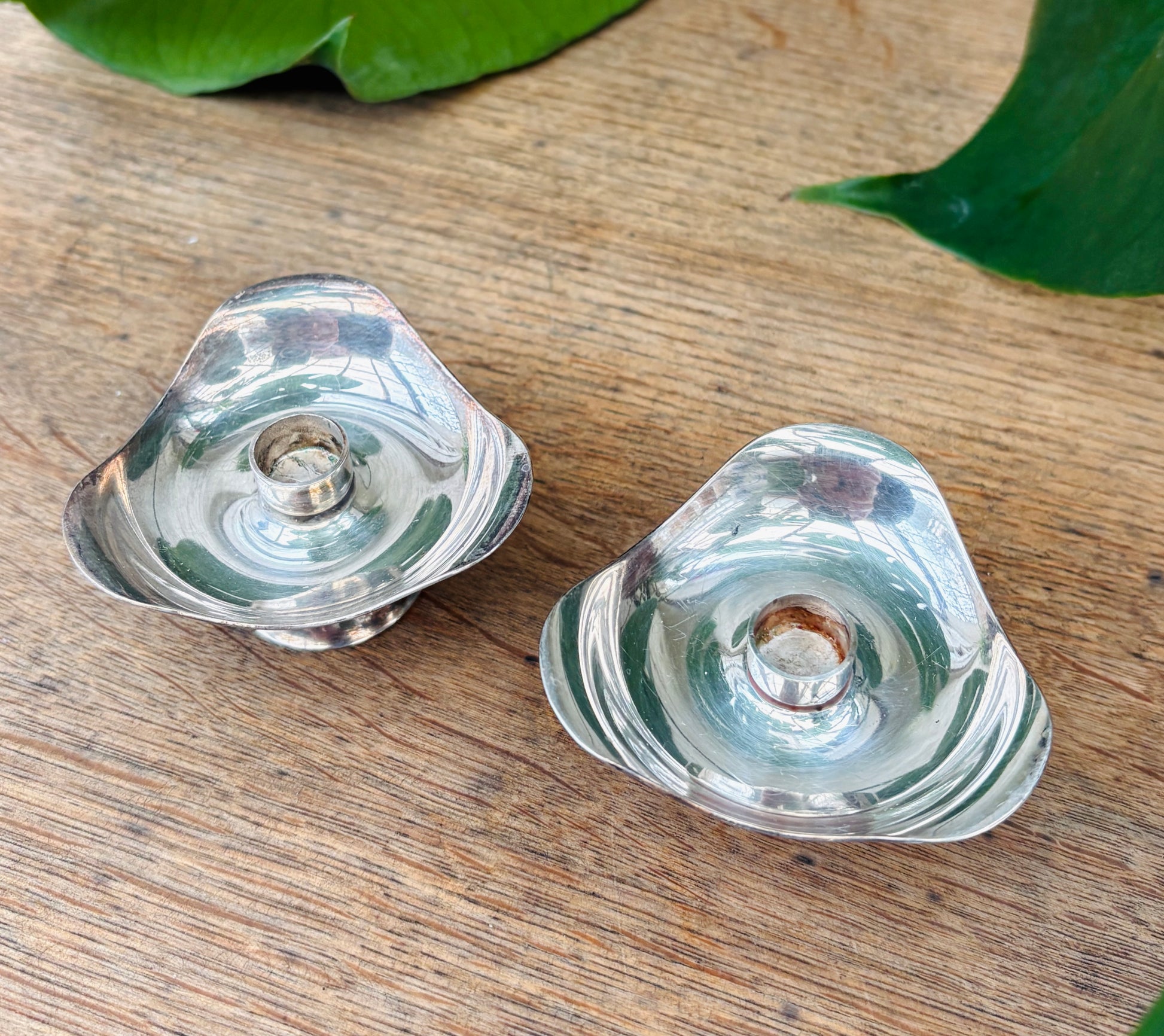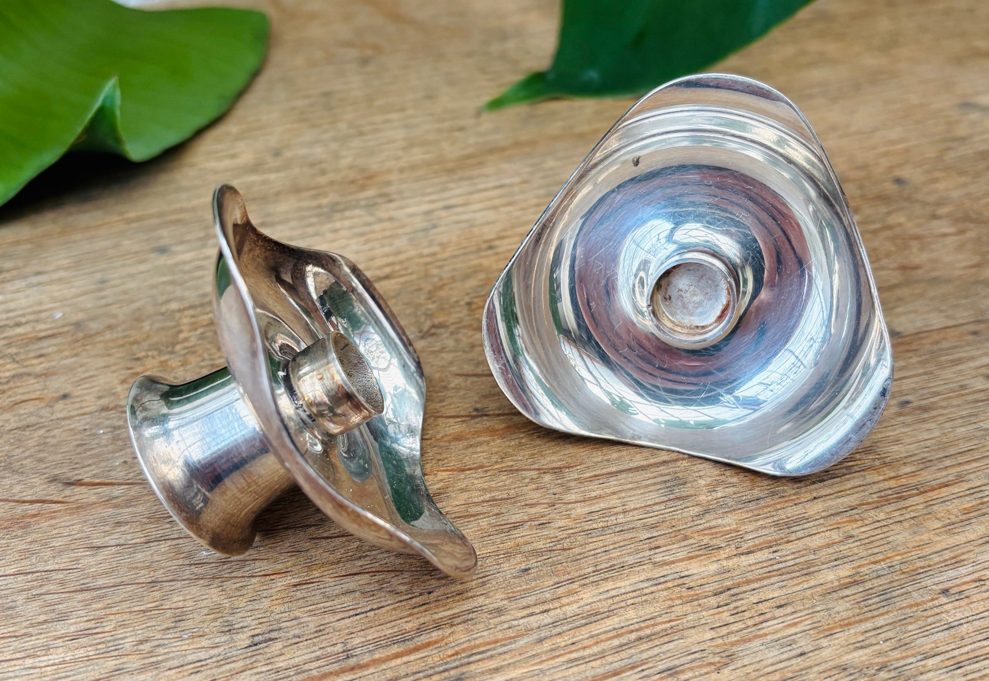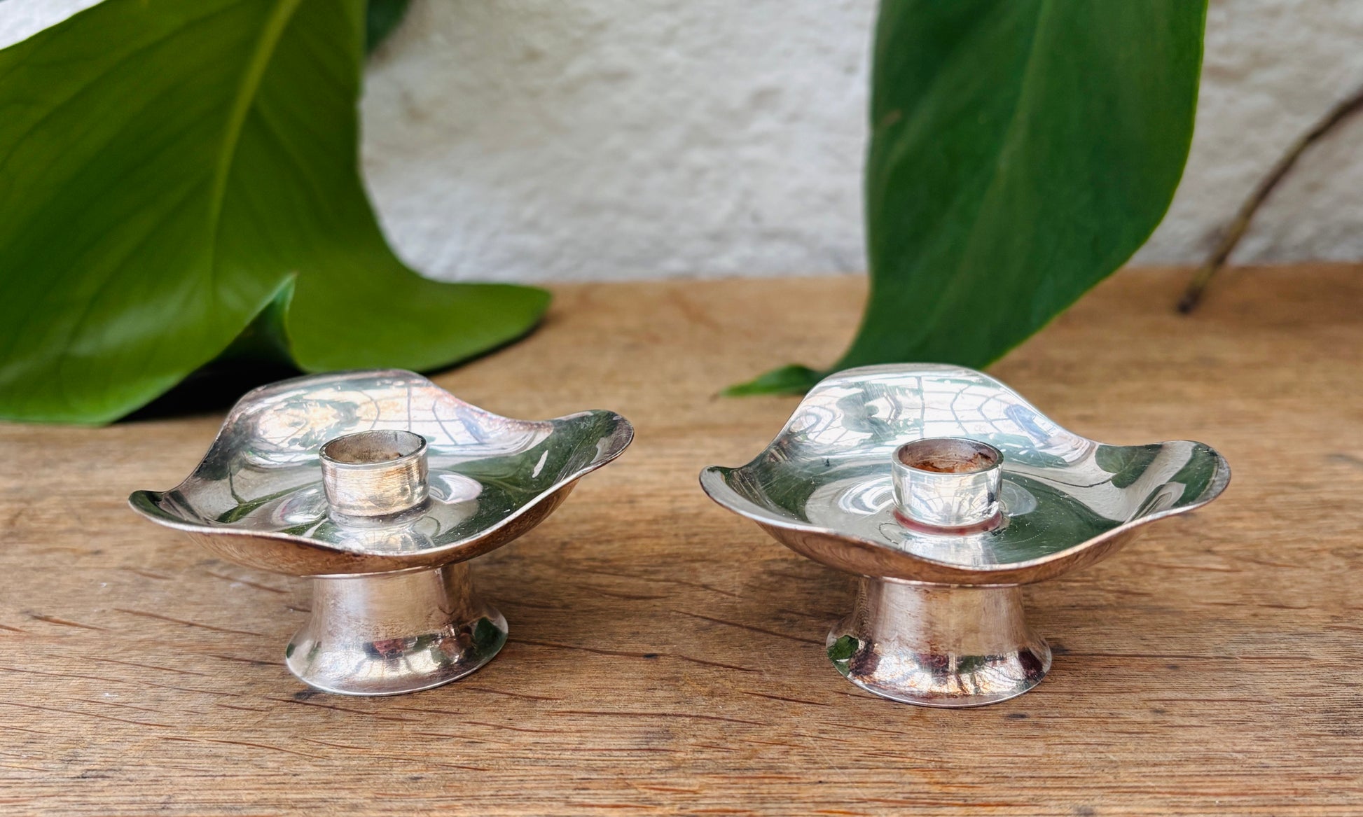 Smukt sæt vintage lysestager i patineret sølvplet fra Hans O. Hansen (HOH Denmark) fra 1950’erne-60’erne. De klassiske danske lysestager er vendbare og passer til både store og små lys.