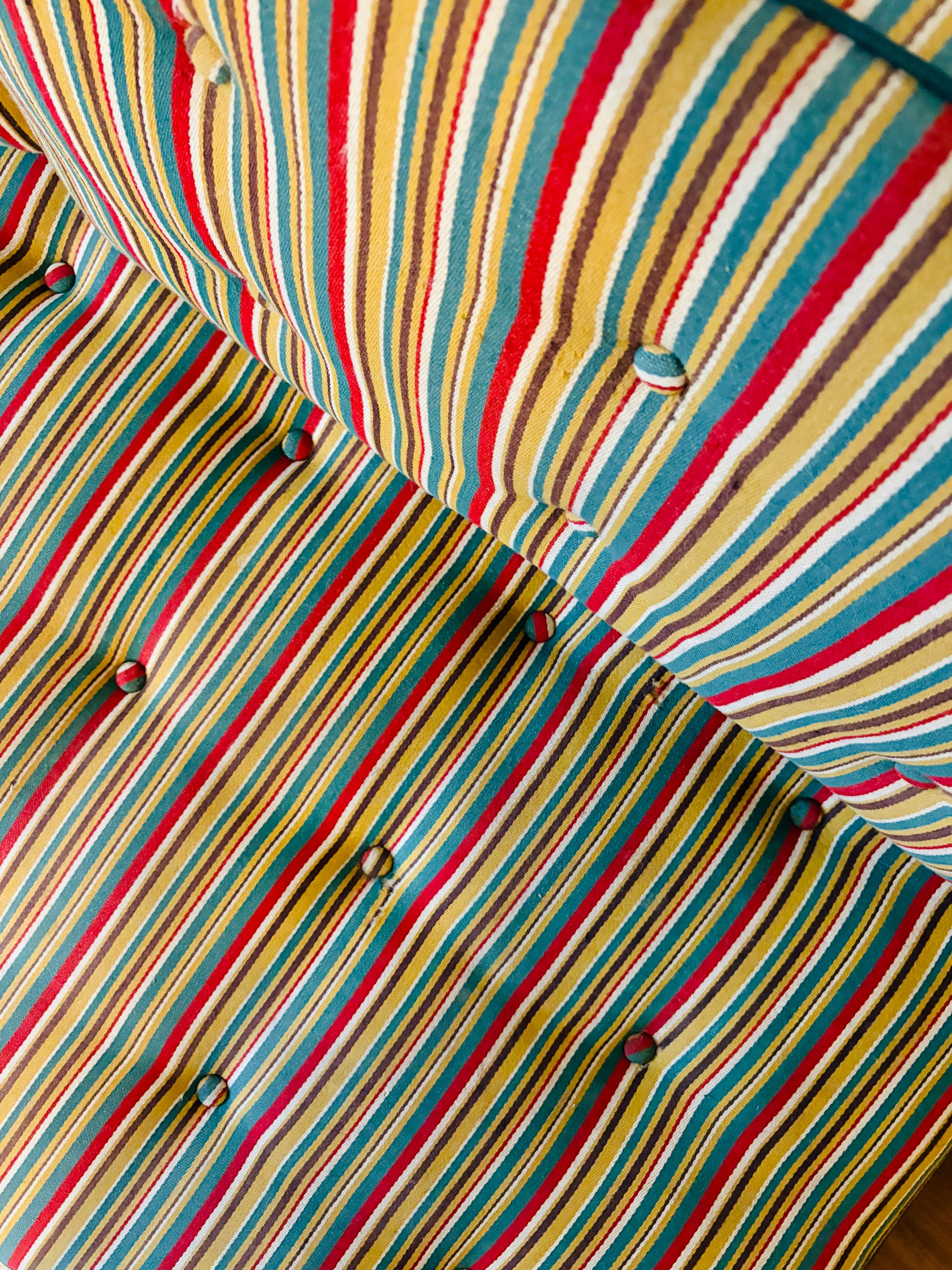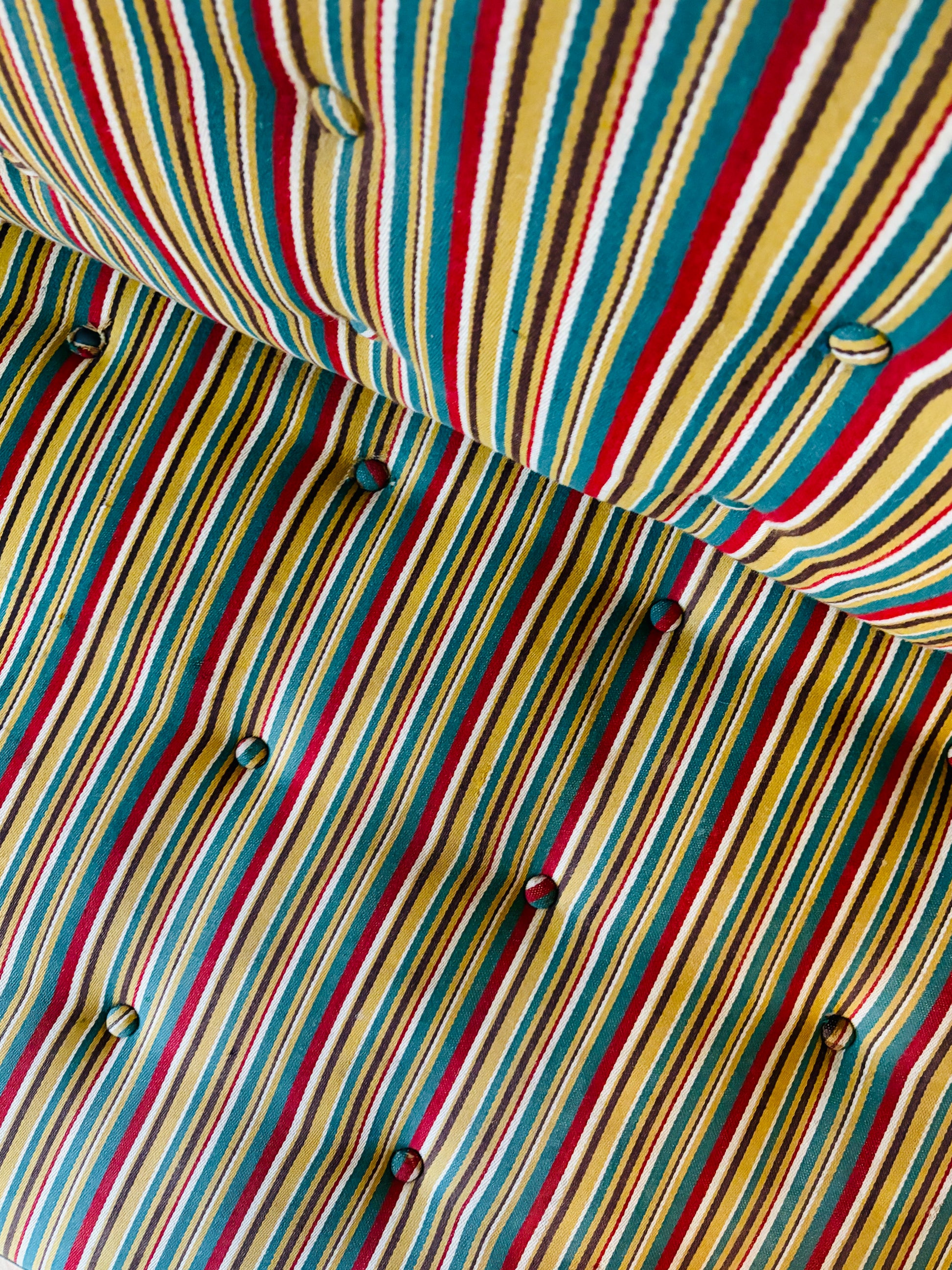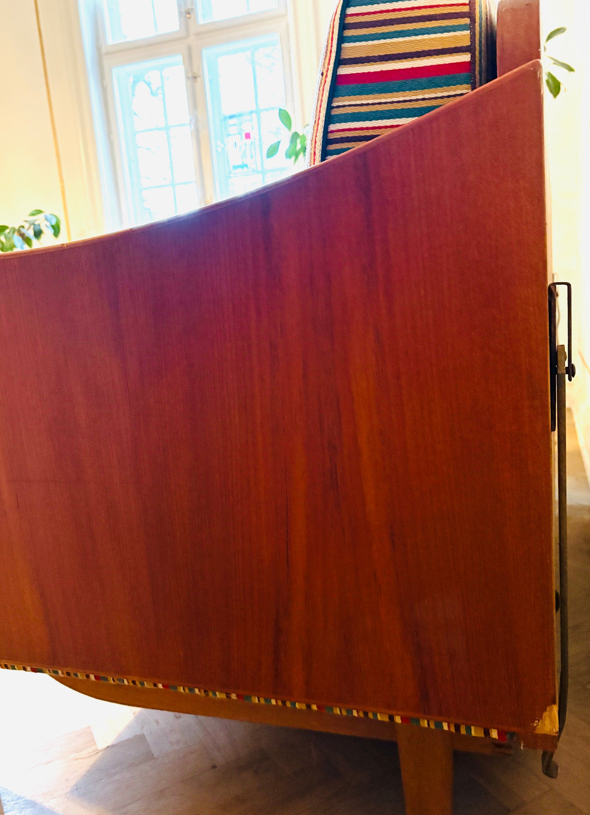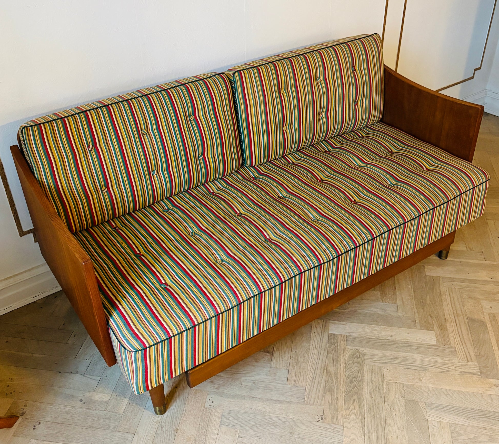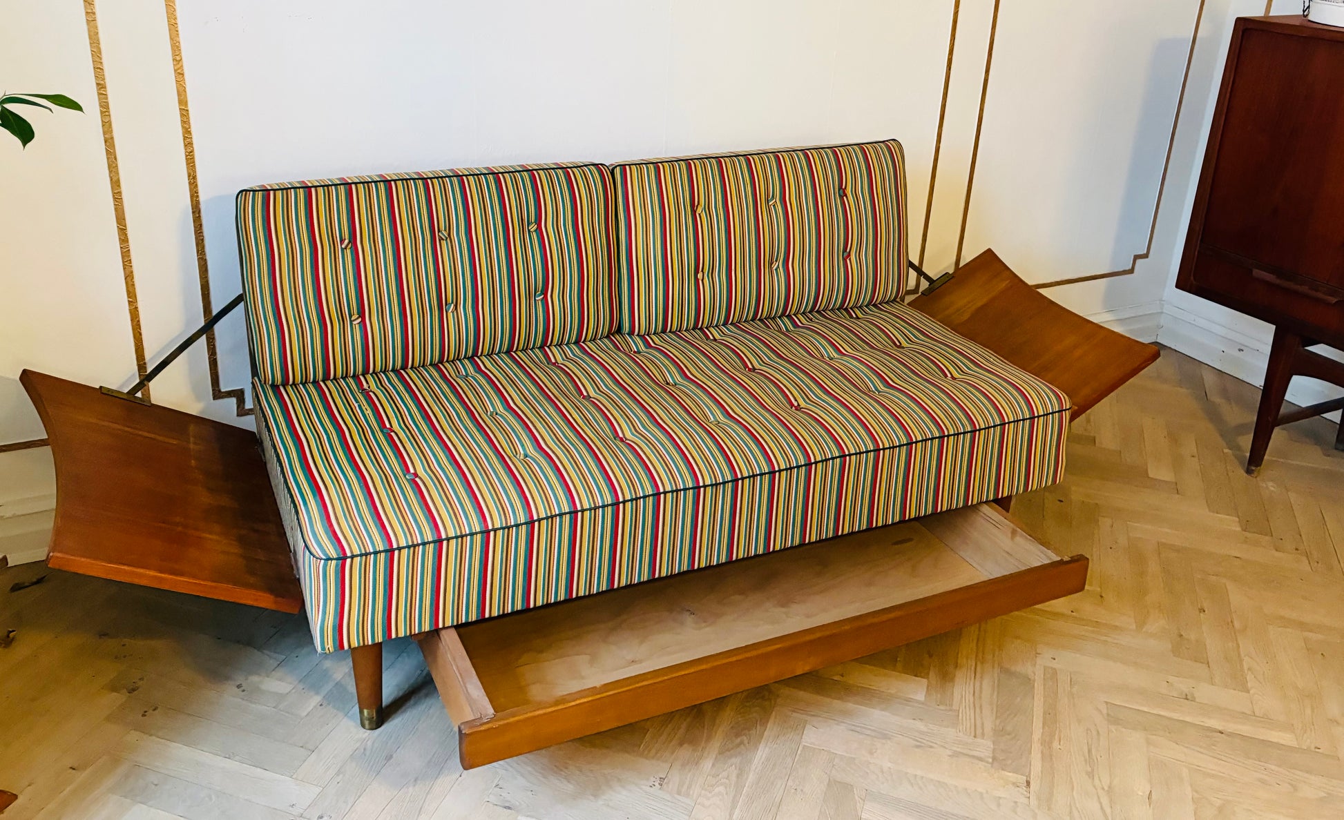 Mid-century (sove)sofa fra 1950erne/1960erne med stel i bejdset træ og sider i teak. Sofaen har et karakteristisk, stribet betræk og knapbetrukne hynder. De opklappelige sider kan foldes ud og giver ekstra plads i længden — en elegant og funktionel løsning, der gør sofaen velegnet som både sidde- og gæstemøbel.