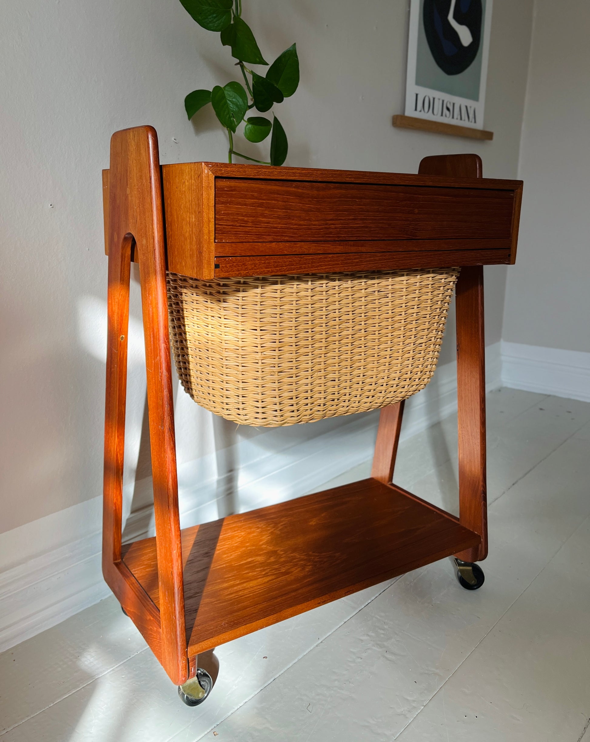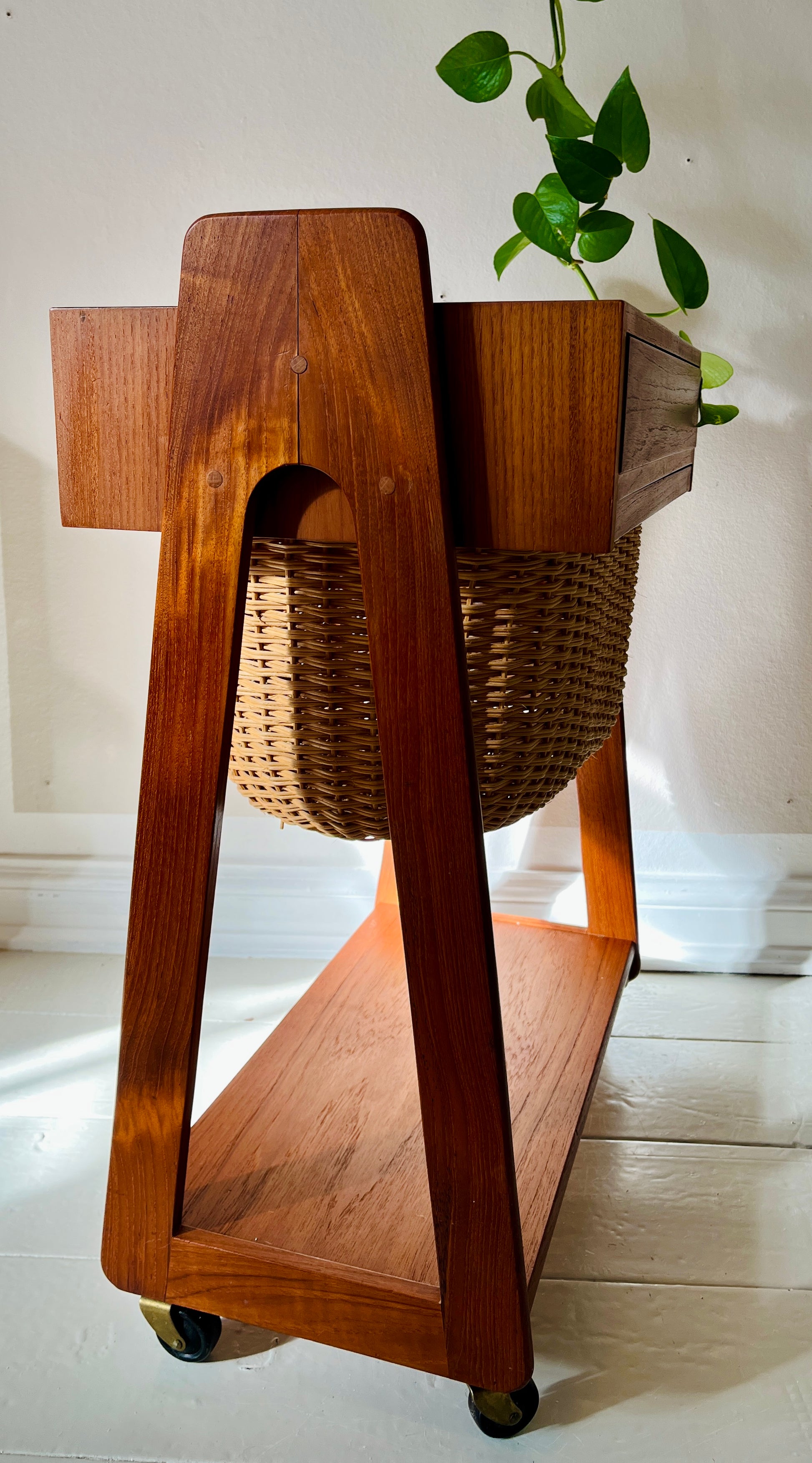 Smukt teak sybord i flot vintage stand med skuffe og indbygget kurv. Skuffen har ruminddeling, og både skuffe og kurv kan åbnes fra begge sider.